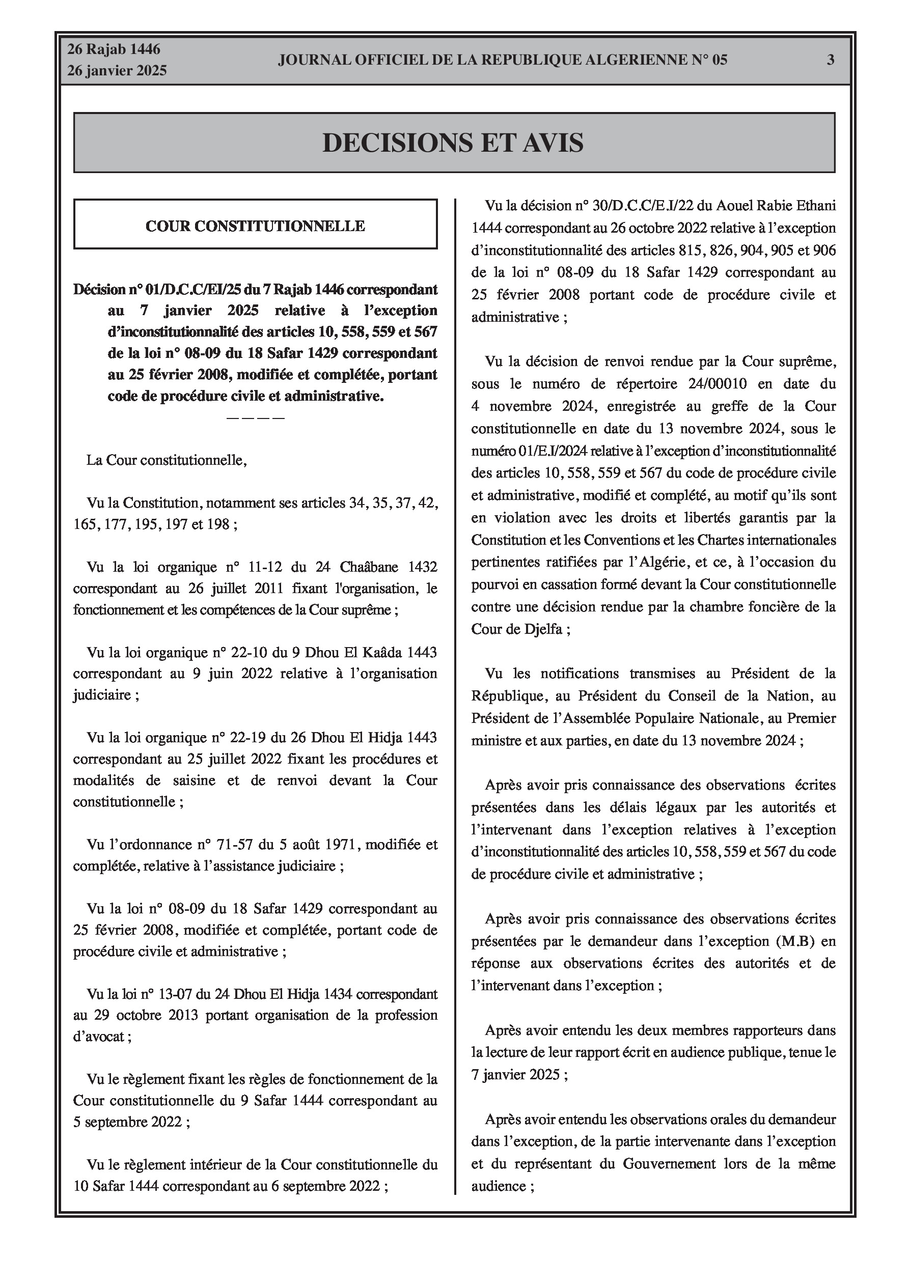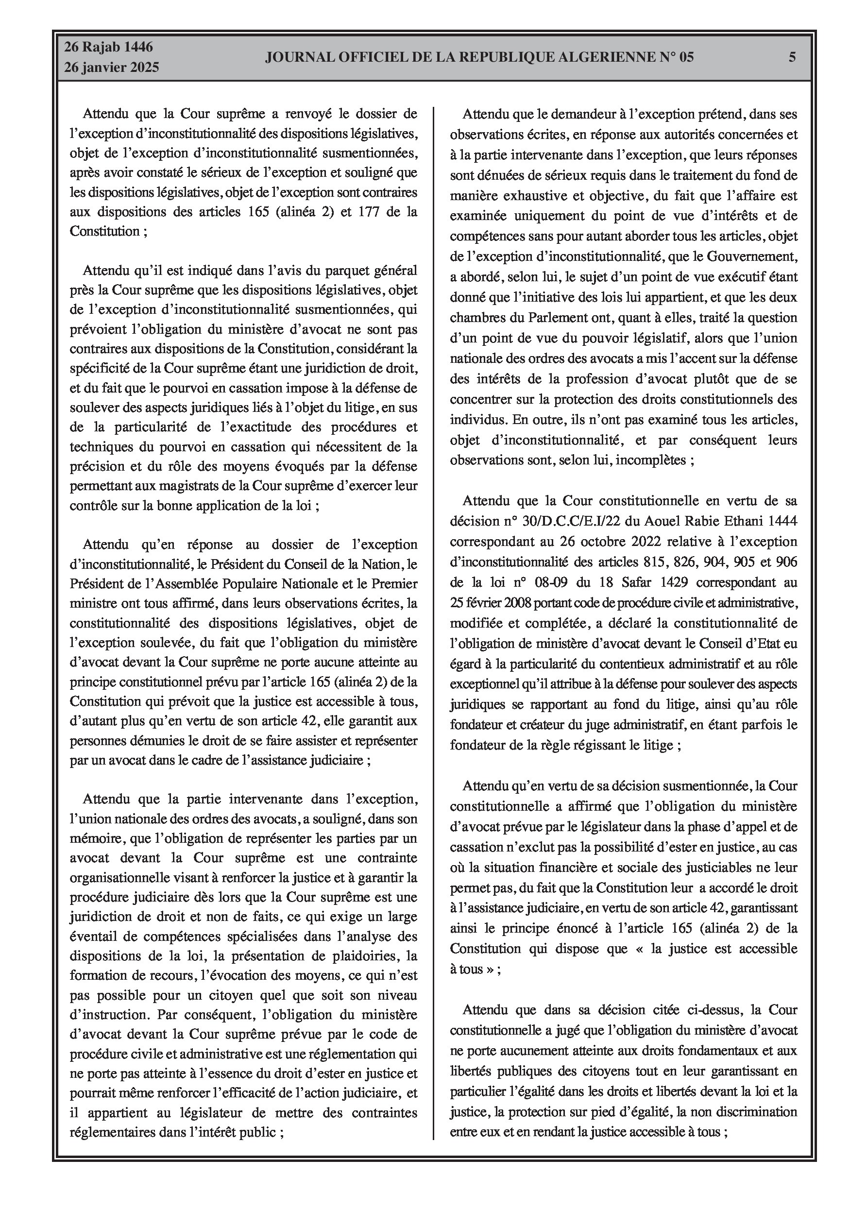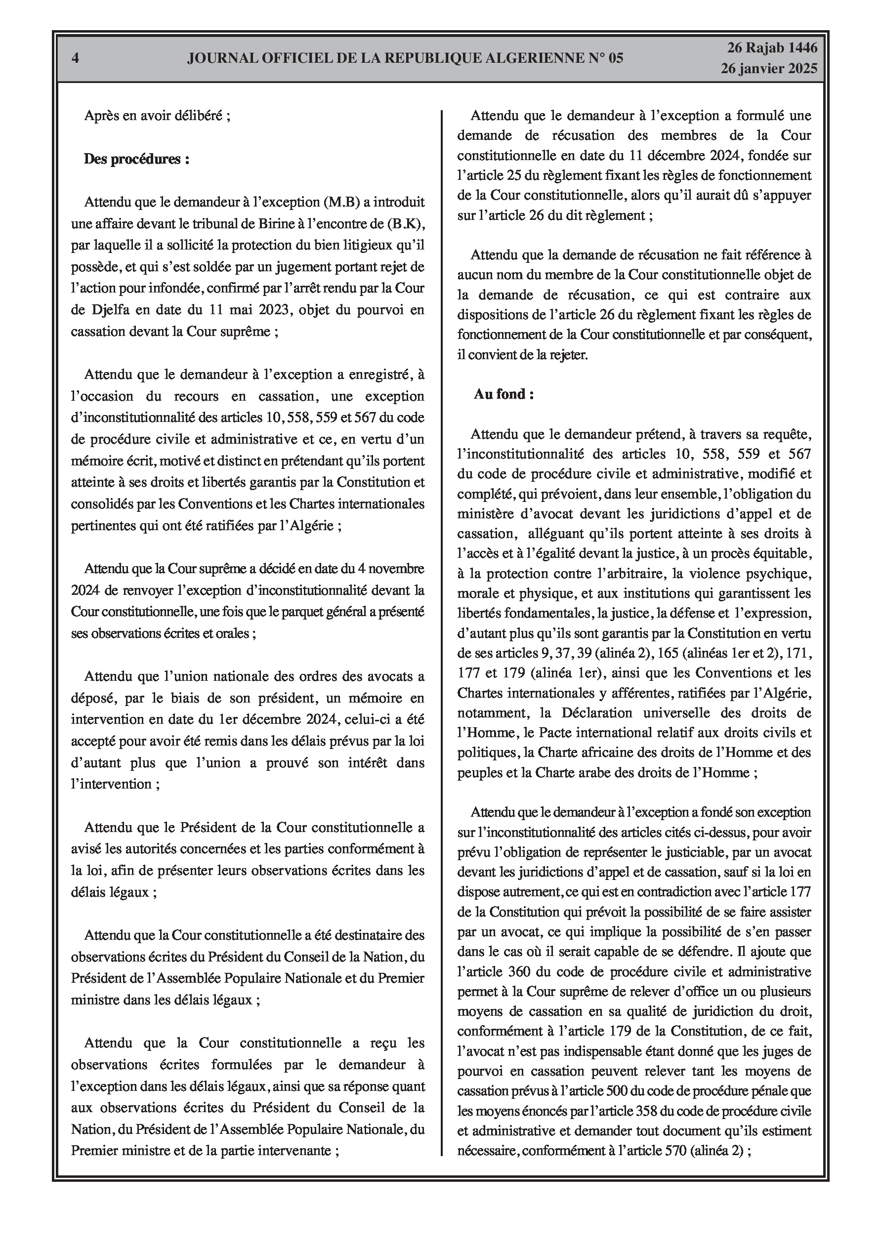 La Cour constitutionnelle s'est prononcée sur la constitutionnalité des articles 10, 558, 559 et 567 du code de procédure civile et administrative relatifs à l'obligation de représentation par avocat devant les cours d'appel et de cassation, confirmant leur constitutionnalité. Un rectificatif à un avis antérieur a également été publié, clarifiant les conditions de candidature ou de désignation aux deux chambres du Parlement en vertu de l'article 122 de la Constitution, modifiant le texte en "nul ne peut se porter candidat ou être désigné à l'une des deux chambres du Parlement...".