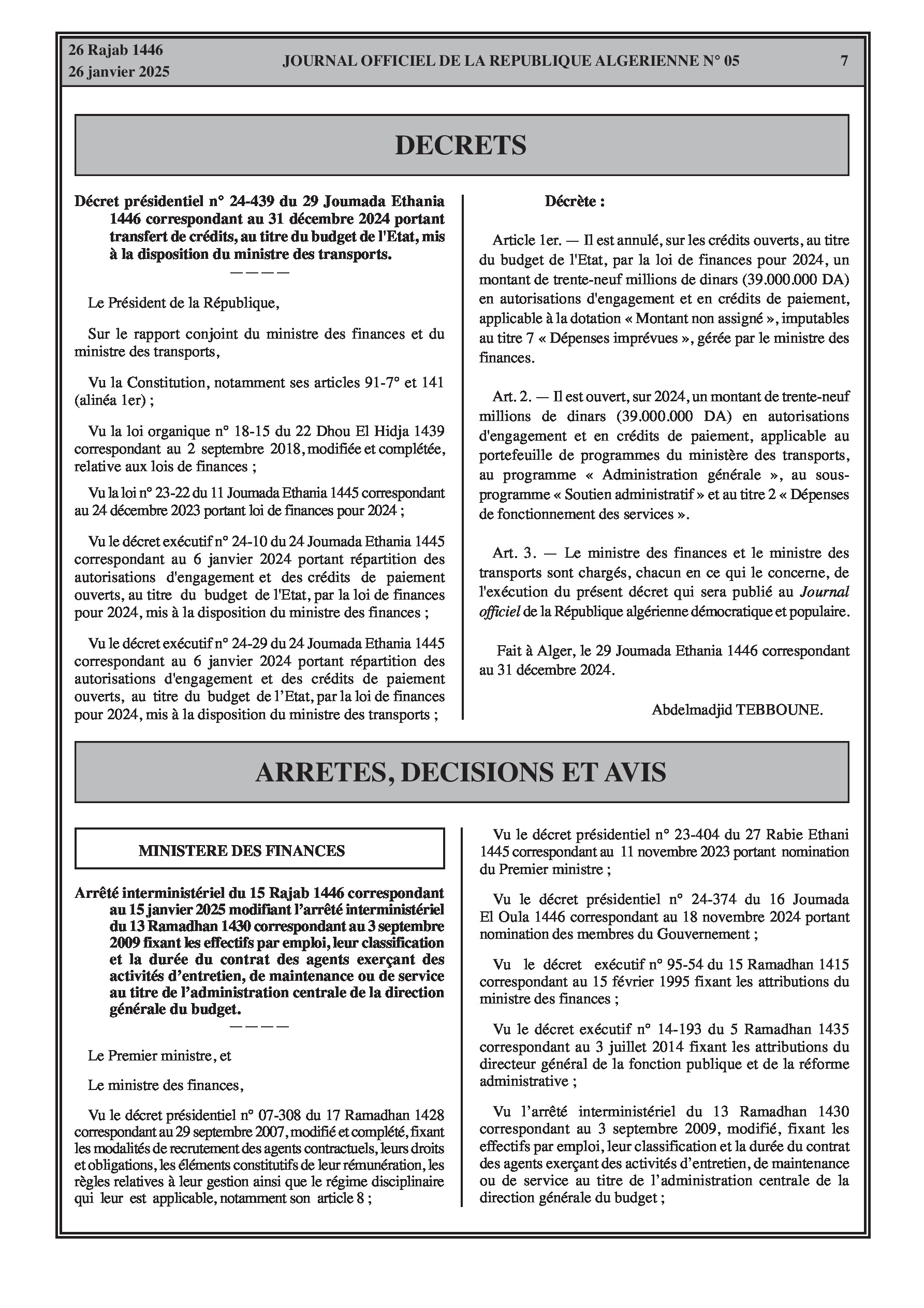 Le décret présidentiel n° 24-439 du 31 décembre 2024 annule des crédits d'un montant de 39 millions de dinars algériens des "Dépenses imprévues" du budget de l'État pour 2024 et les transfère au portefeuille de programmes du ministère des Transports, pour couvrir les "Dépenses de fonctionnement des services" au sein du programme "Administration générale" et du sous-programme "Soutien administratif".