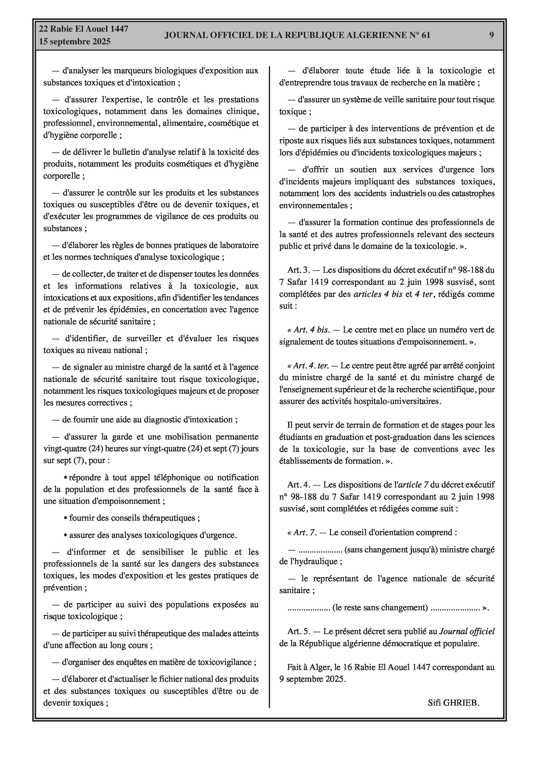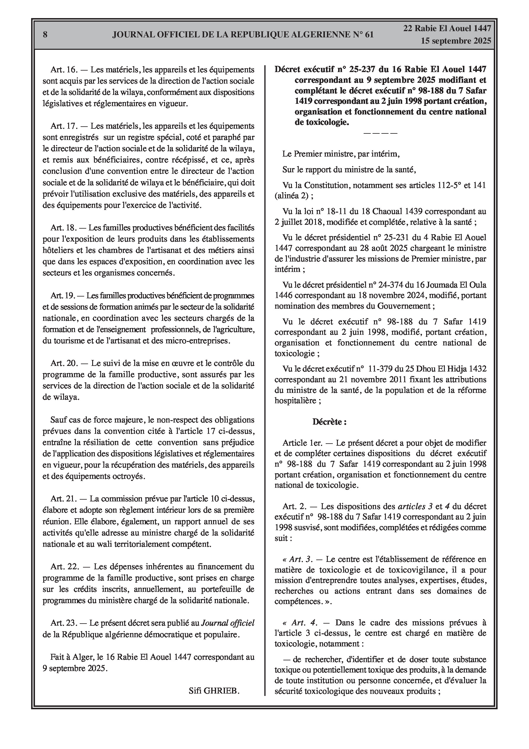 - Décret présidentiel n° 25-240 nommant M. Sifi GHRIEB Premier ministre.