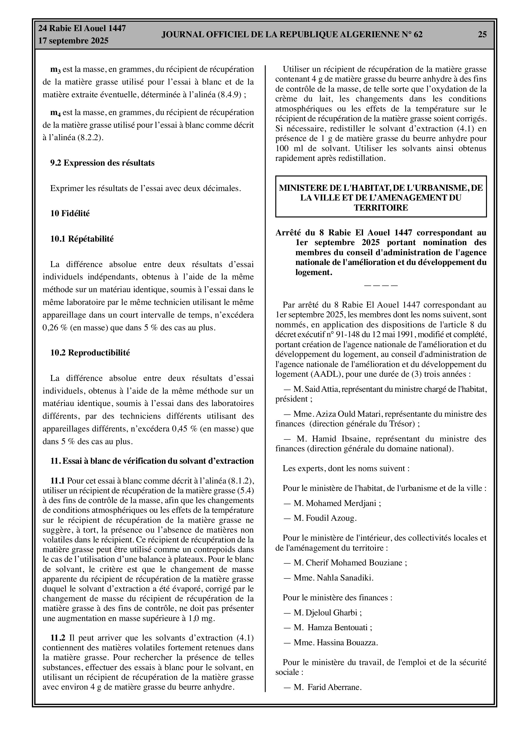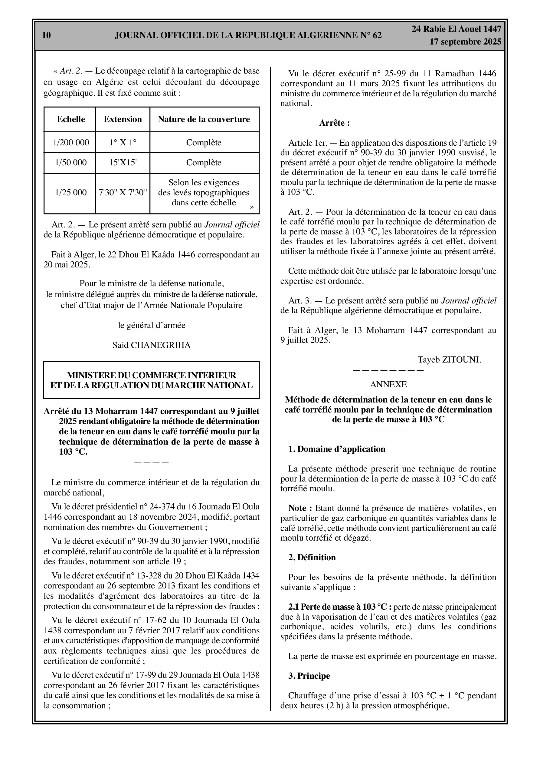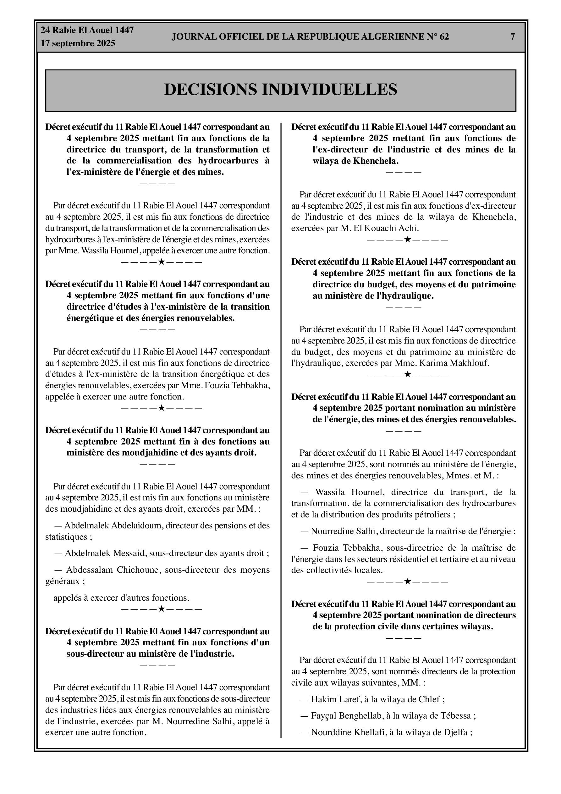 Le Journal Officiel inclut une série de décrets exécutifs relatifs à des fins de fonctions et des nominations de hauts responsables dans plusieurs secteurs ministériels et administrations locales, notamment l'Energie et les Mines, les Moudjahidine, l'Industrie, la Protection civile, et l'Agriculture.