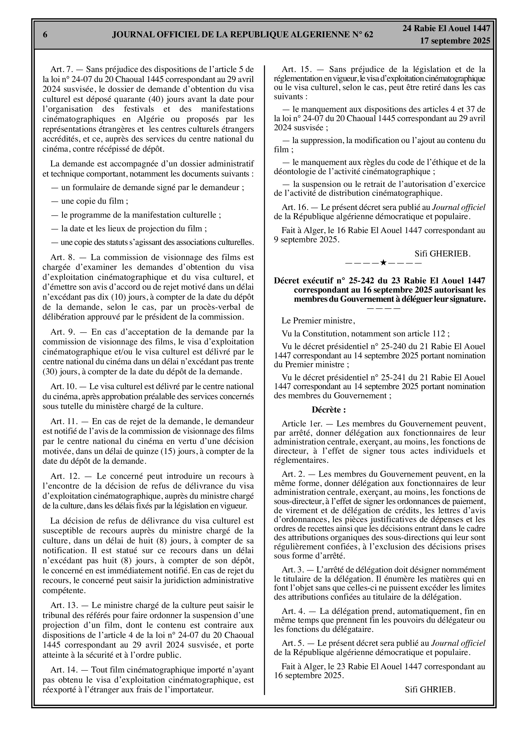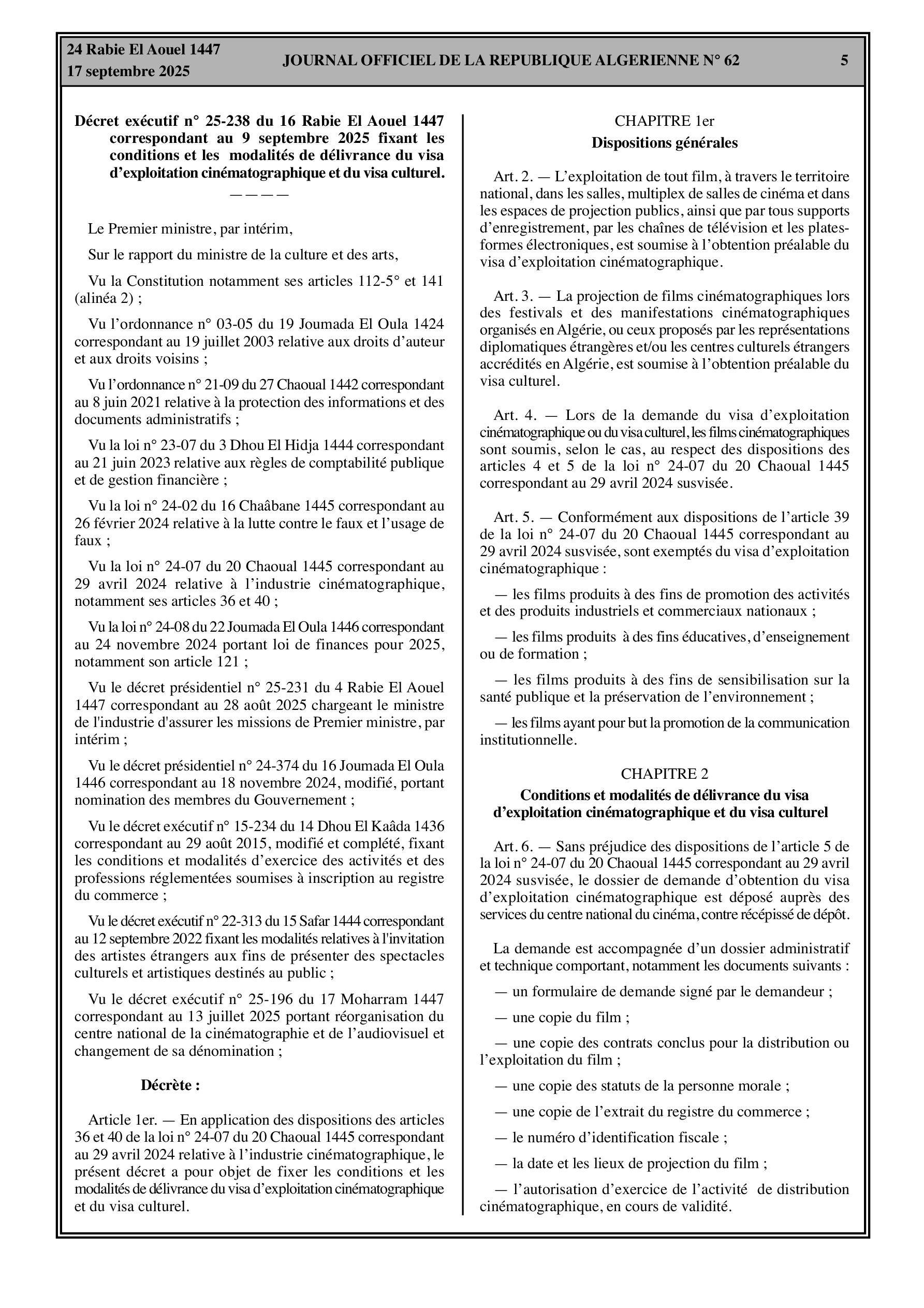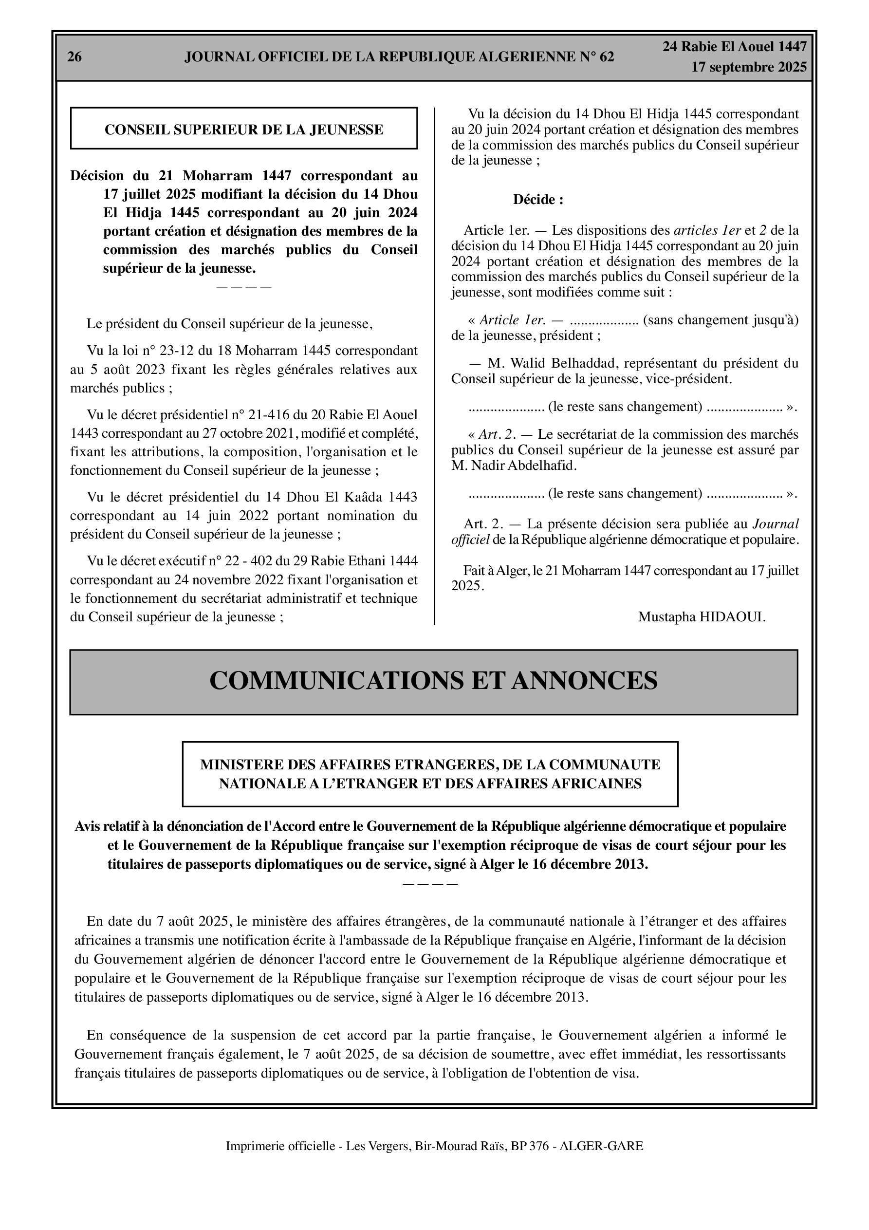 Des changements importants affectent les relations extérieures et le secteur culturel. Le gouvernement algérien dénonce l'accord d'exemption de visa de court séjour avec la France pour les détenteurs de passeports diplomatiques et de service. Dans le domaine culturel, un décret fixe les conditions de délivrance du visa d'exploitation cinématographique et du visa culturel.
