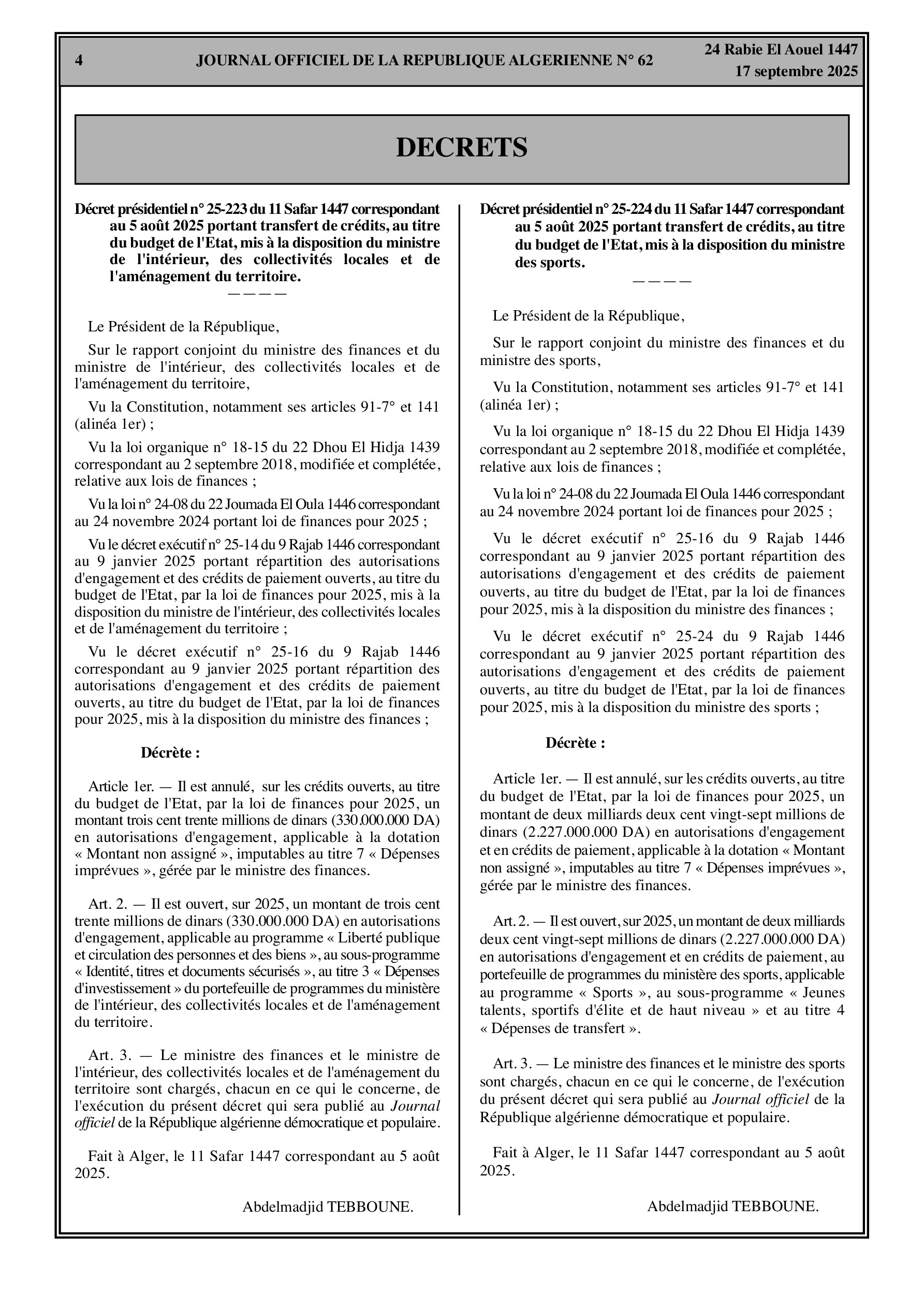 Des décrets présidentiels portent sur le transfert de crédits budgétaires au profit des ministères de l'Intérieur et des Sports. Un décret exécutif autorise également les membres du Gouvernement à déléguer leur signature aux fonctionnaires de leur administration centrale.