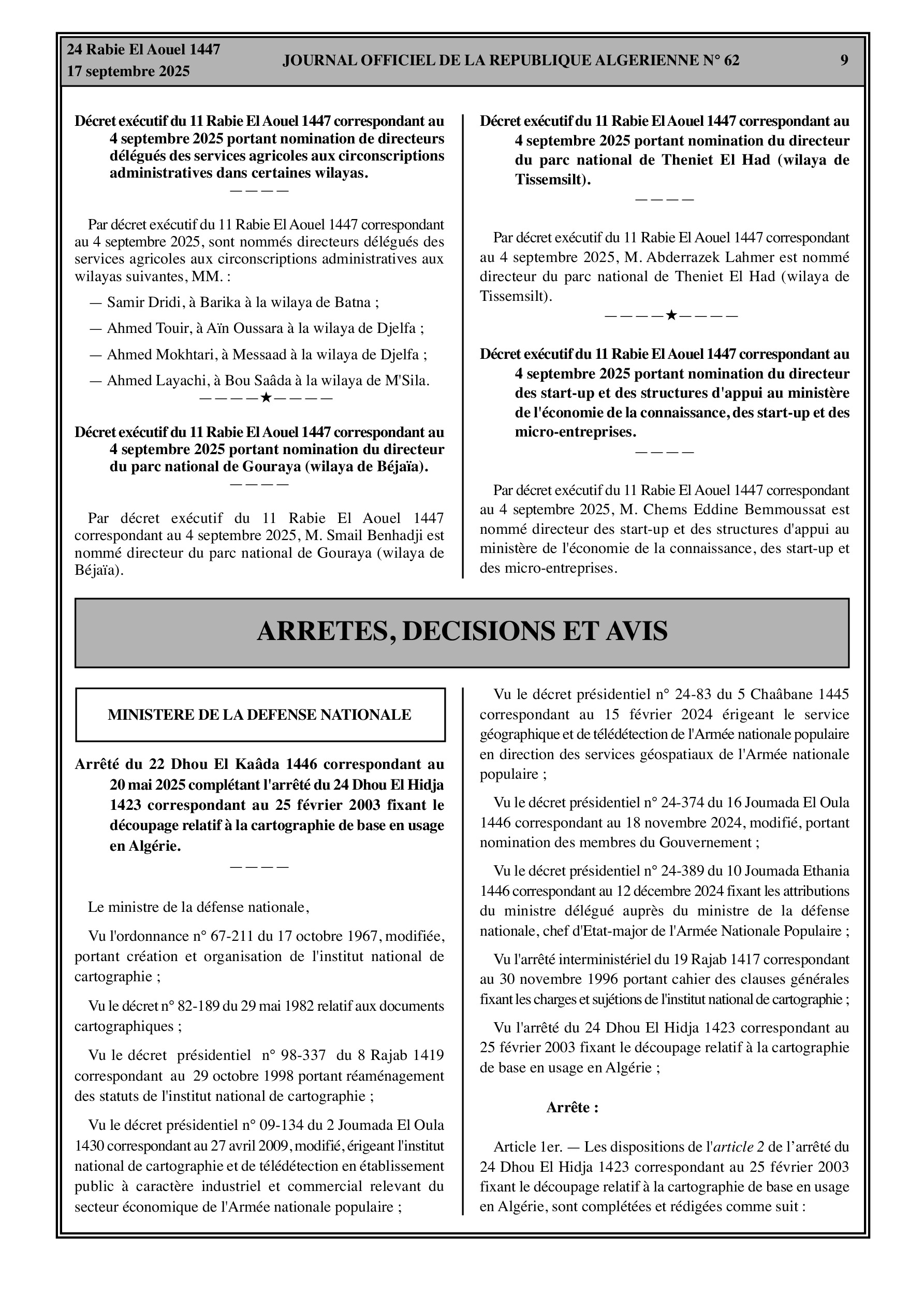 - Nomination de nouveaux directeurs de la protection civile et de directeurs délégués des services agricoles dans plusieurs wilayas.