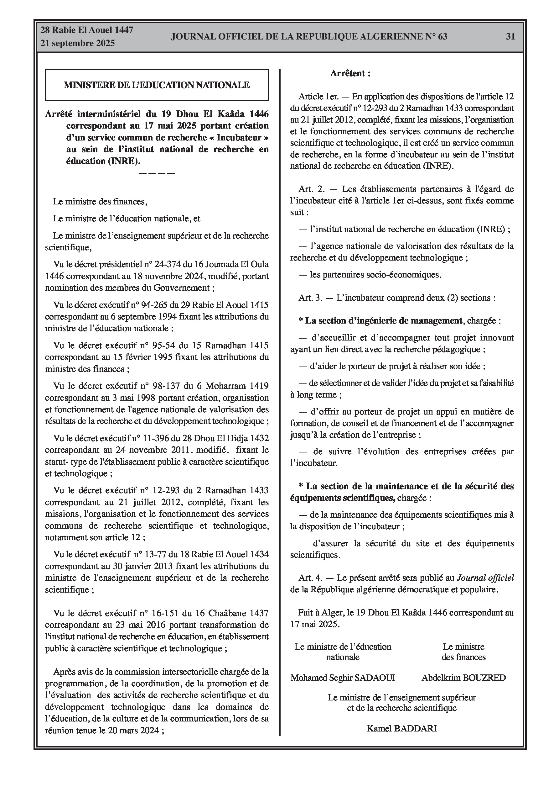 Un service commun de recherche sous forme d'« incubateur » est créé au sein de l'Institut National de Recherche en Éducation (INRE) pour soutenir les projets pédagogiques innovants.
