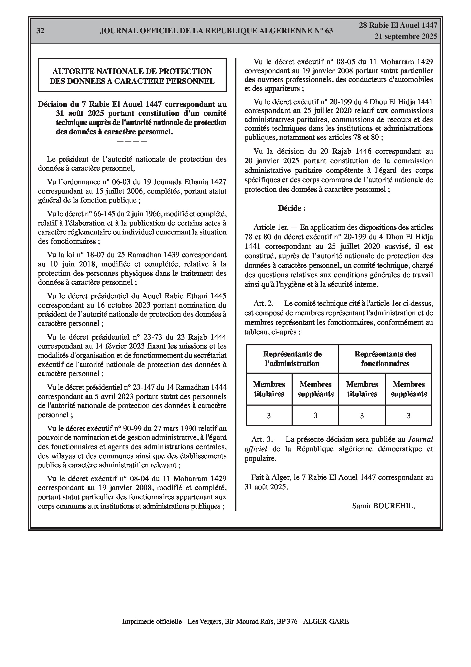 Une décision établit un comité technique auprès de l'Autorité nationale de protection des données à caractère personnel, chargé des questions relatives aux conditions de travail, à l'hygiène et à la sécurité.