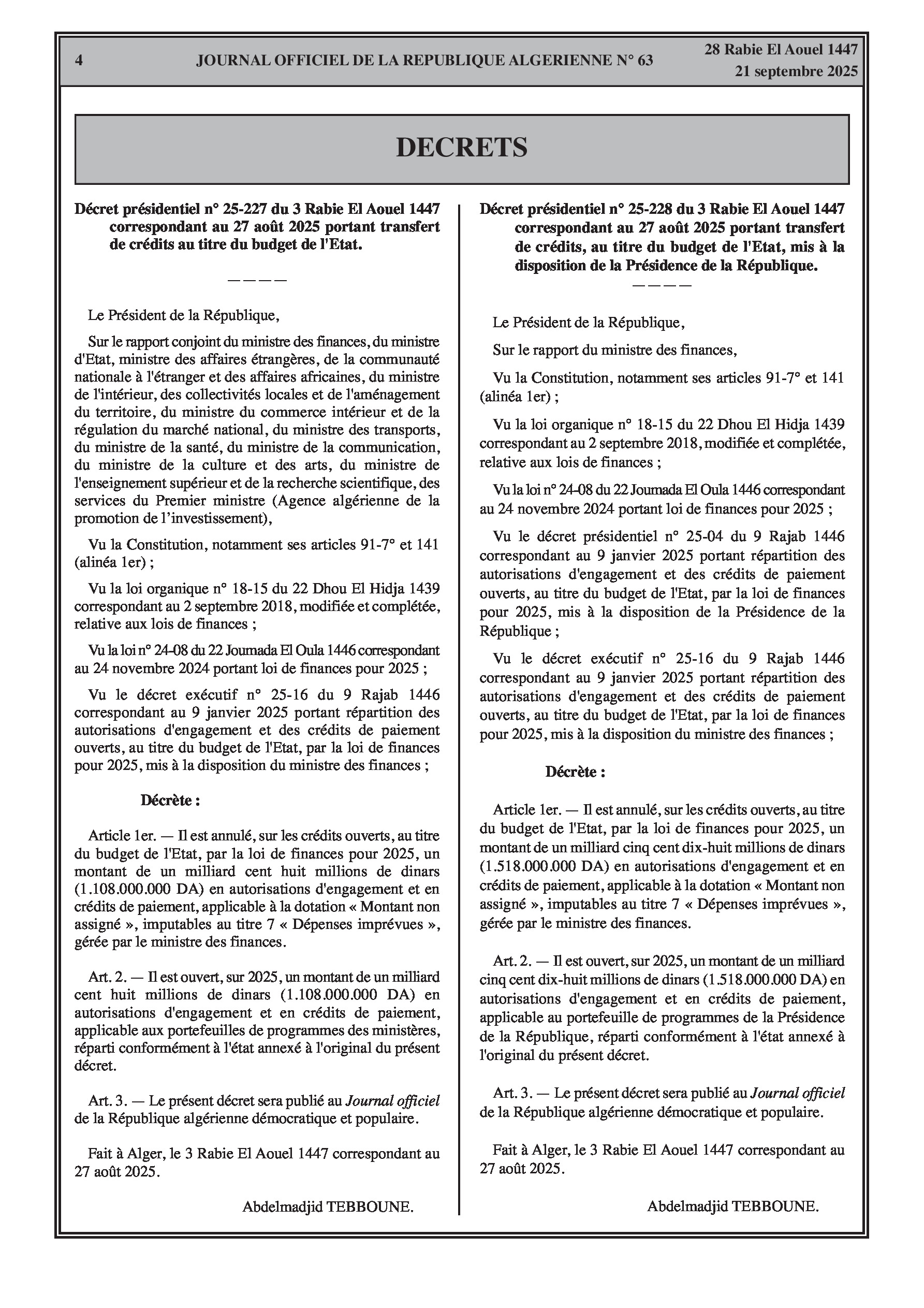 Un second décret transfère 1,518 milliard DA de la même dotation au portefeuille de programmes de la Présidence de la République.