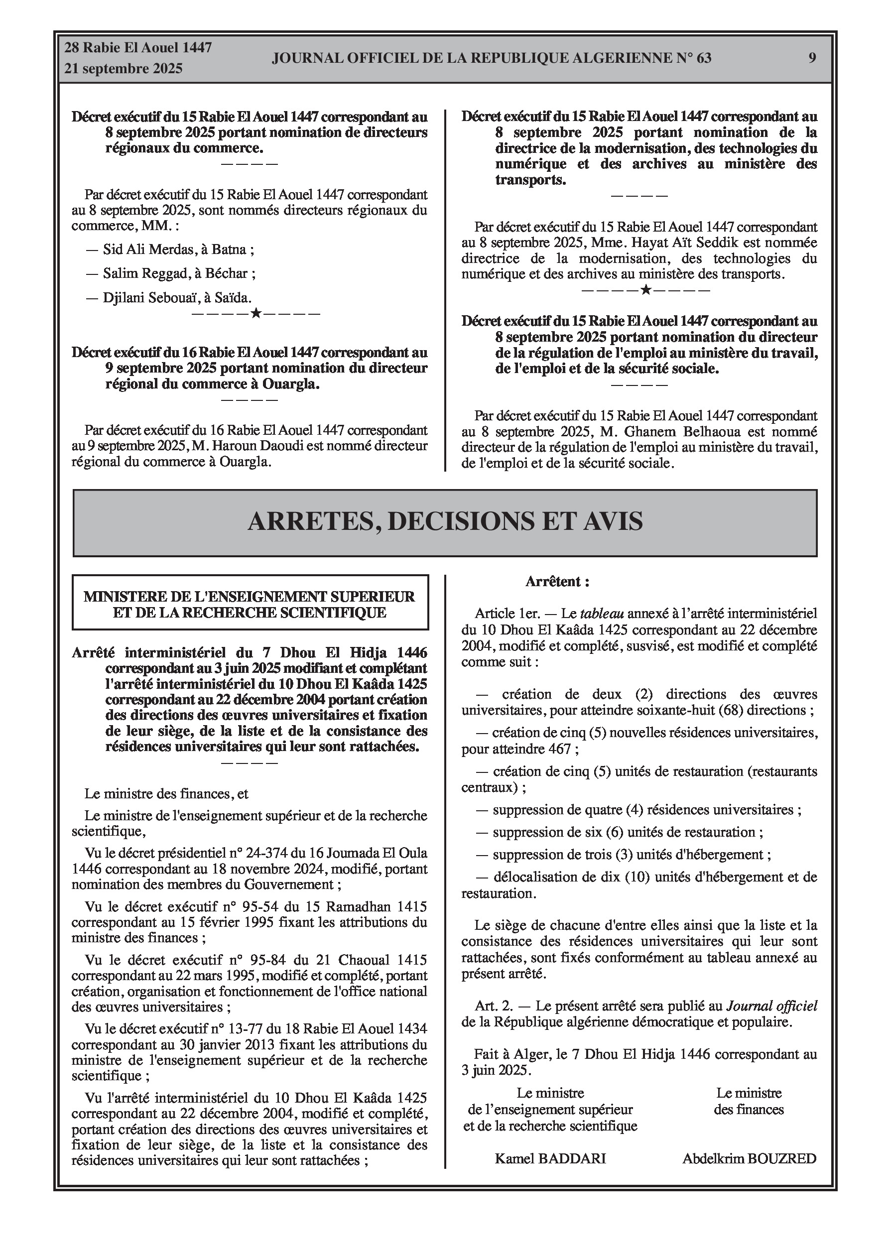 Un arrêté interministériel modifie l'organisation des directions des œuvres universitaires pour améliorer les conditions de vie des étudiants par la création de nouvelles résidences et restaurants.
