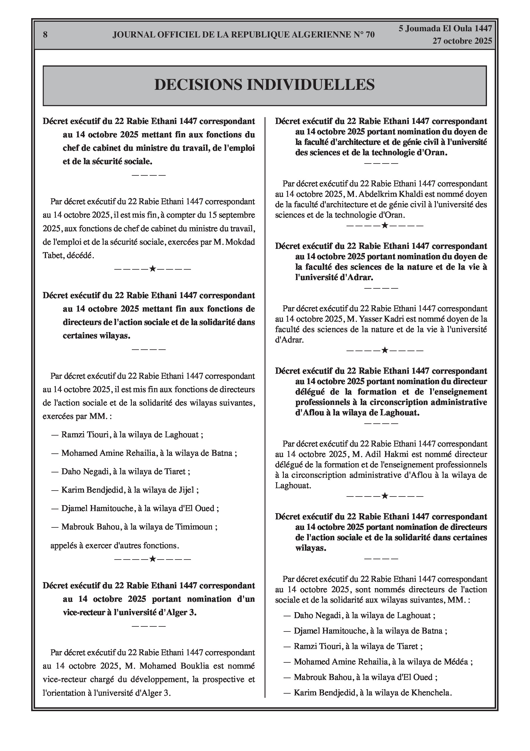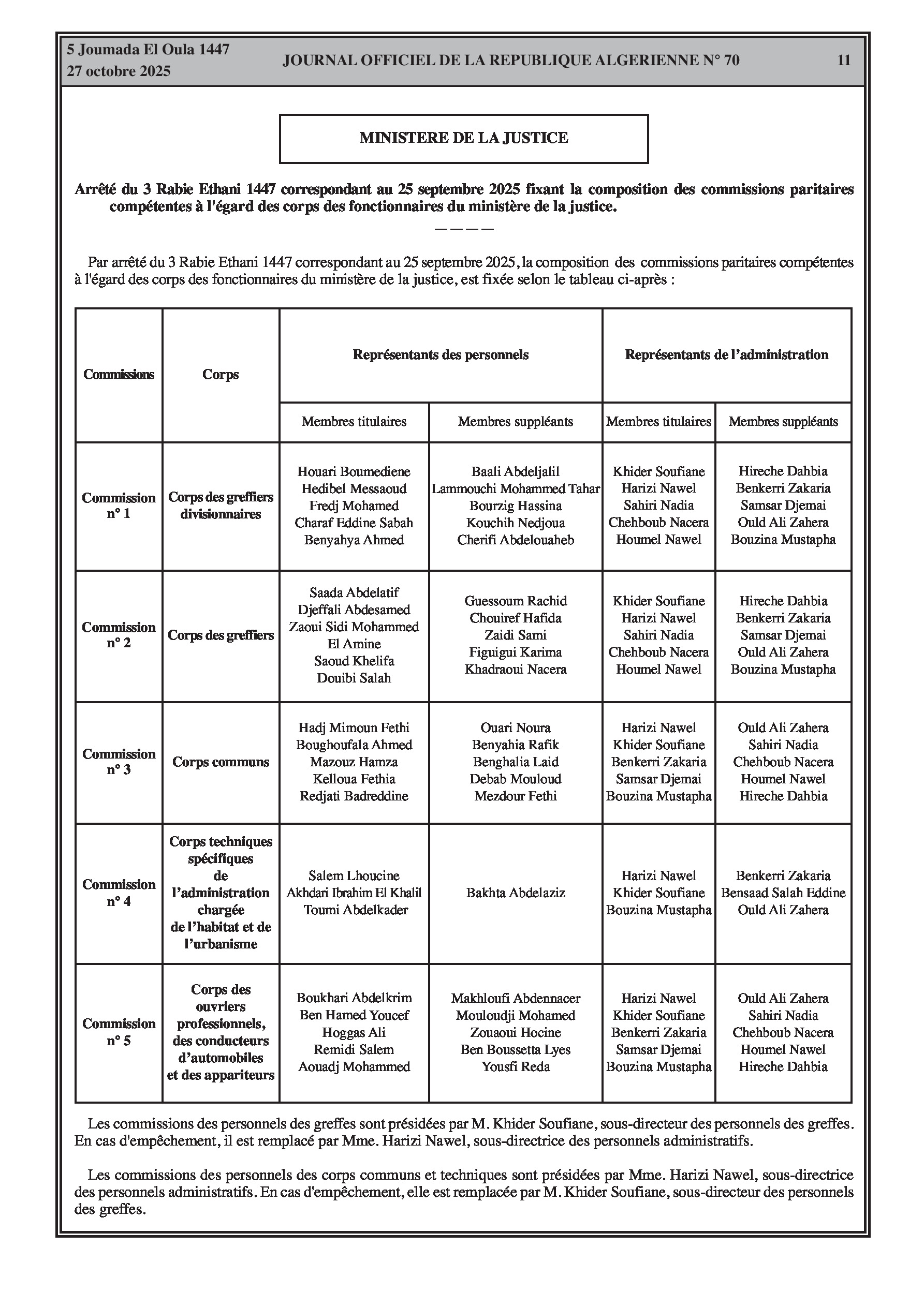 Fin de fonctions du chef de cabinet du ministre du Travail et de directeurs de l'action sociale, ainsi que de nouvelles nominations de vice-recteurs et de doyens d'université. Un arrêté conjoint détaille l'organisation interne des hôpitaux de la sûreté nationale. La composition des commissions paritaires des fonctionnaires du ministère de la justice est également définie.