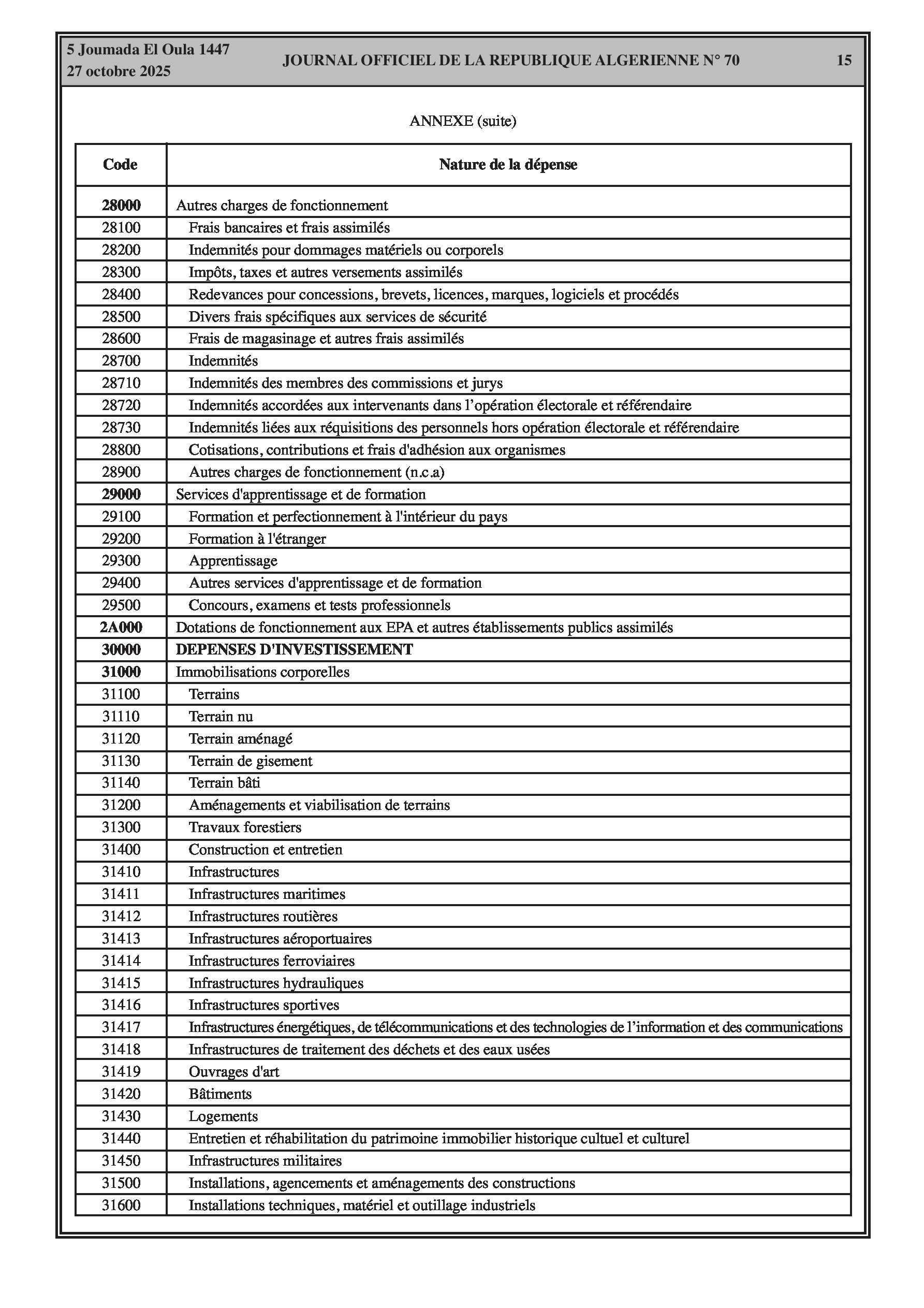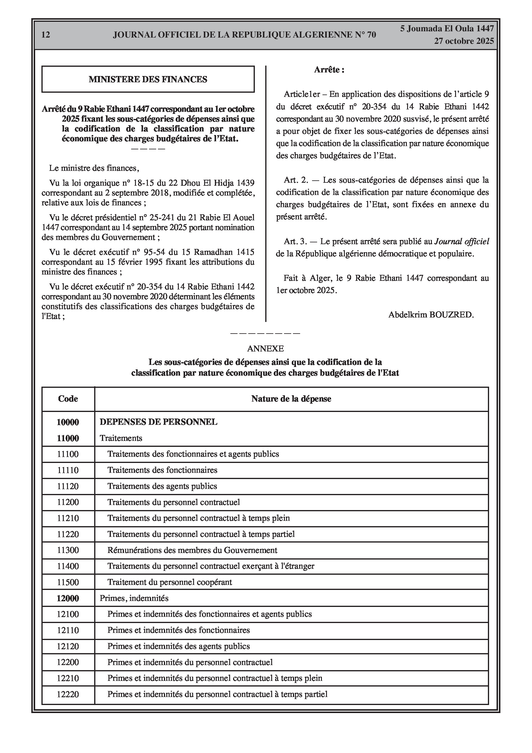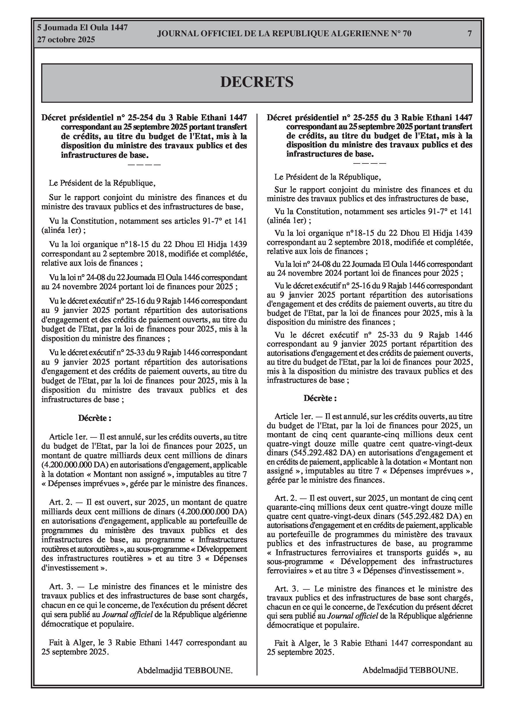 Un total de plus de 4,7 milliards de dinars en autorisations d'engagement est transféré au ministère des Travaux publics. L'arrêté du ministère des Finances fournit une codification exhaustive pour tous les types de dépenses publiques, des salaires du personnel aux charges d'investissement et de la dette, structurant le budget de l'État pour 2025.