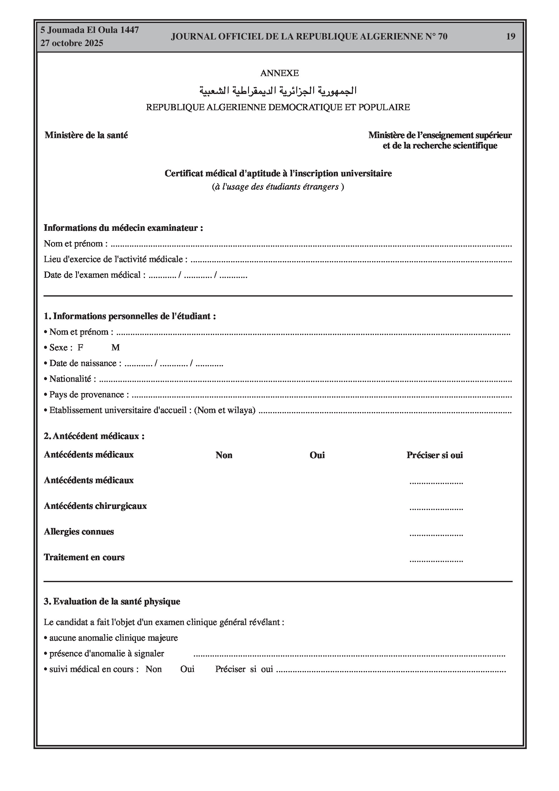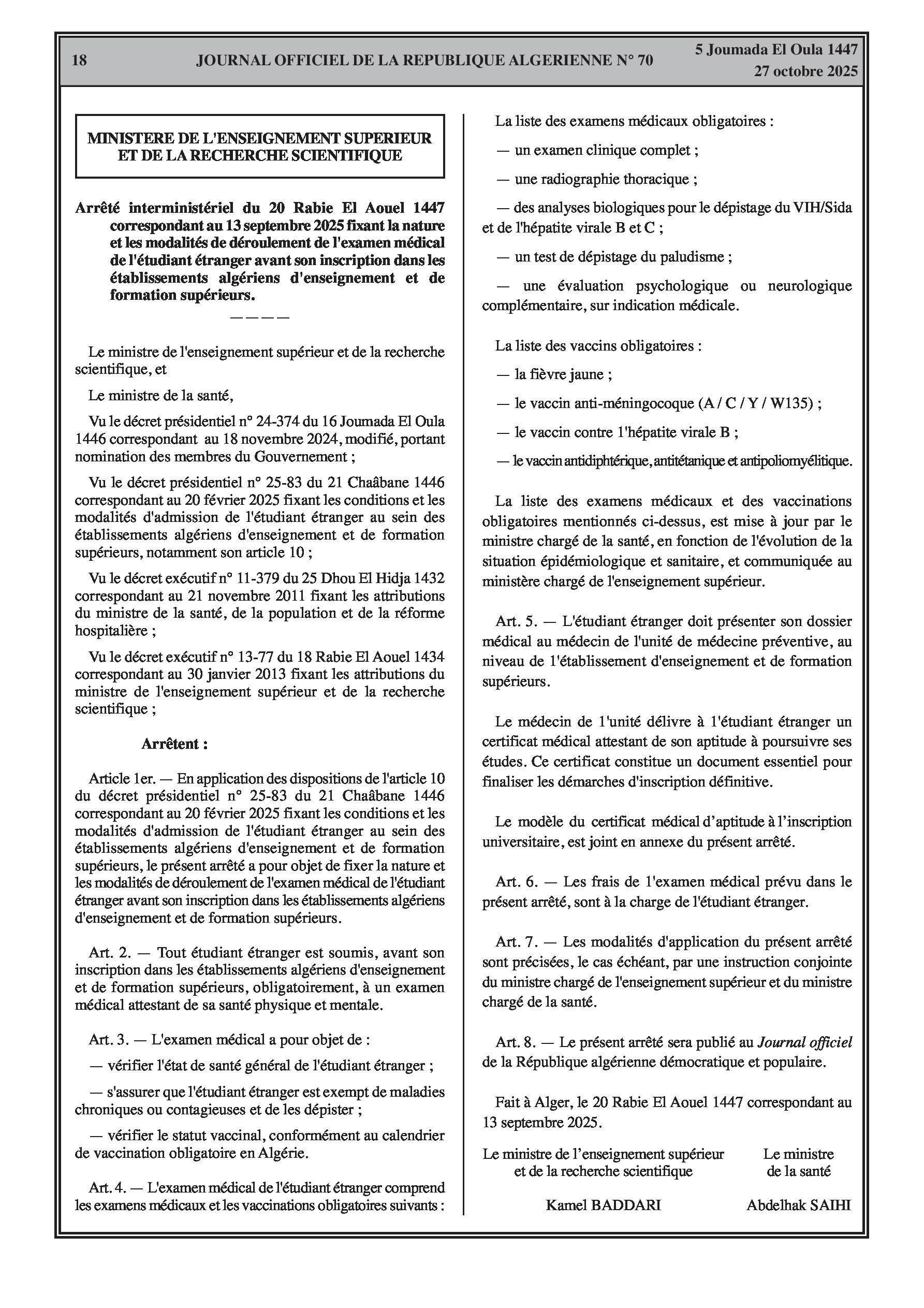 Un nouvel arrêté interministériel précise les examens médicaux et vaccinations obligatoires que les étudiants étrangers doivent effectuer avant leur inscription dans les établissements d'enseignement supérieur algériens.