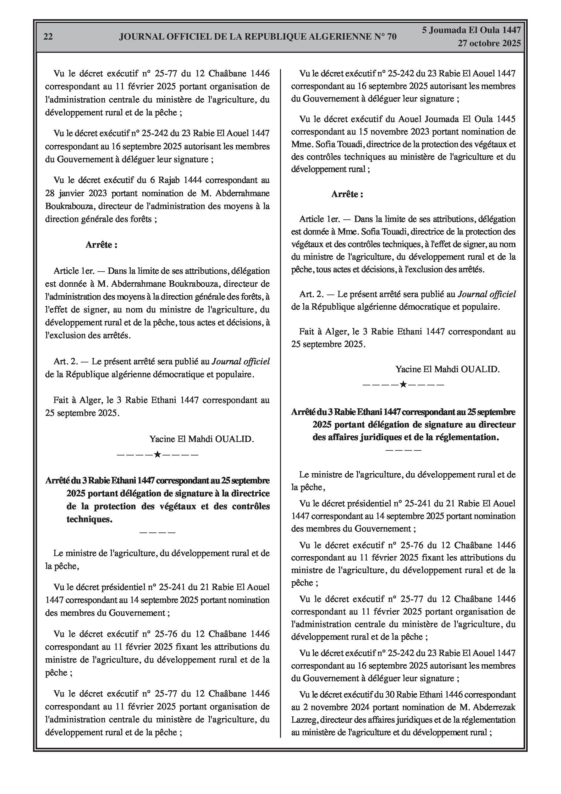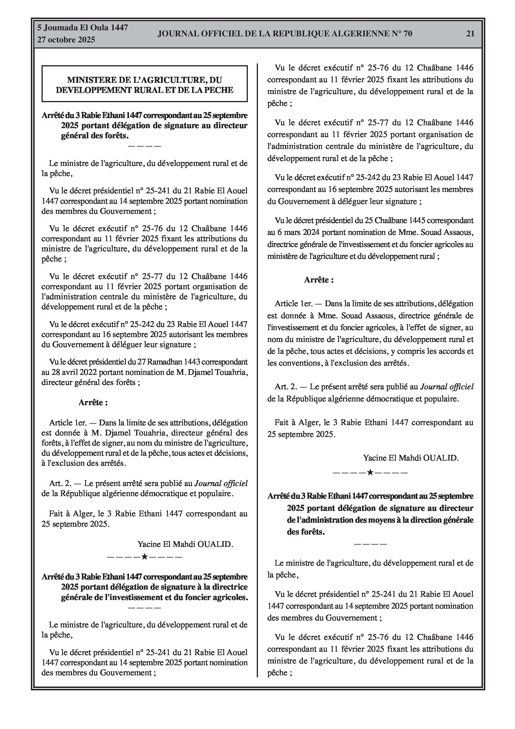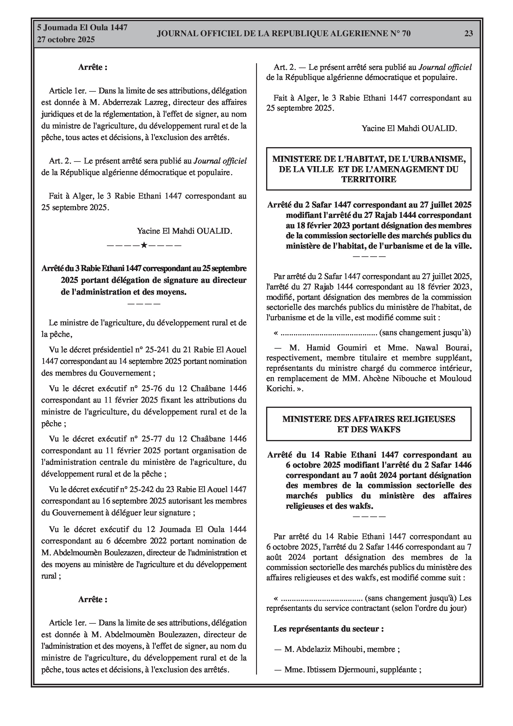 Plusieurs arrêtés délèguent l'autorité de signature à des directeurs centraux au sein du ministère de l'Agriculture. D'autres arrêtés modifient ou désignent les membres des commissions sectorielles des marchés publics pour les ministères de l'Habitat, des Affaires religieuses et de la Jeunesse.