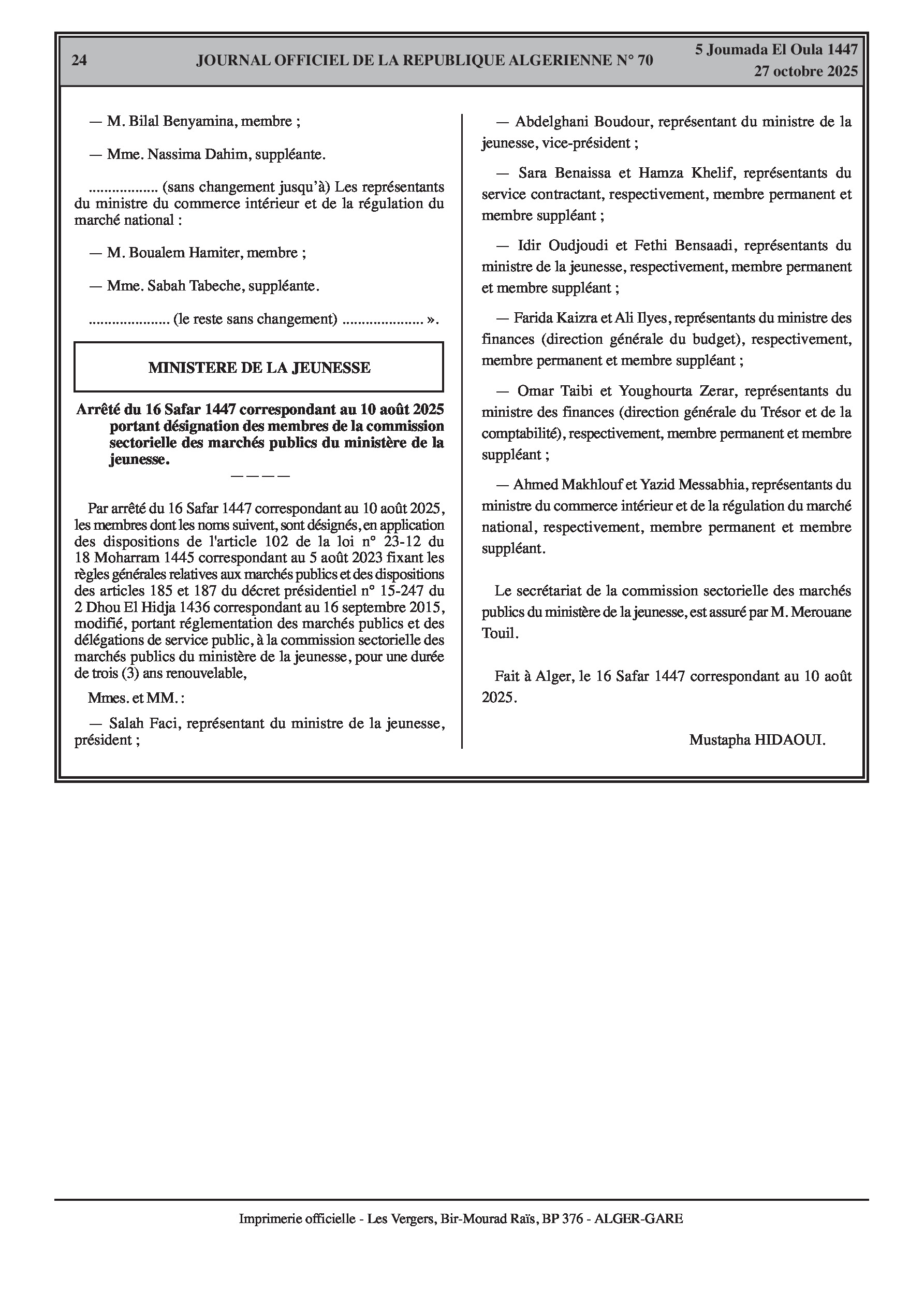 L'autorité de signature est déléguée aux Directeurs généraux des forêts, de l'investissement agricole, et autres. De nouveaux membres sont nommés aux commissions des marchés publics du ministère de l'Habitat, du ministère des Affaires religieuses et des Wakfs, et du ministère de la Jeunesse.