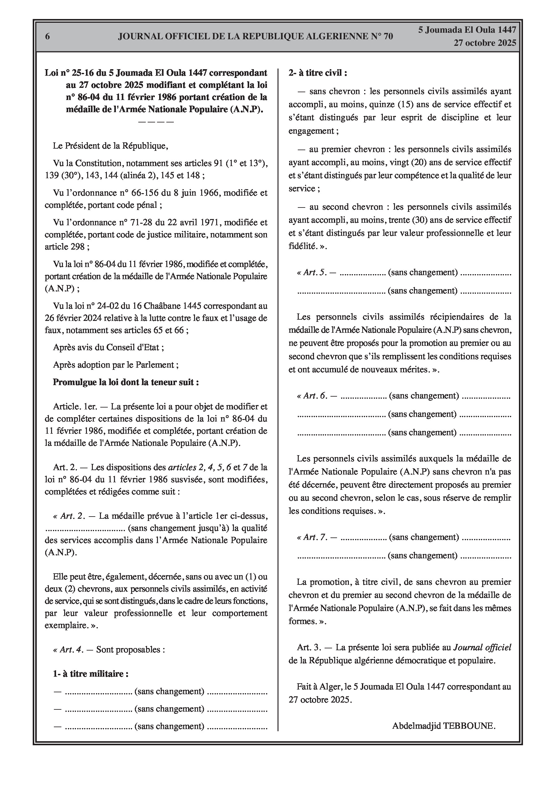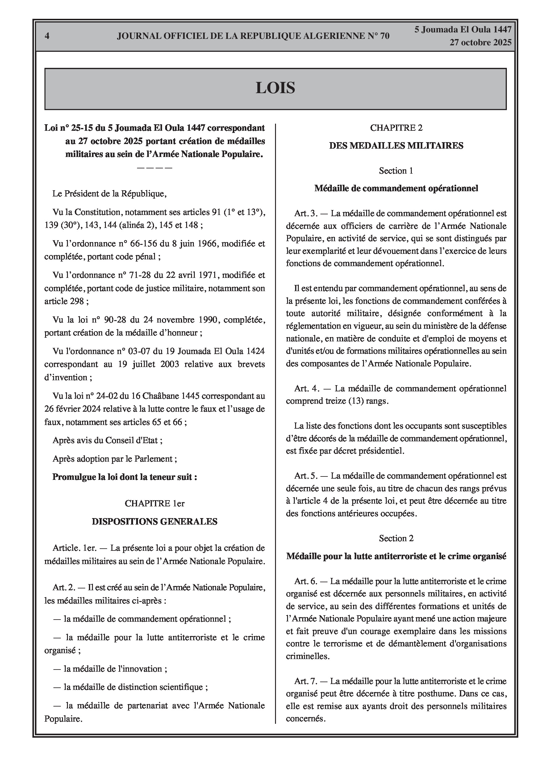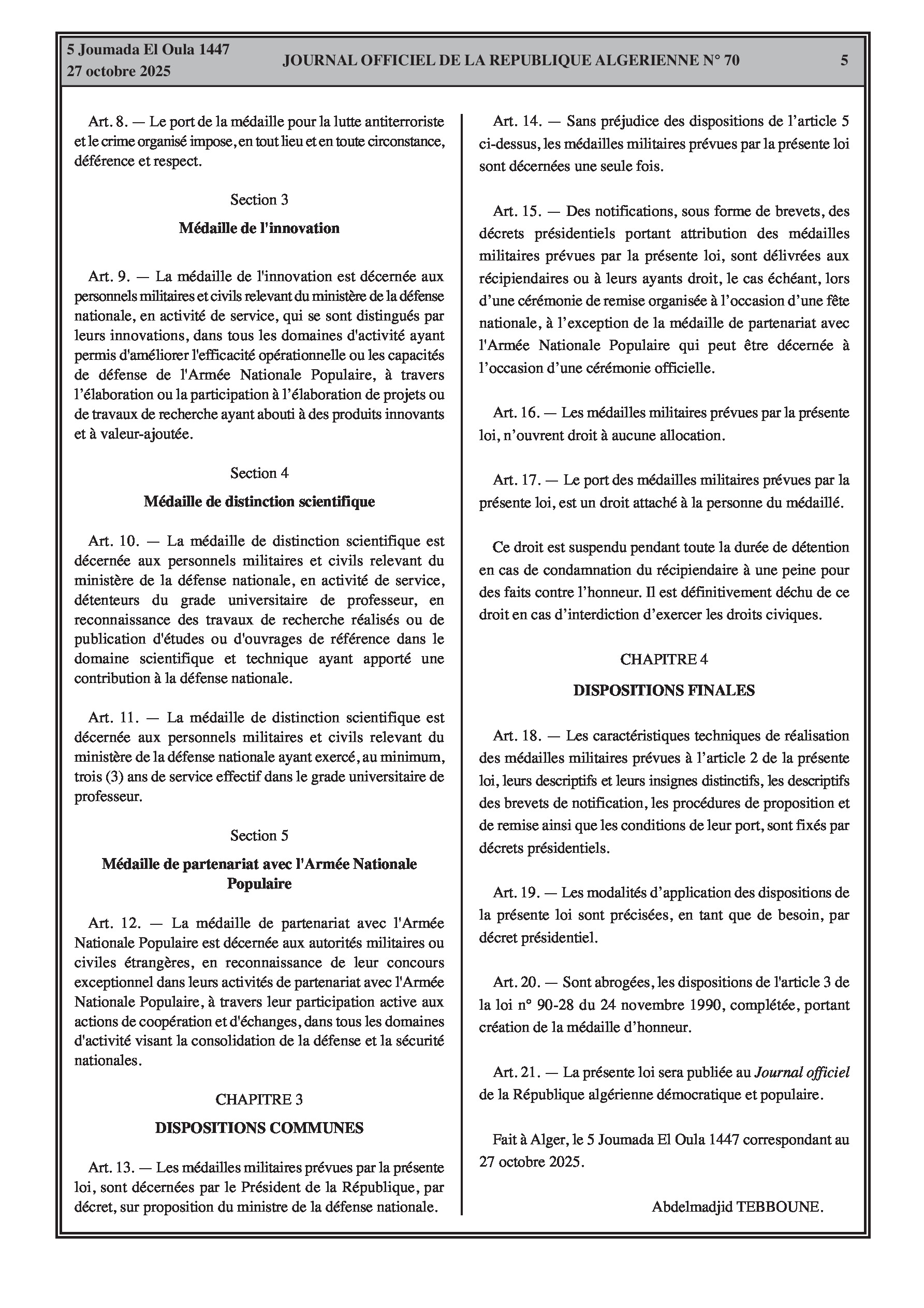 Promulgation de deux lois : la première crée cinq nouvelles médailles militaires pour honorer des accomplissements spécifiques, et la seconde modifie la médaille de l'Armée Nationale Populaire (ANP) pour inclure le personnel civil assimilé.