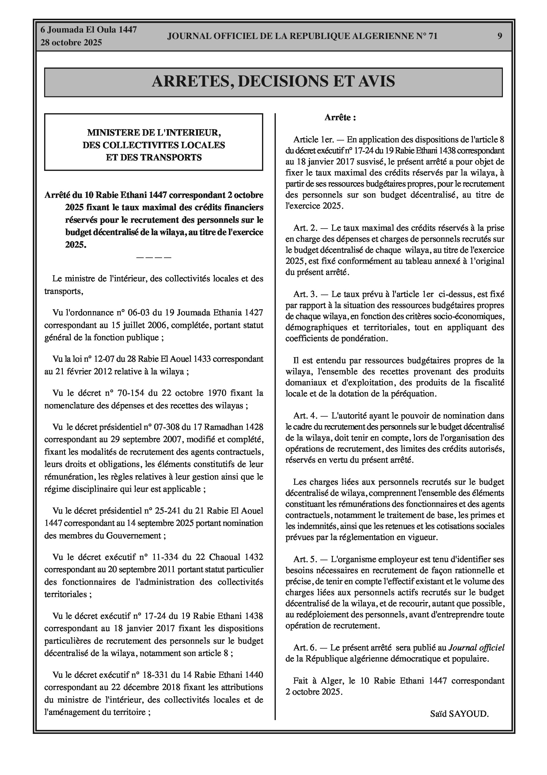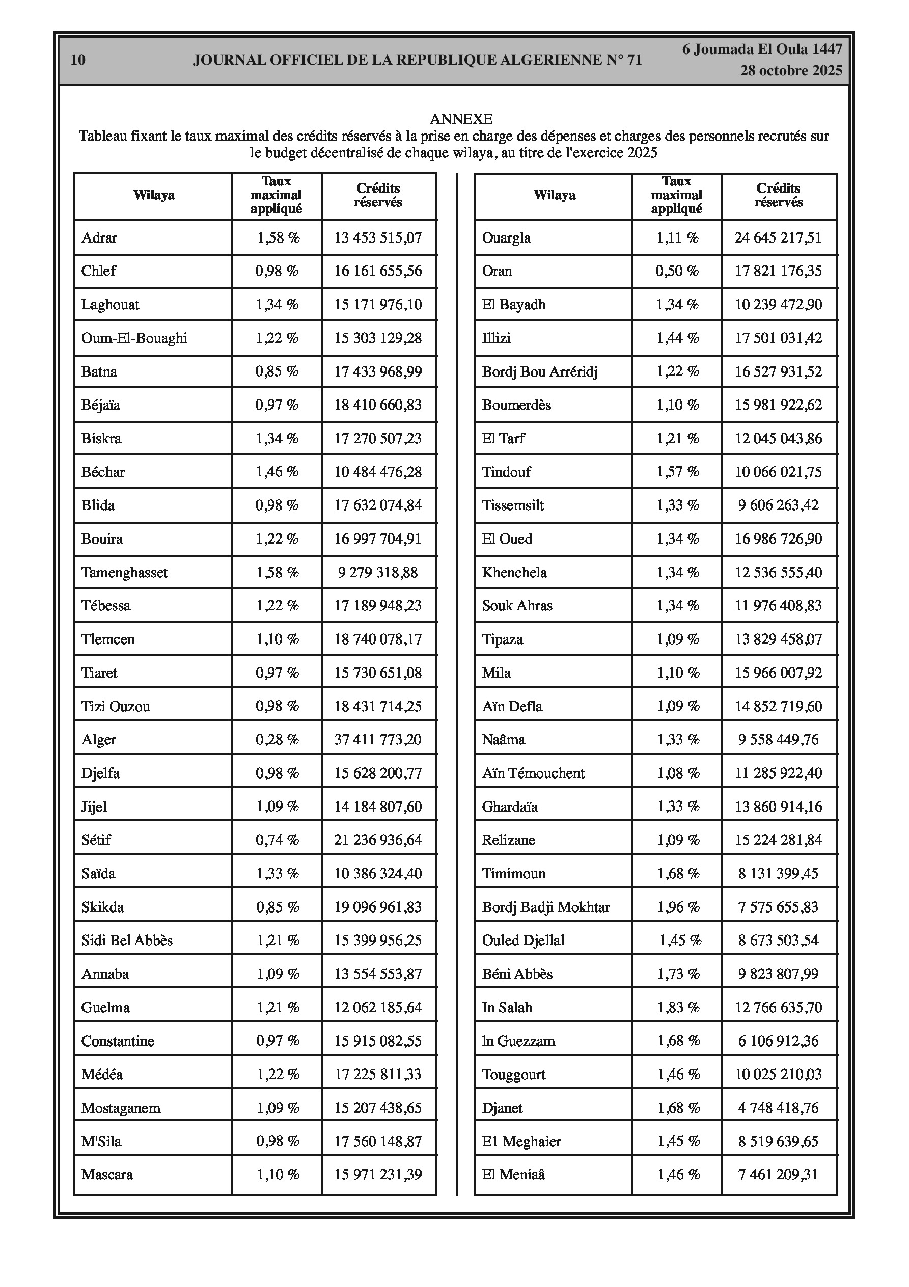 Un arrêté ministériel fixe le taux maximal des crédits financiers pour le recrutement de personnels sur le budget décentralisé de la wilaya pour l'exercice 2025, avec un tableau détaillé pour chaque wilaya.
