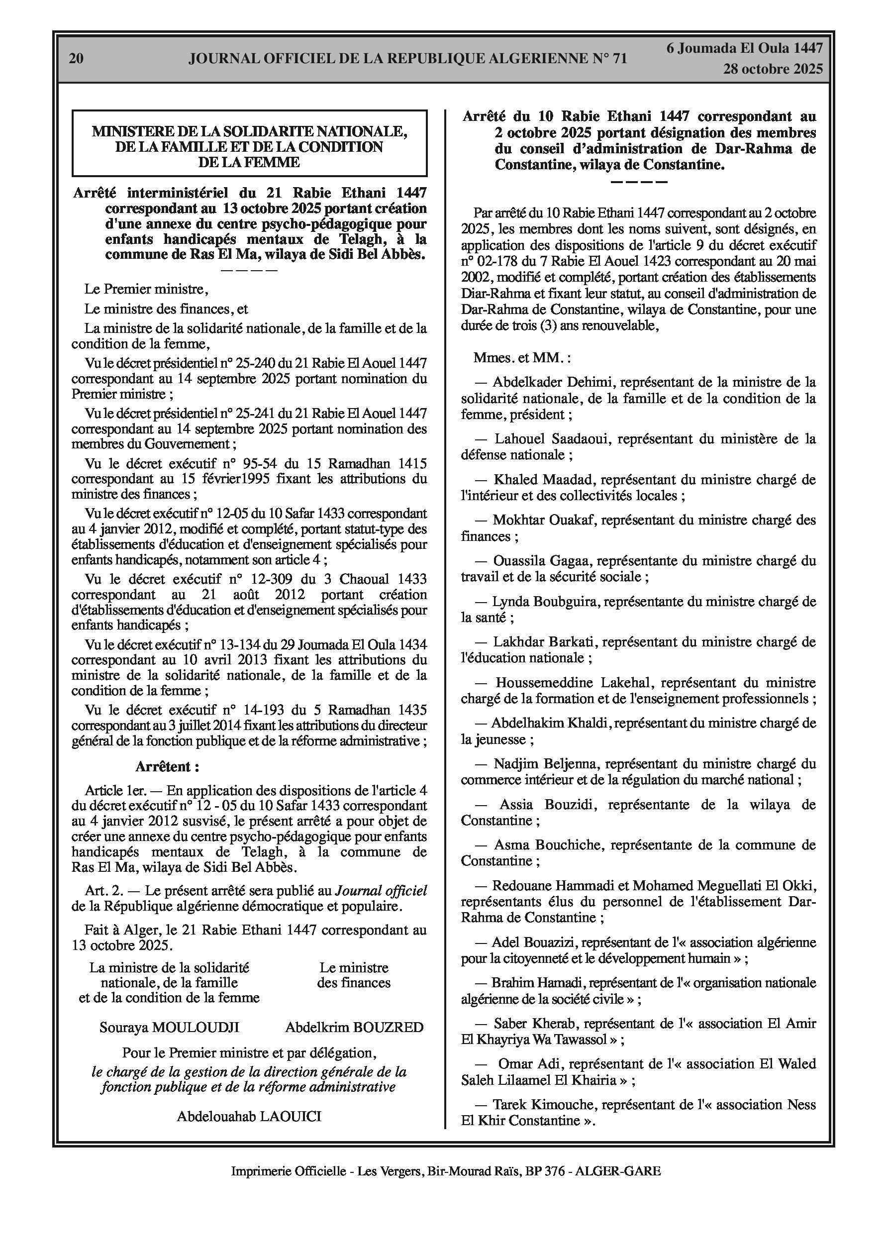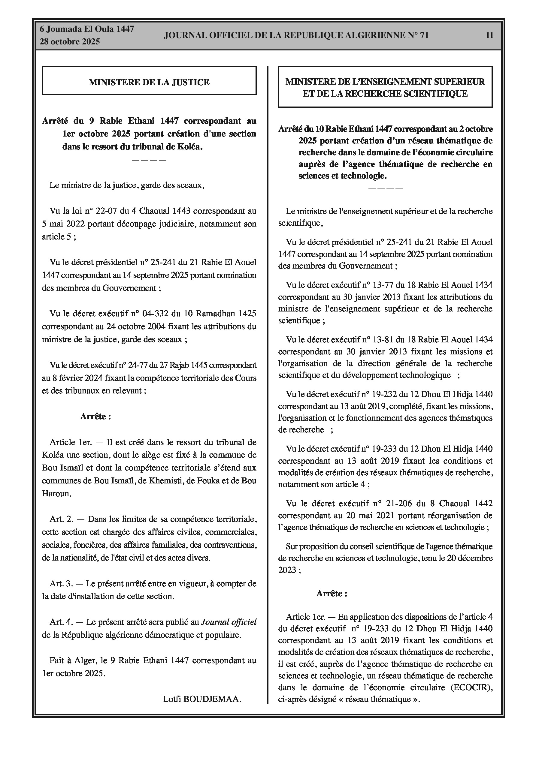 Création d'une nouvelle section au sein du tribunal de Koléa et extension du soutien aux enfants à besoins spécifiques avec une nouvelle annexe du centre psycho-pédagogique dans la wilaya de Sidi Bel Abbès.