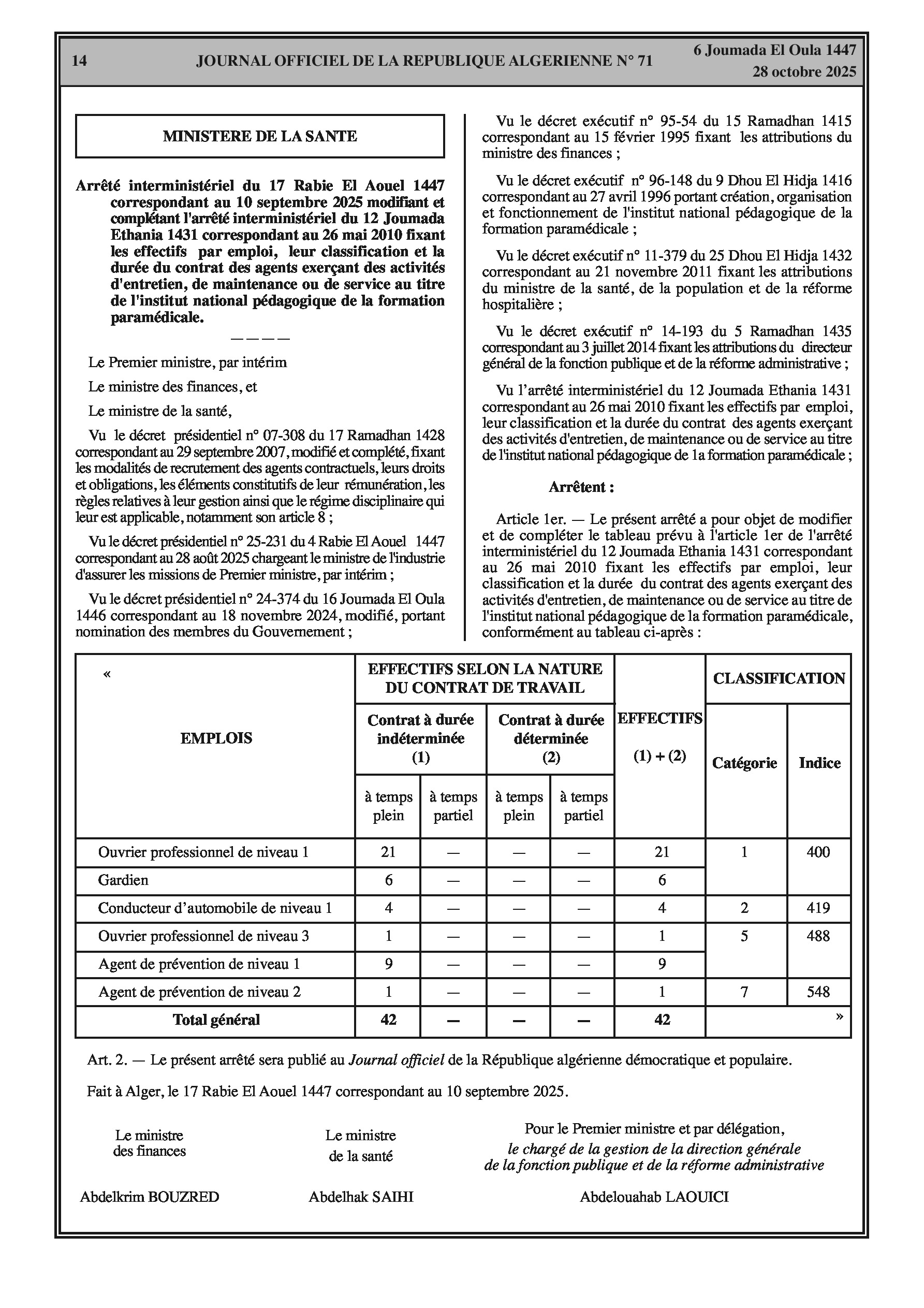 - Mise à jour de la classification des emplois et de la durée des contrats à l'Institut National Pédagogique de la Formation Paramédicale.