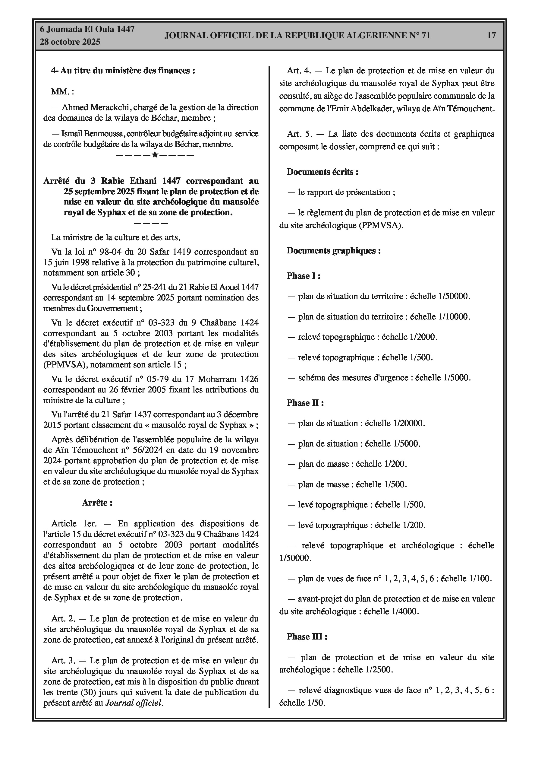 - Fixation du plan de protection et de mise en valeur du site archéologique du mausolée royal de Syphax.