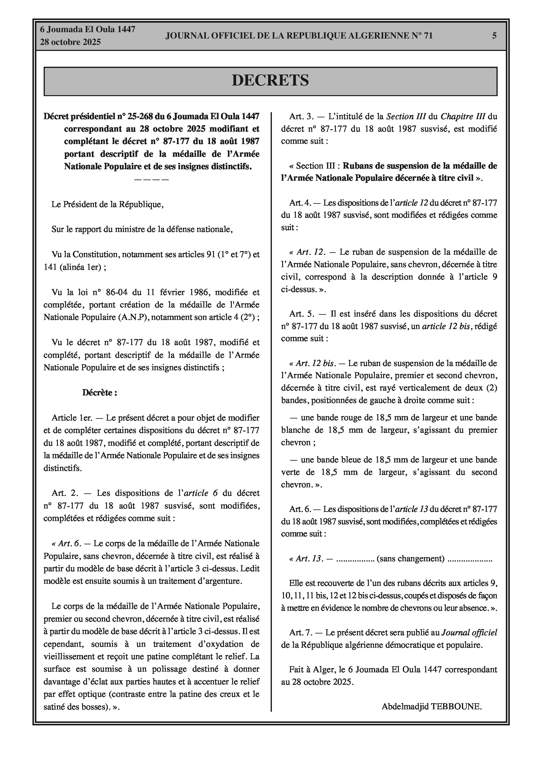 Deux décrets présidentiels modifient la médaille de l'Armée Nationale Populaire décernée à titre civil et fixent l'ordre officiel de port des médailles et décorations nationales.