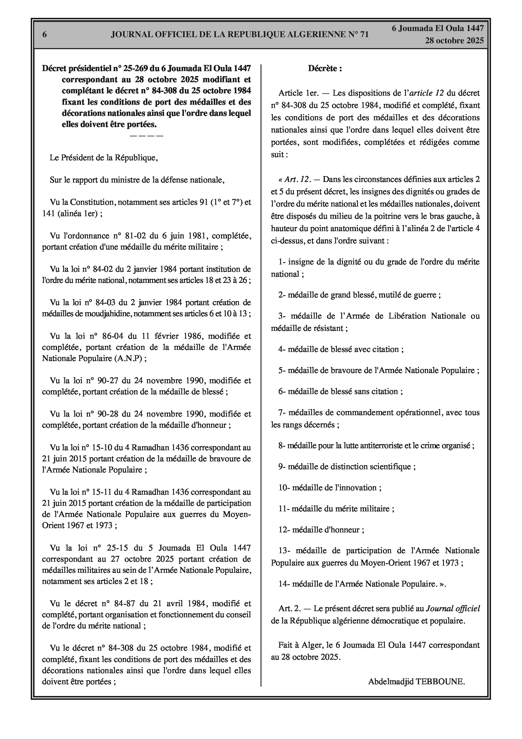 - Définition de l'ordre de préséance pour le port des médailles, de l'insigne de l'ordre du mérite national à la médaille de l'Armée Nationale Populaire.