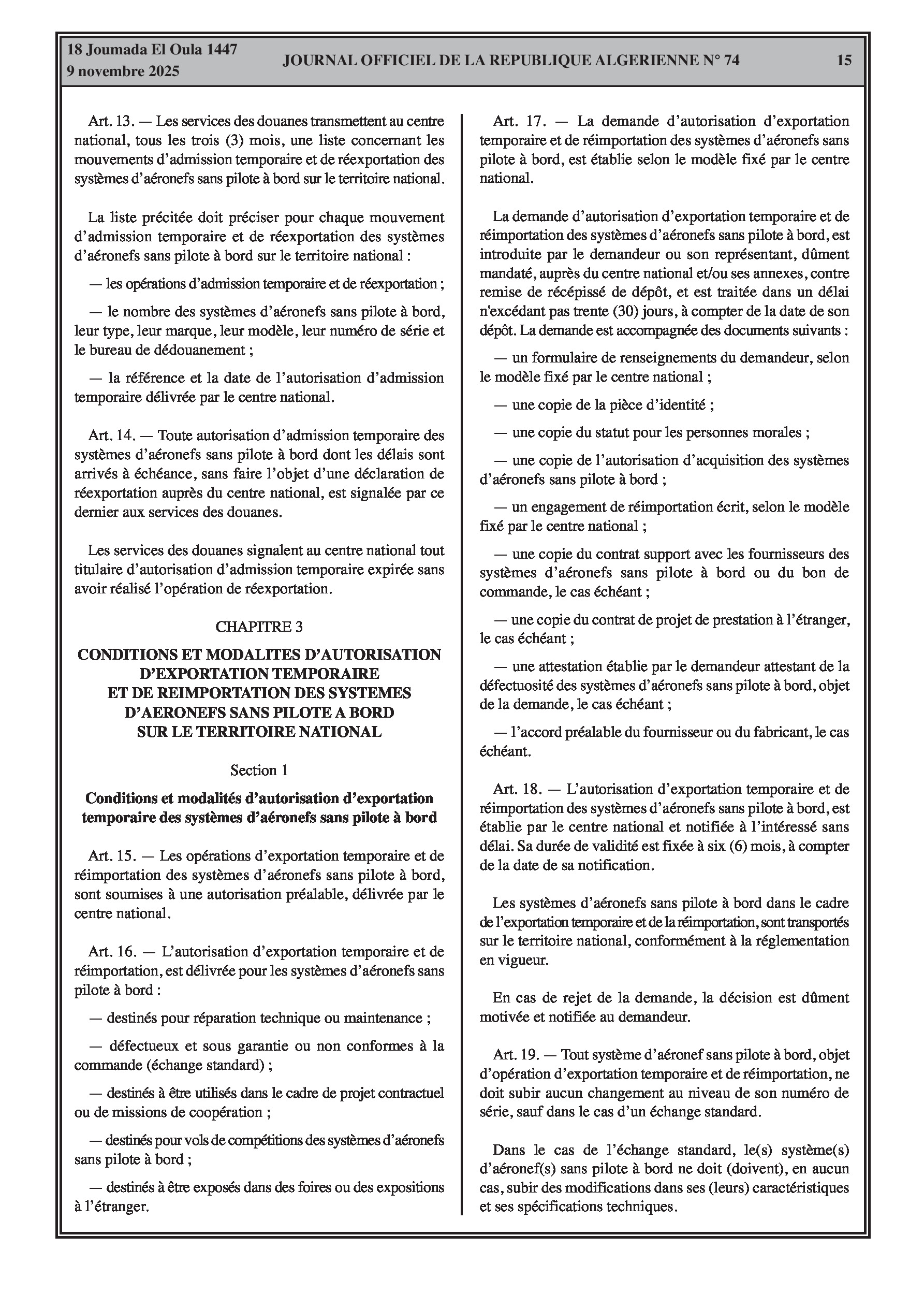 • **Mouvement International**: Des procédures sont mises en place pour l'importation/exportation temporaire de drones pour réparation, expositions ou missions professionnelles.
