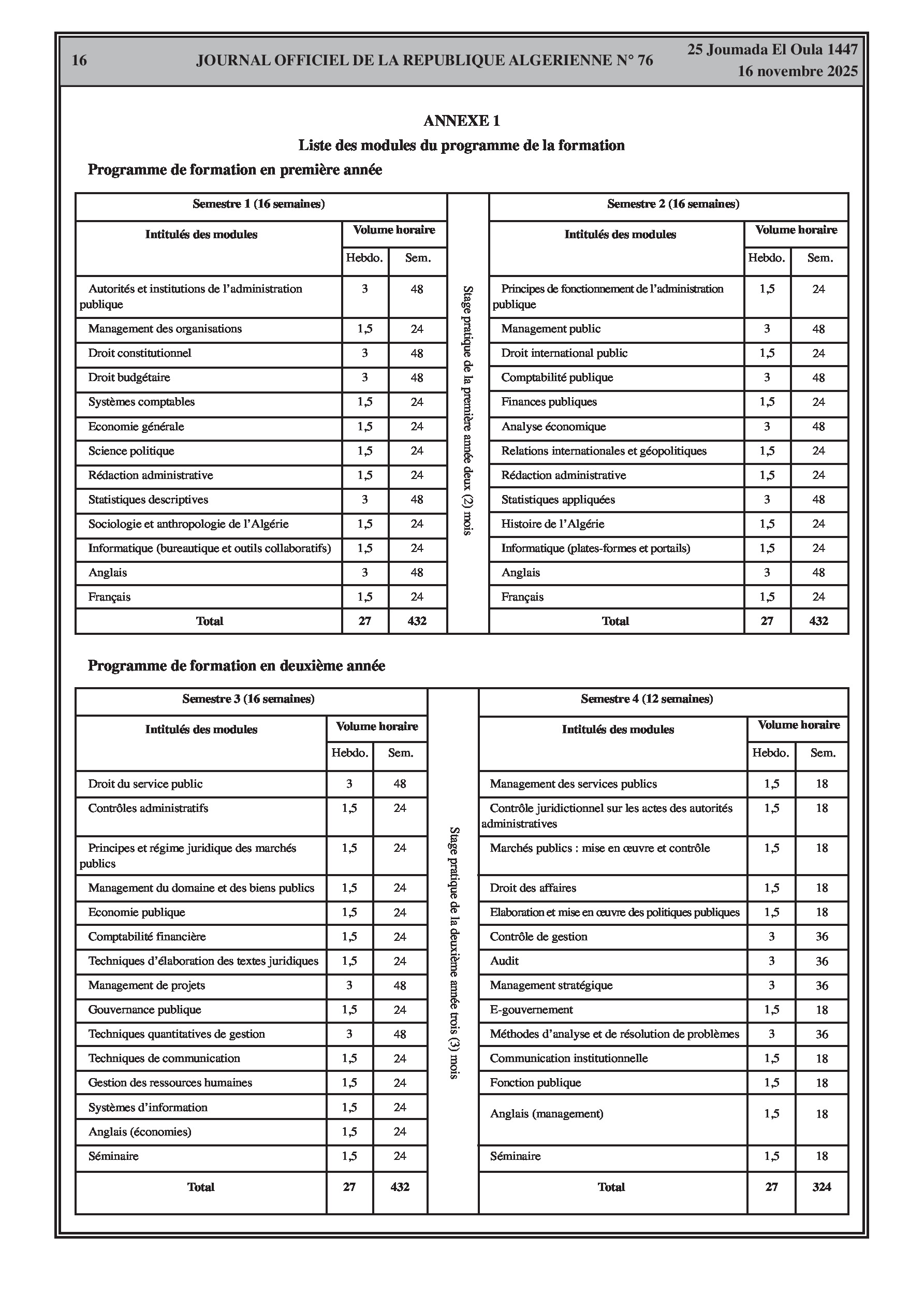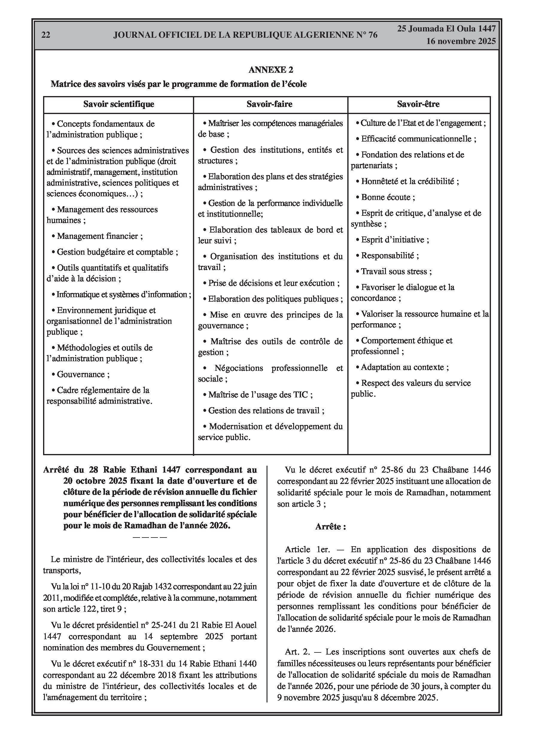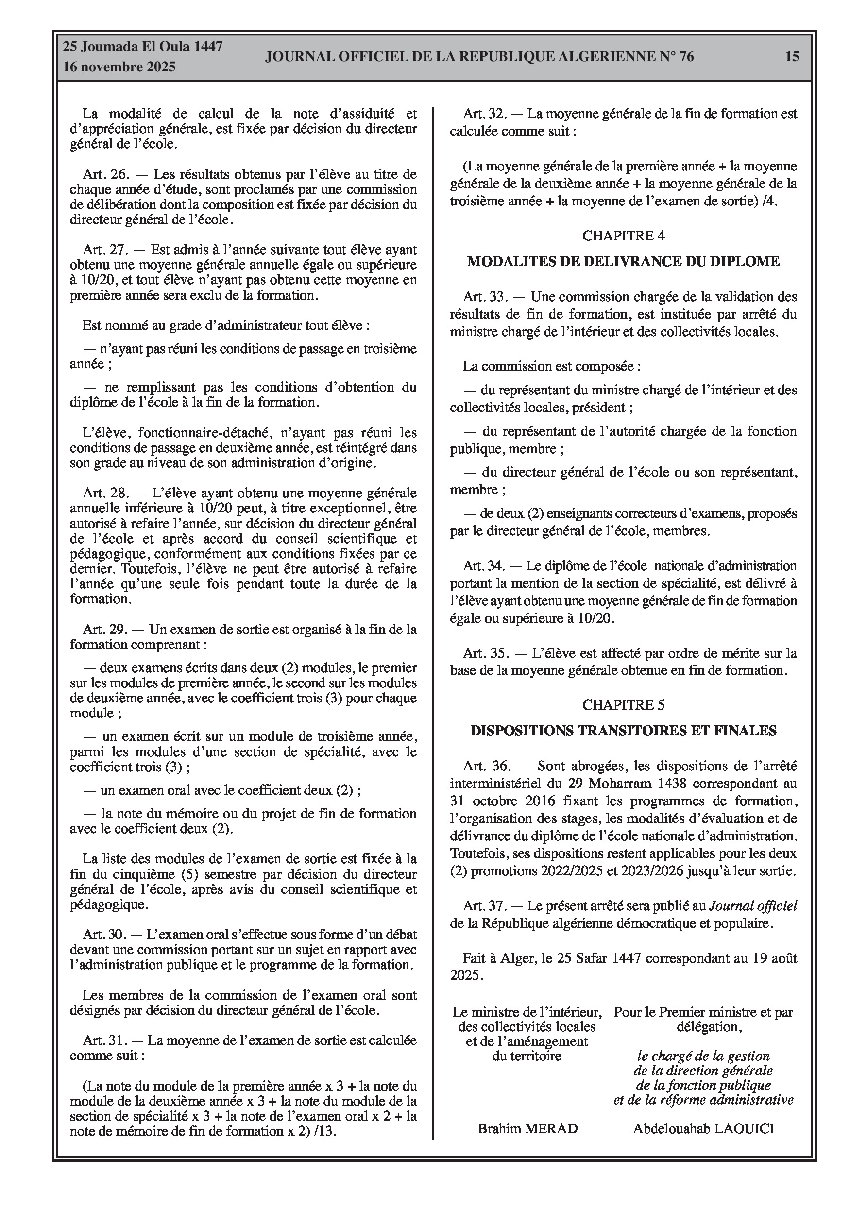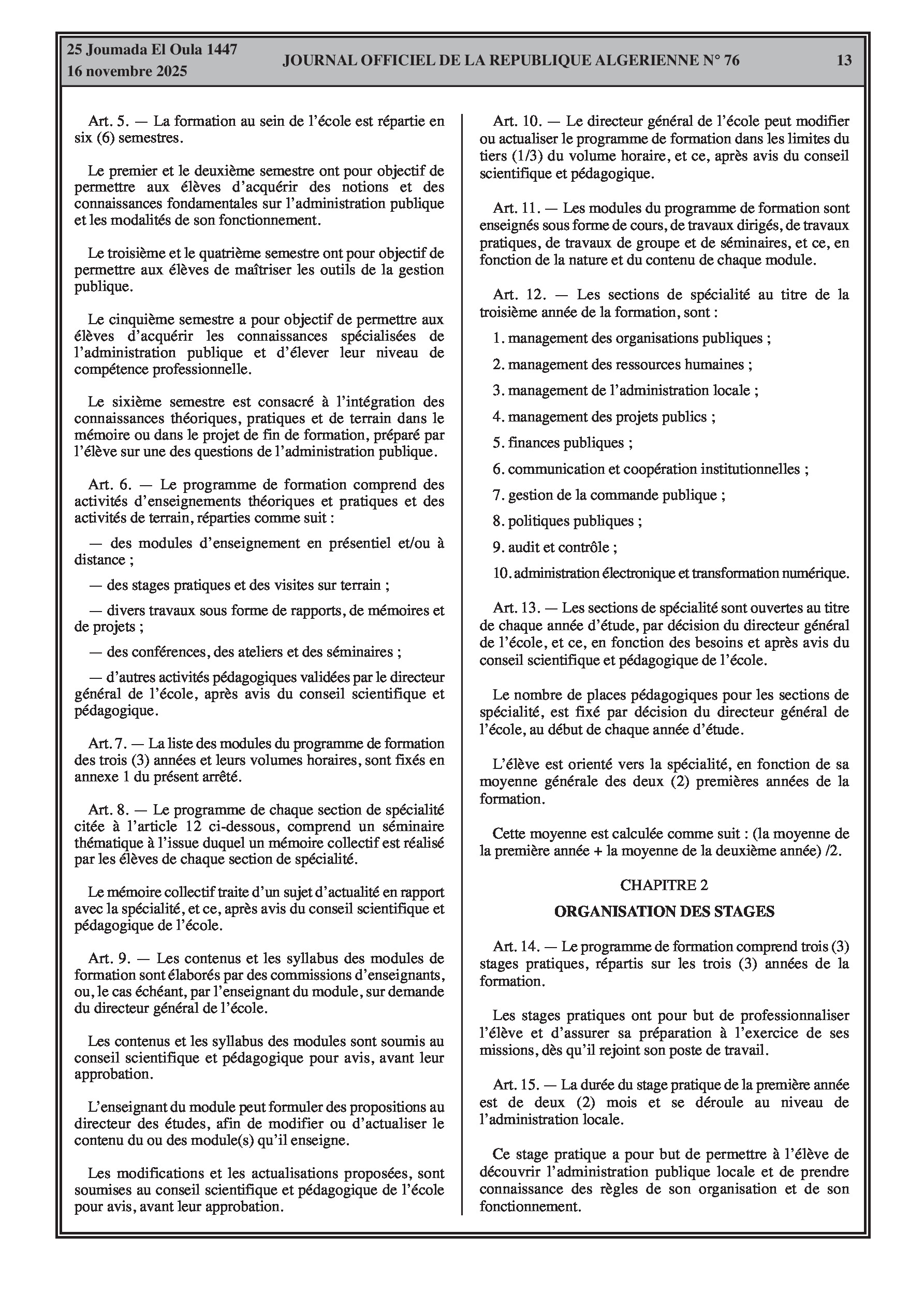 Publication d'un nouveau programme de formation de trois ans pour l'Ecole Nationale d'Administration, parallèlement à une vaste série de décrets de fin de fonctions et de nominations dans divers secteurs ministériels.