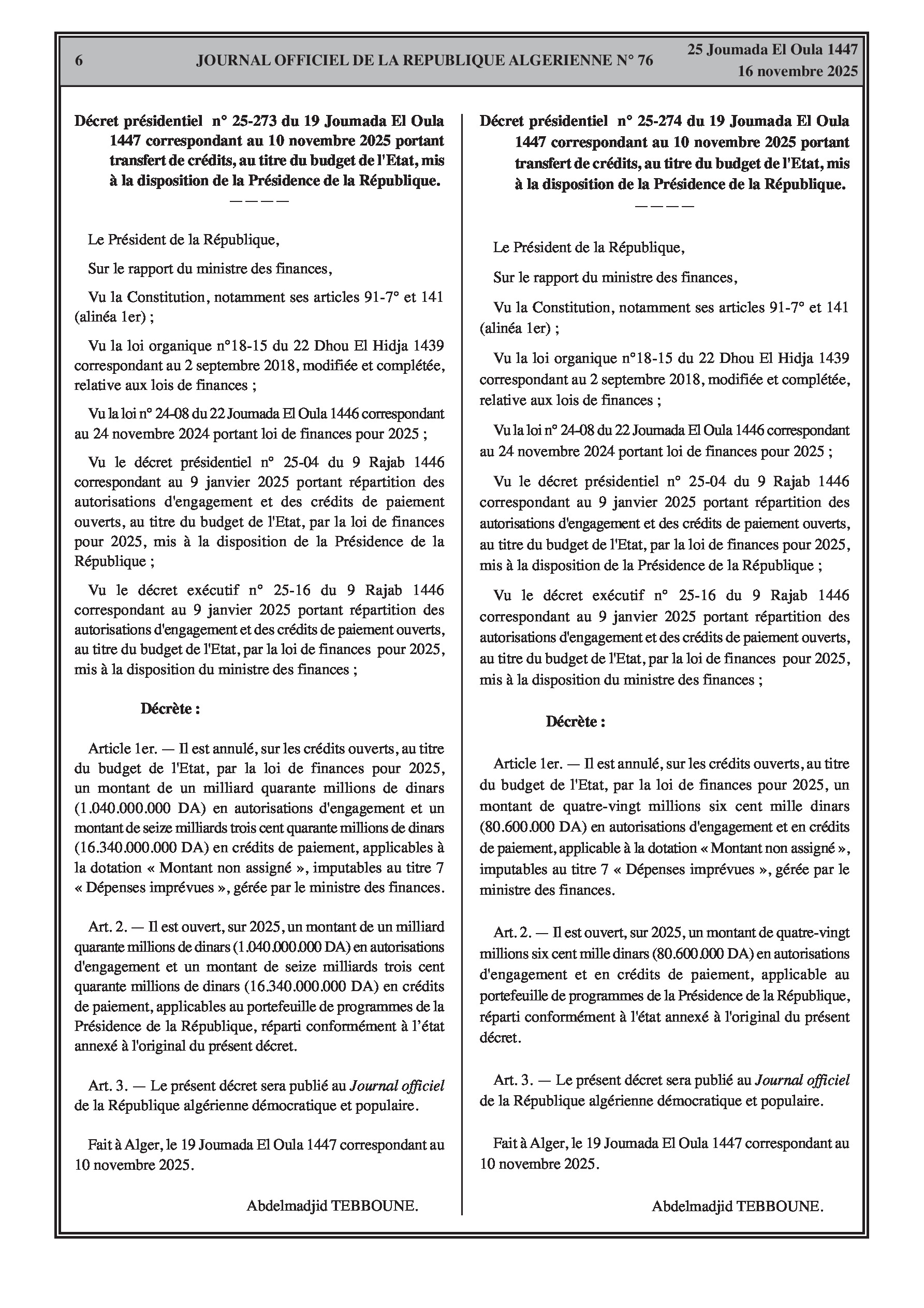 Transferts de crédits dans le budget de l'État, fixation des dates d'inscription pour l'allocation de solidarité Ramadan 2026, et publication de nouvelles règles pour le logement promotionnel public et l'importation de services médias.