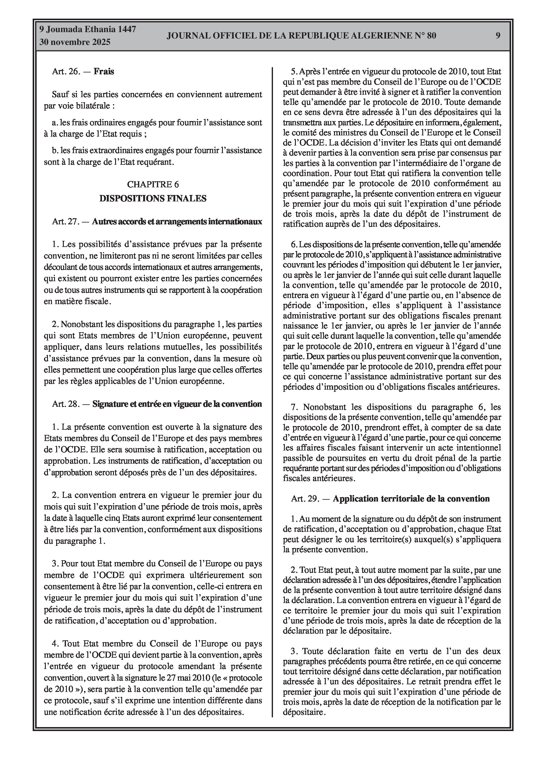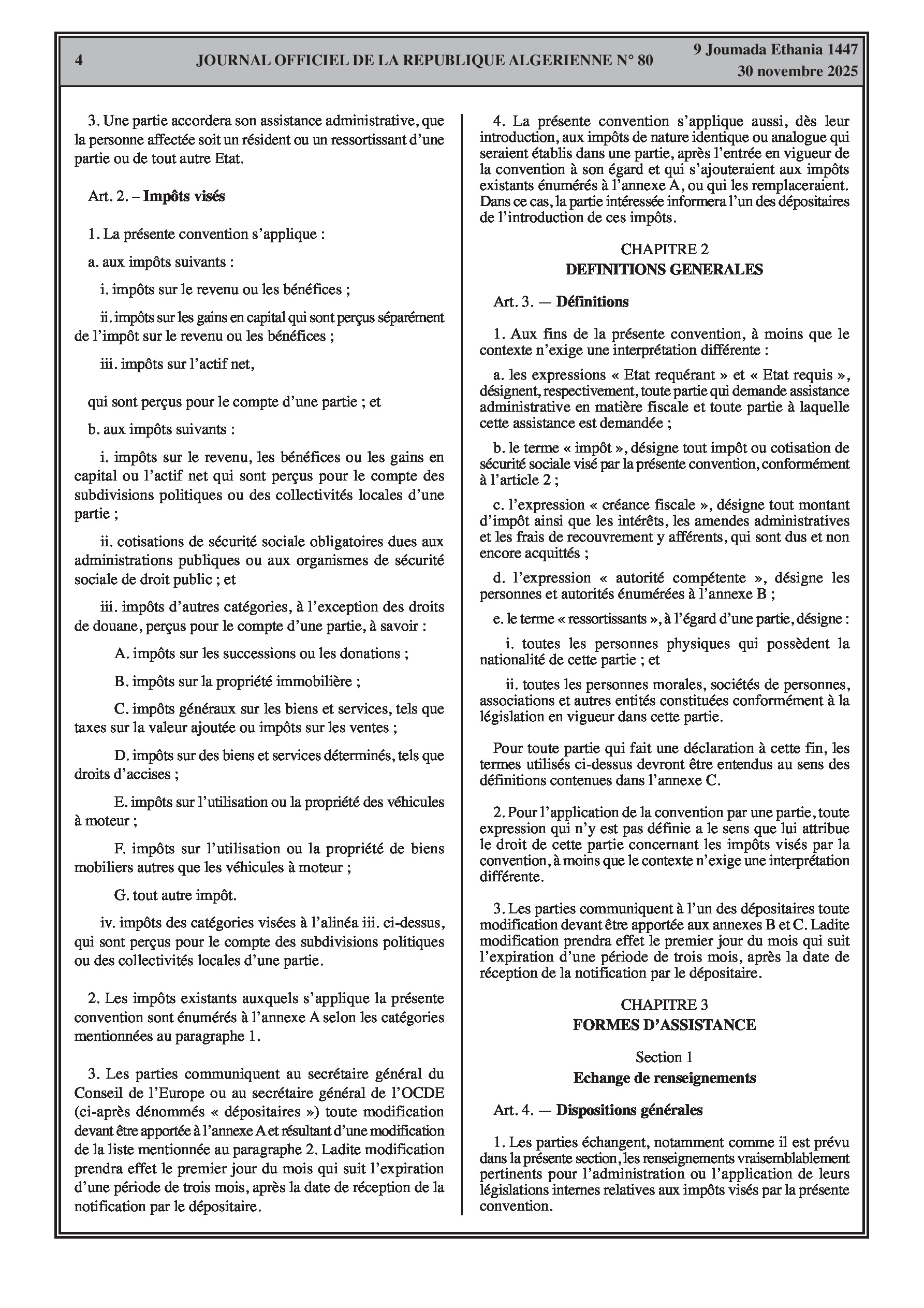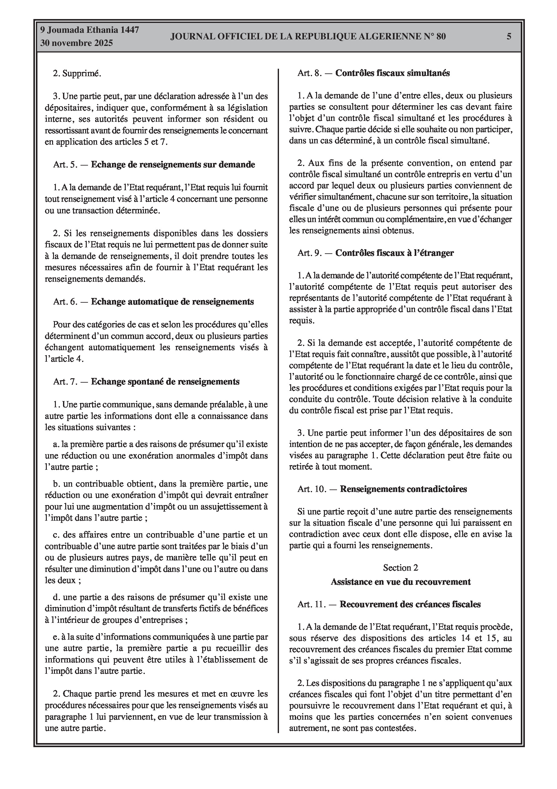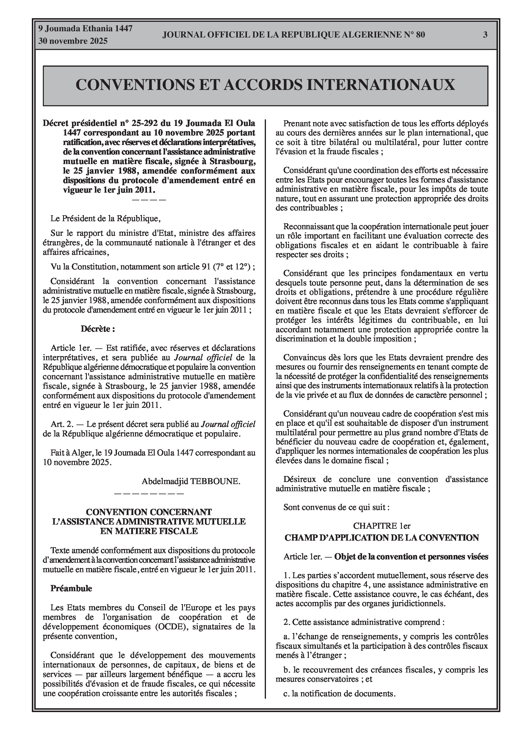 L'Algérie ratifie la convention concernant l'assistance administrative mutuelle en matière fiscale (Conseil de l'Europe/OCDE) pour renforcer la transparence.