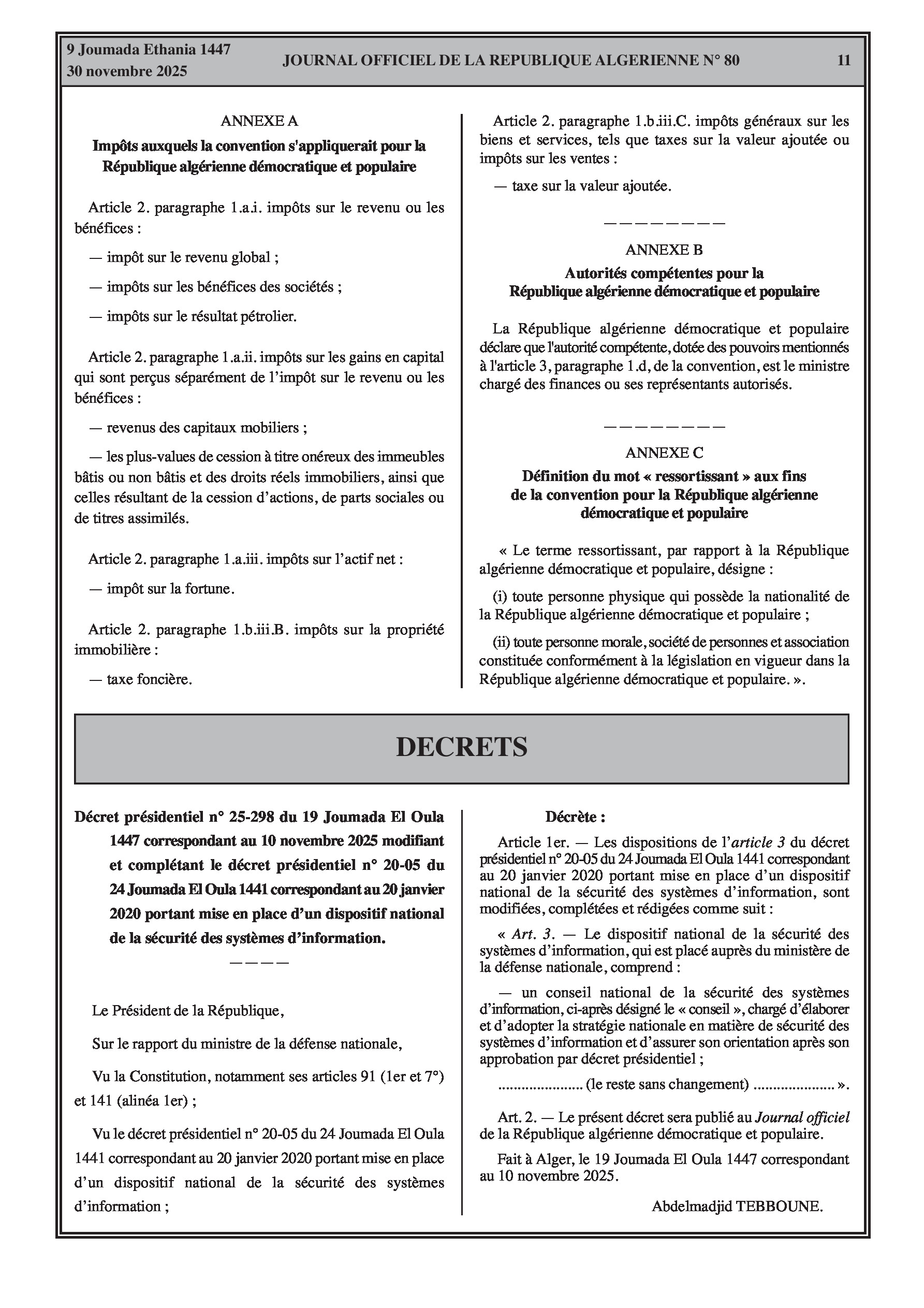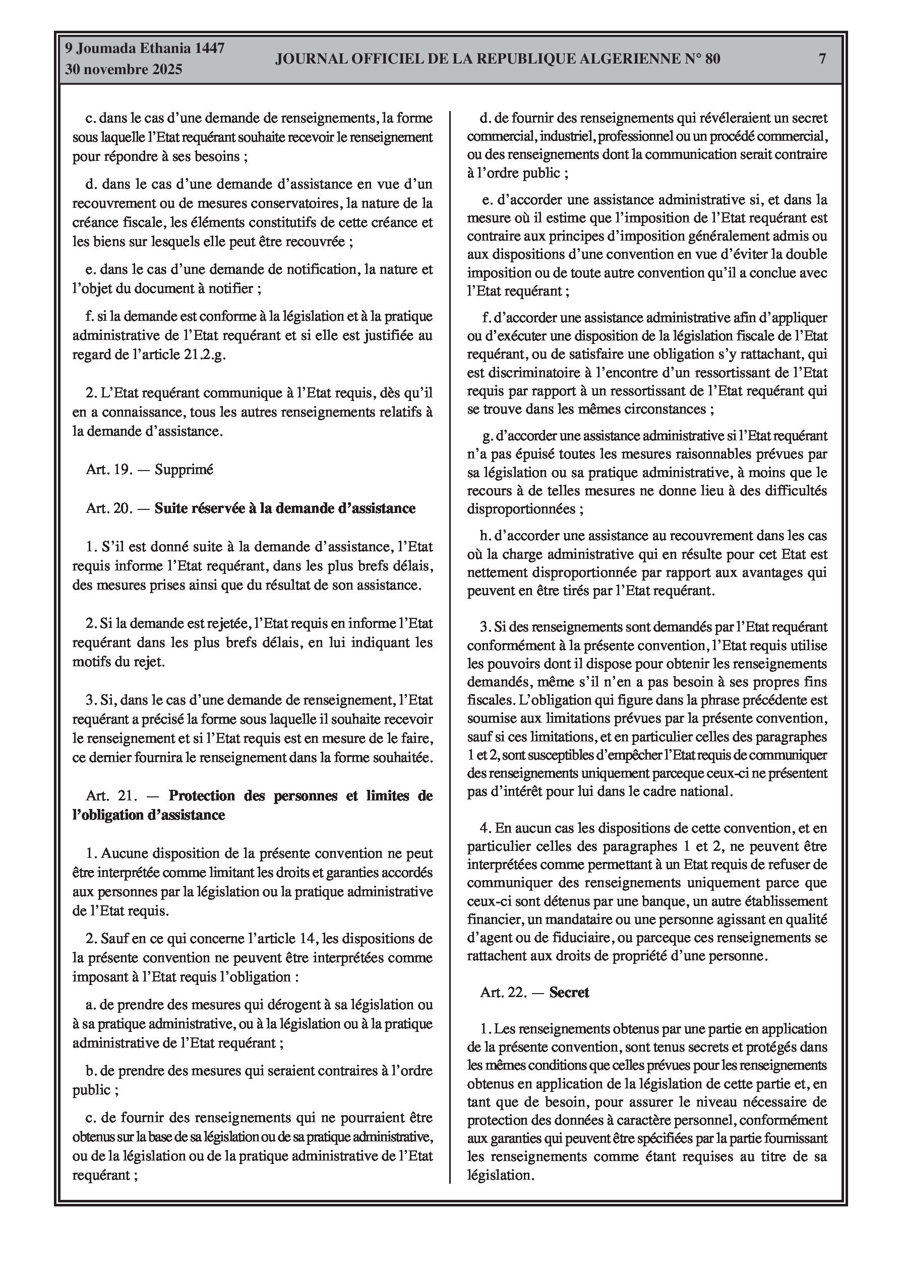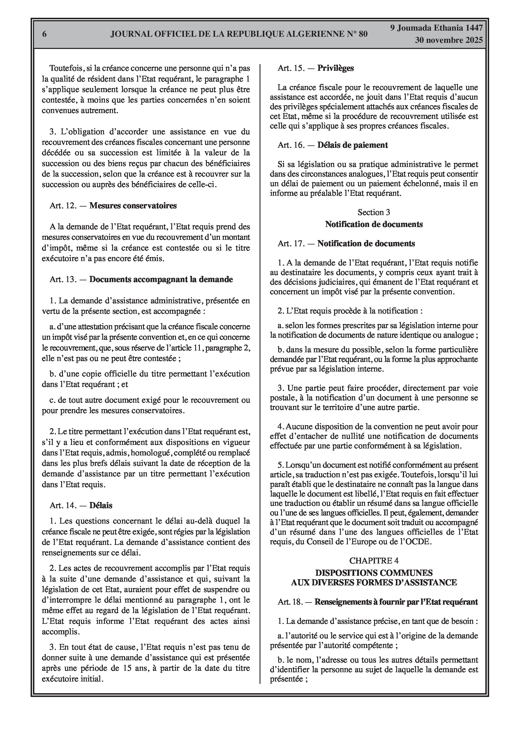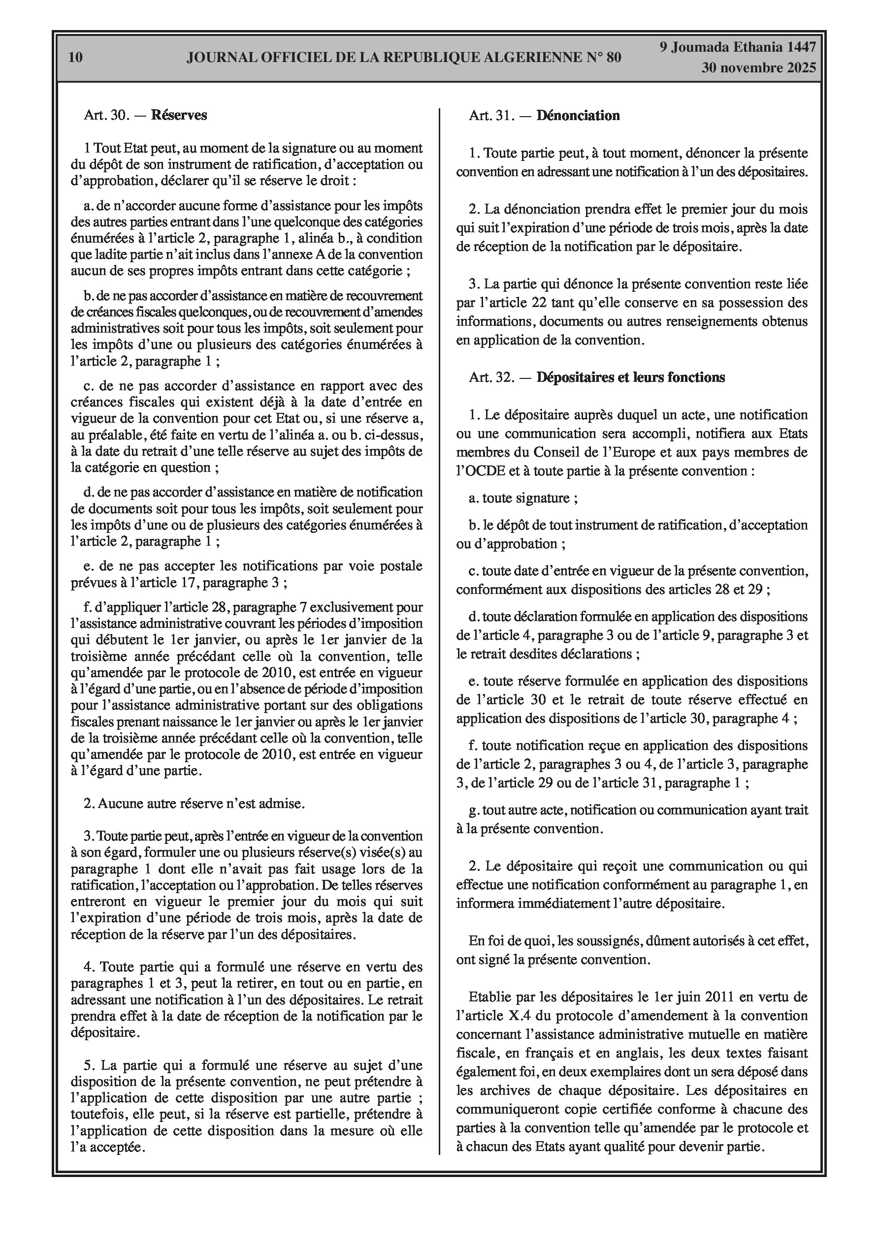 L'Algérie ratifie la convention concernant l'assistance administrative mutuelle en matière fiscale (Conseil de l'Europe/OCDE) pour renforcer la transparence.