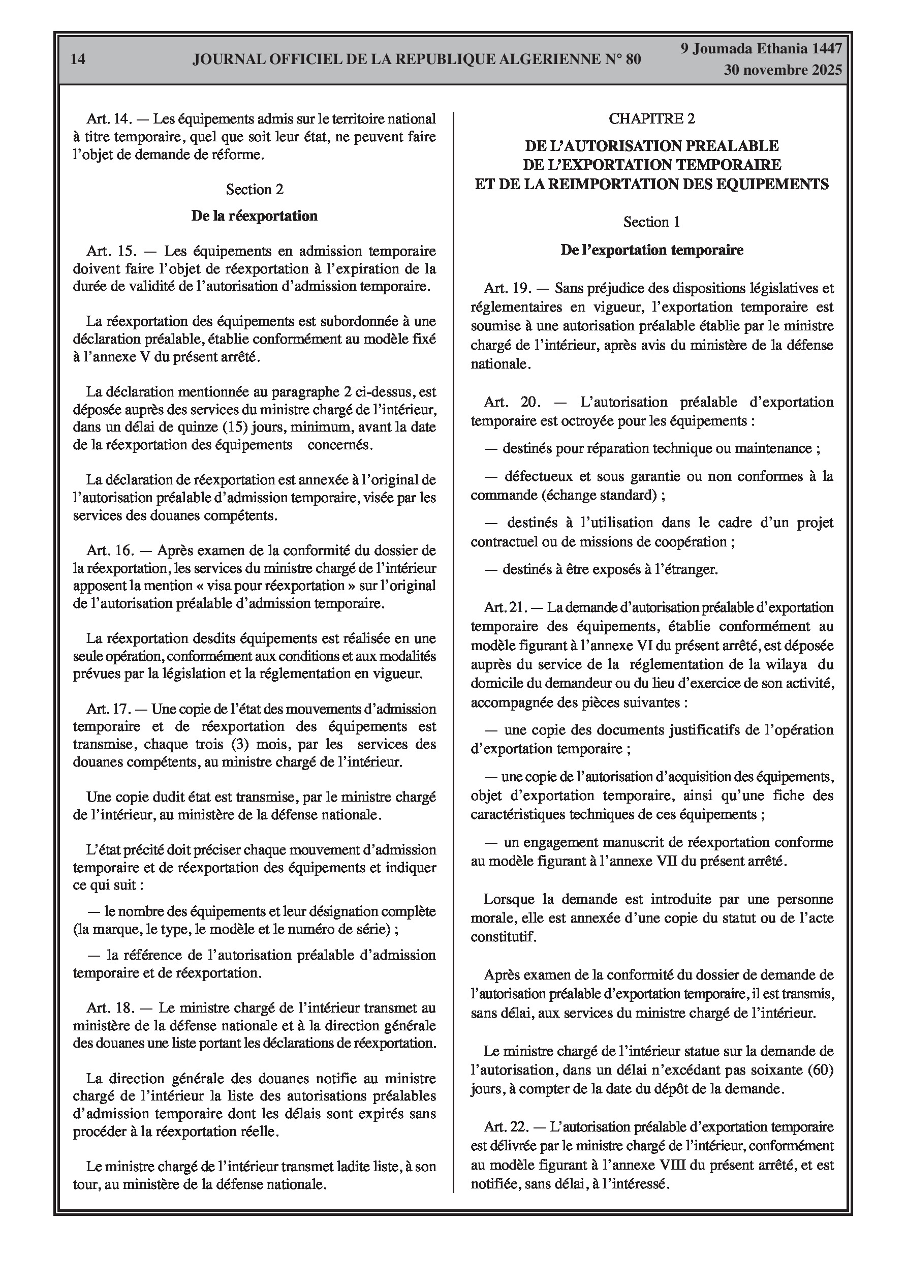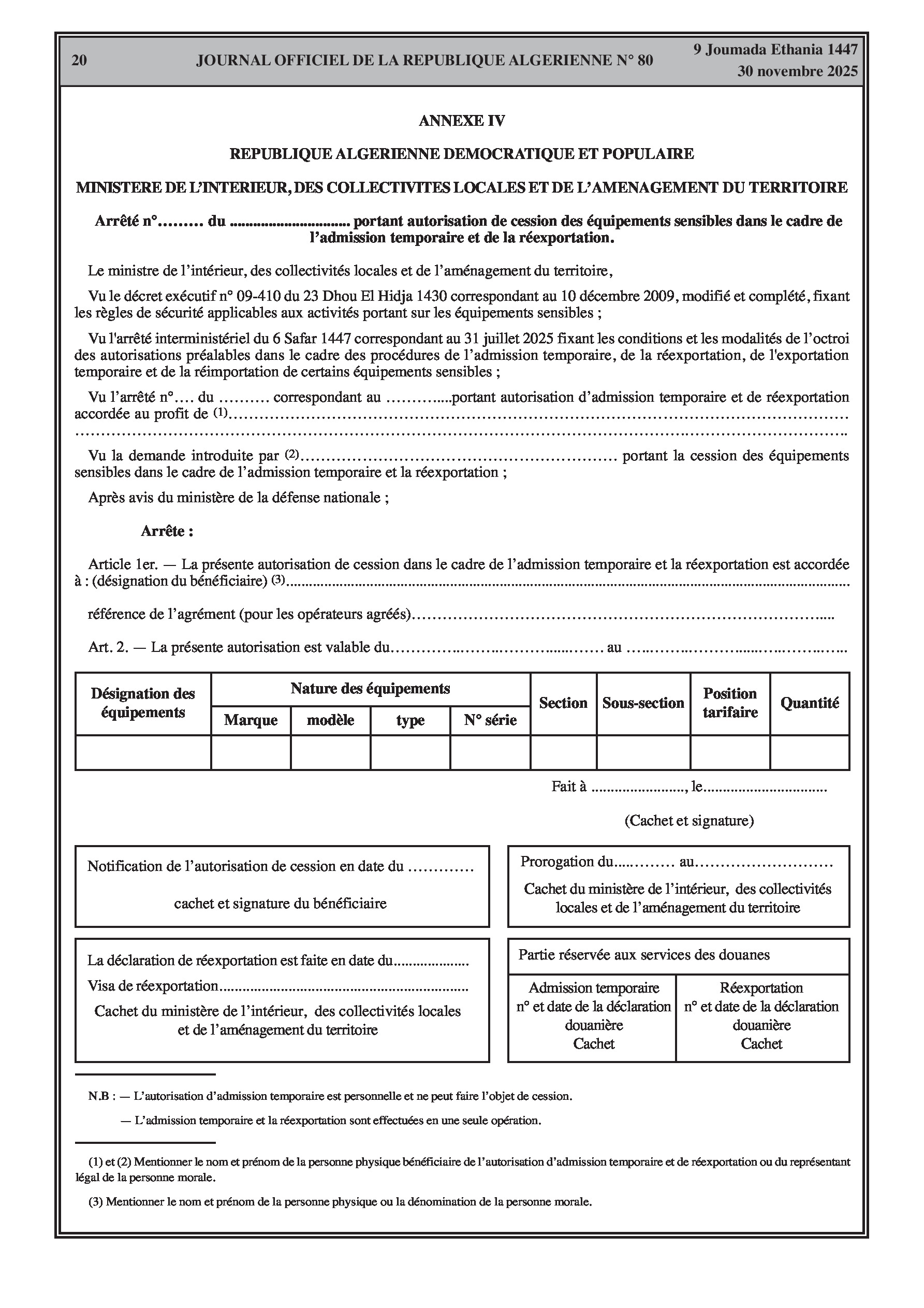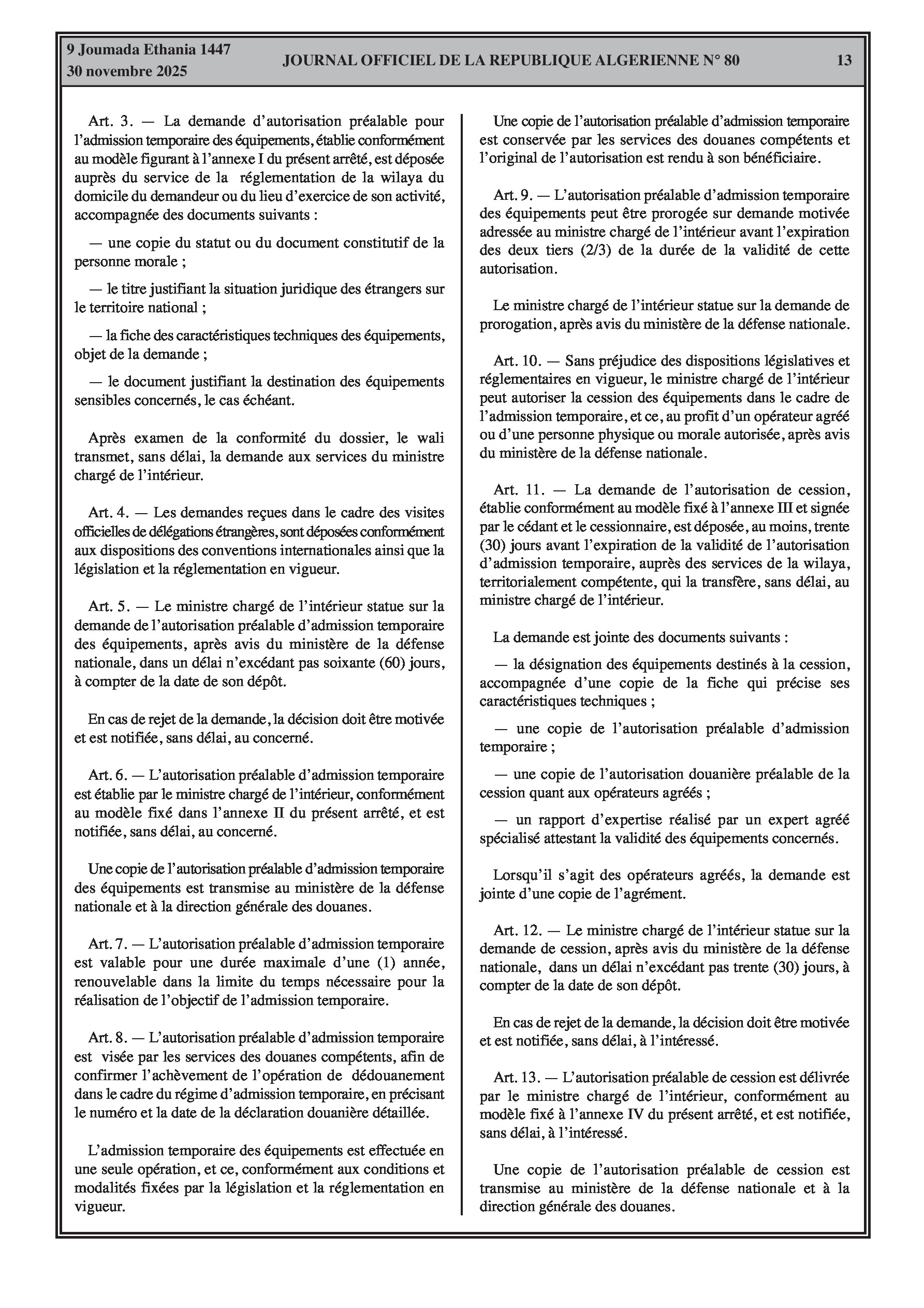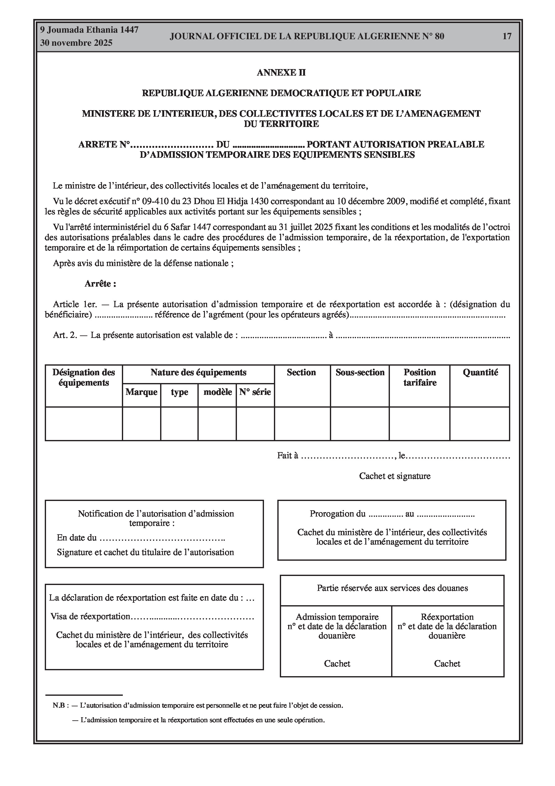 Fixation des conditions d'octroi des autorisations pour l'admission temporaire, la réexportation et l'exportation temporaire des équipements sensibles.