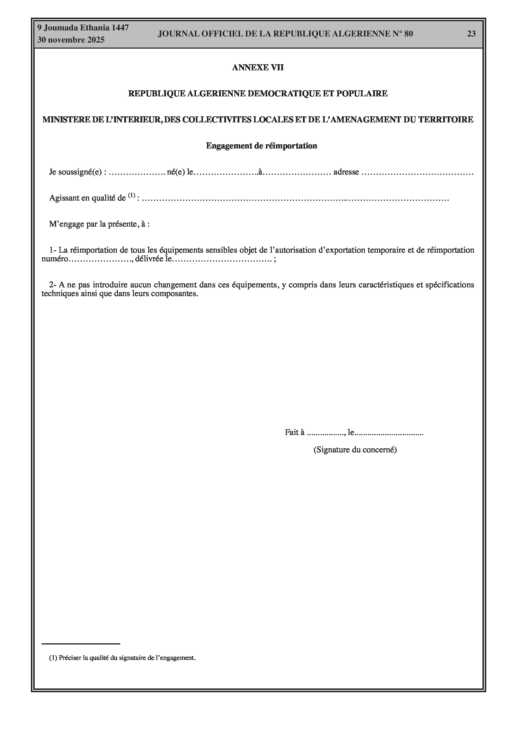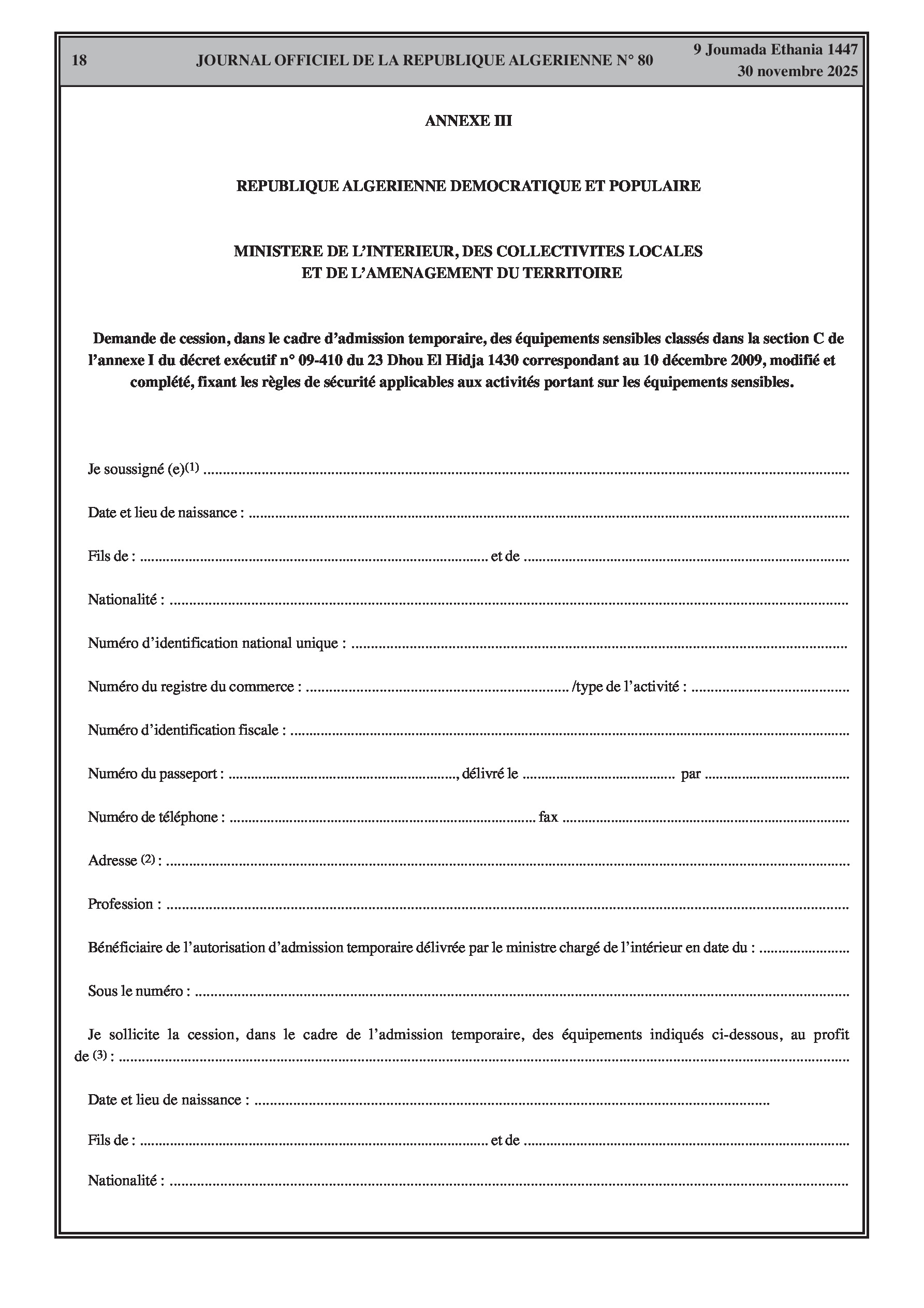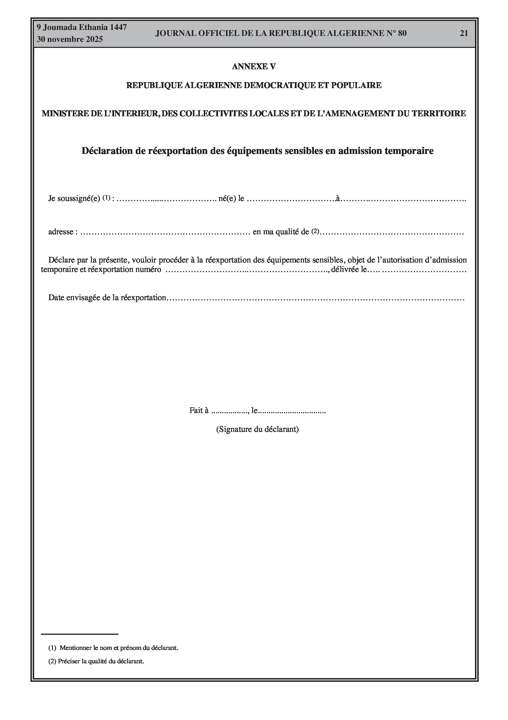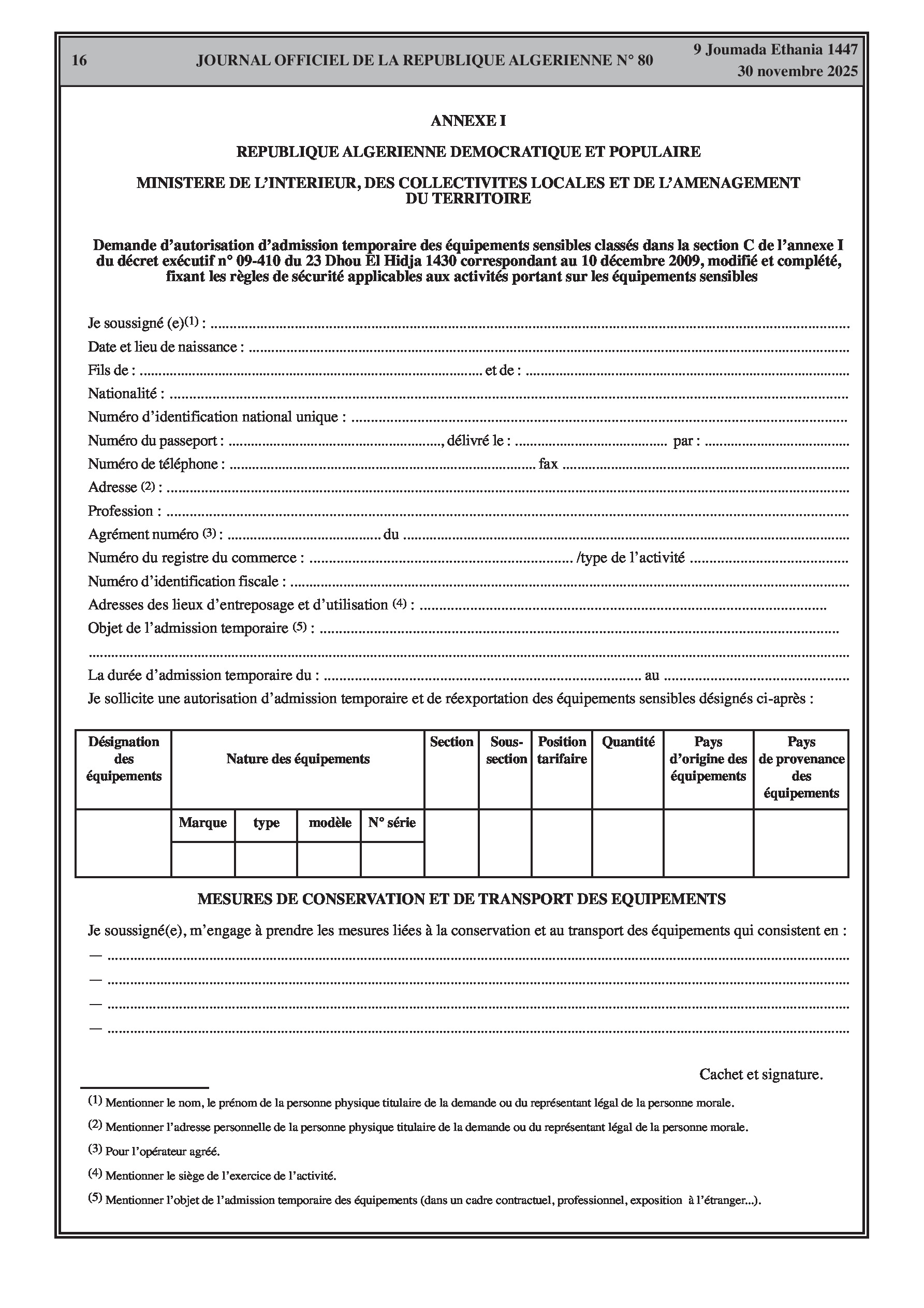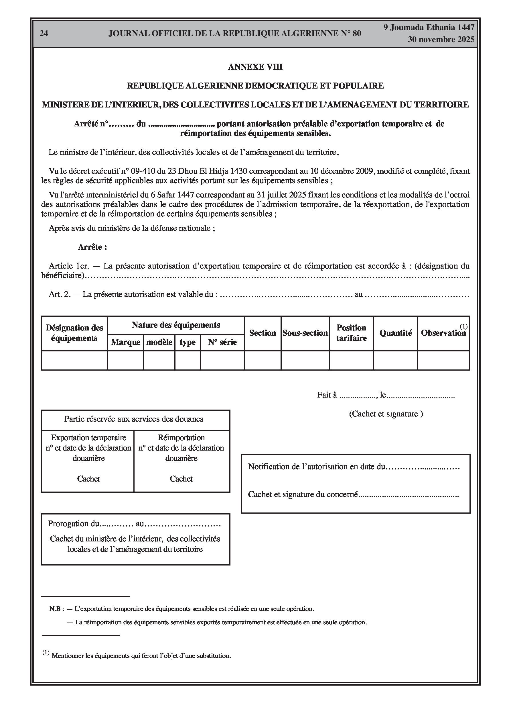 Fixation des conditions d'octroi des autorisations pour l'admission temporaire, la réexportation et l'exportation temporaire des équipements sensibles.