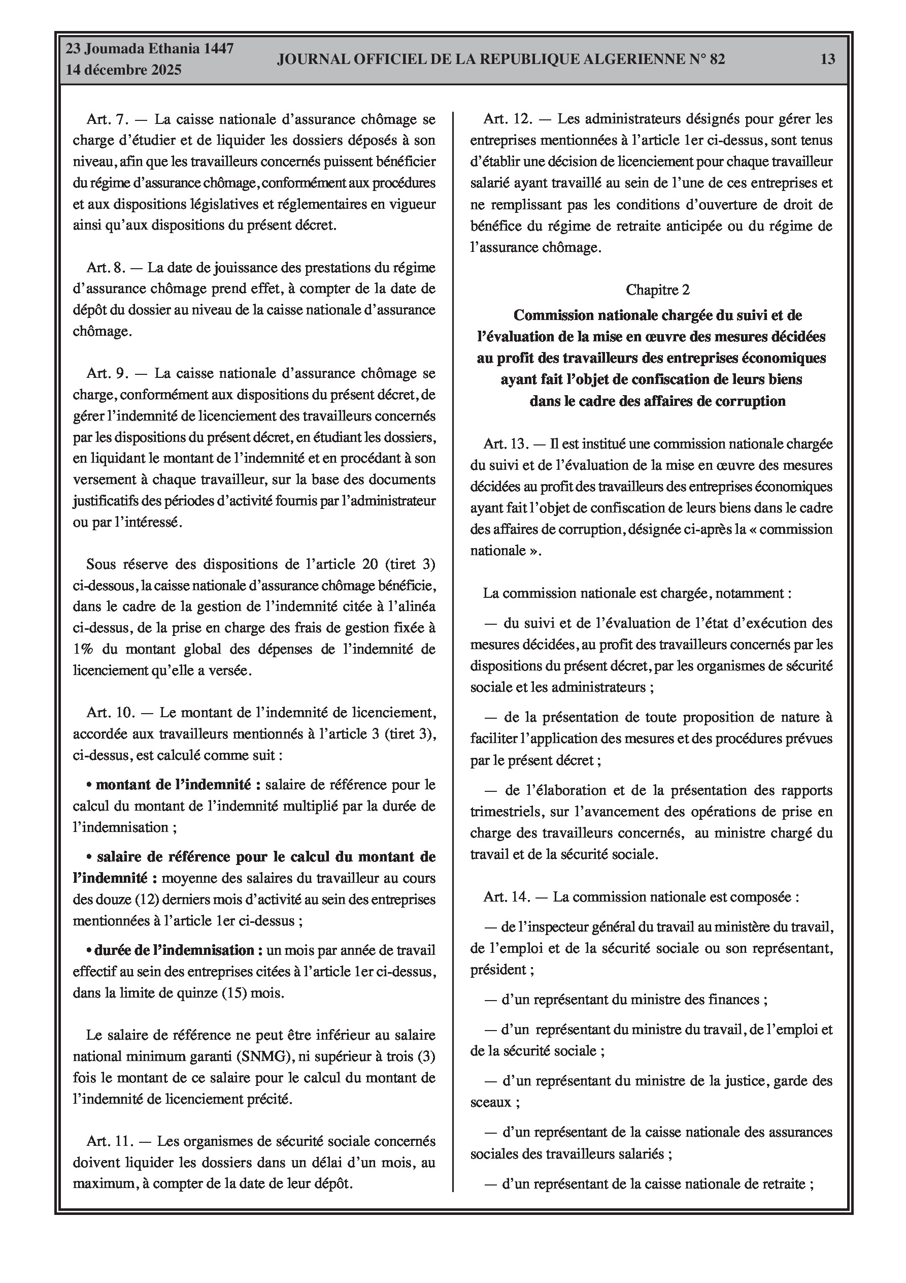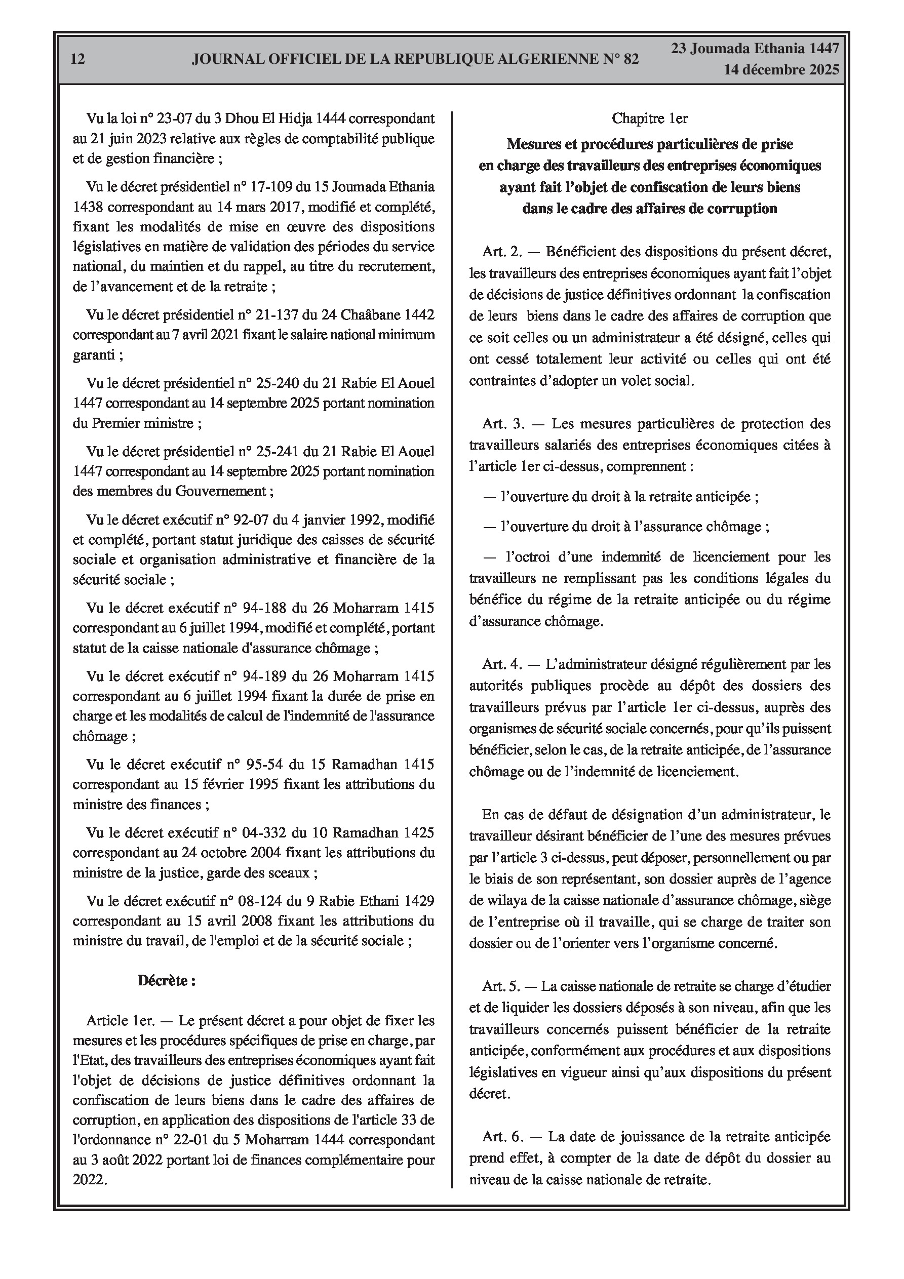 Décret exécutif fixant les mesures de prise en charge par l'État des travailleurs des entreprises dont les biens ont été définitivement confisqués, assurant leur stabilité sociale et professionnelle.