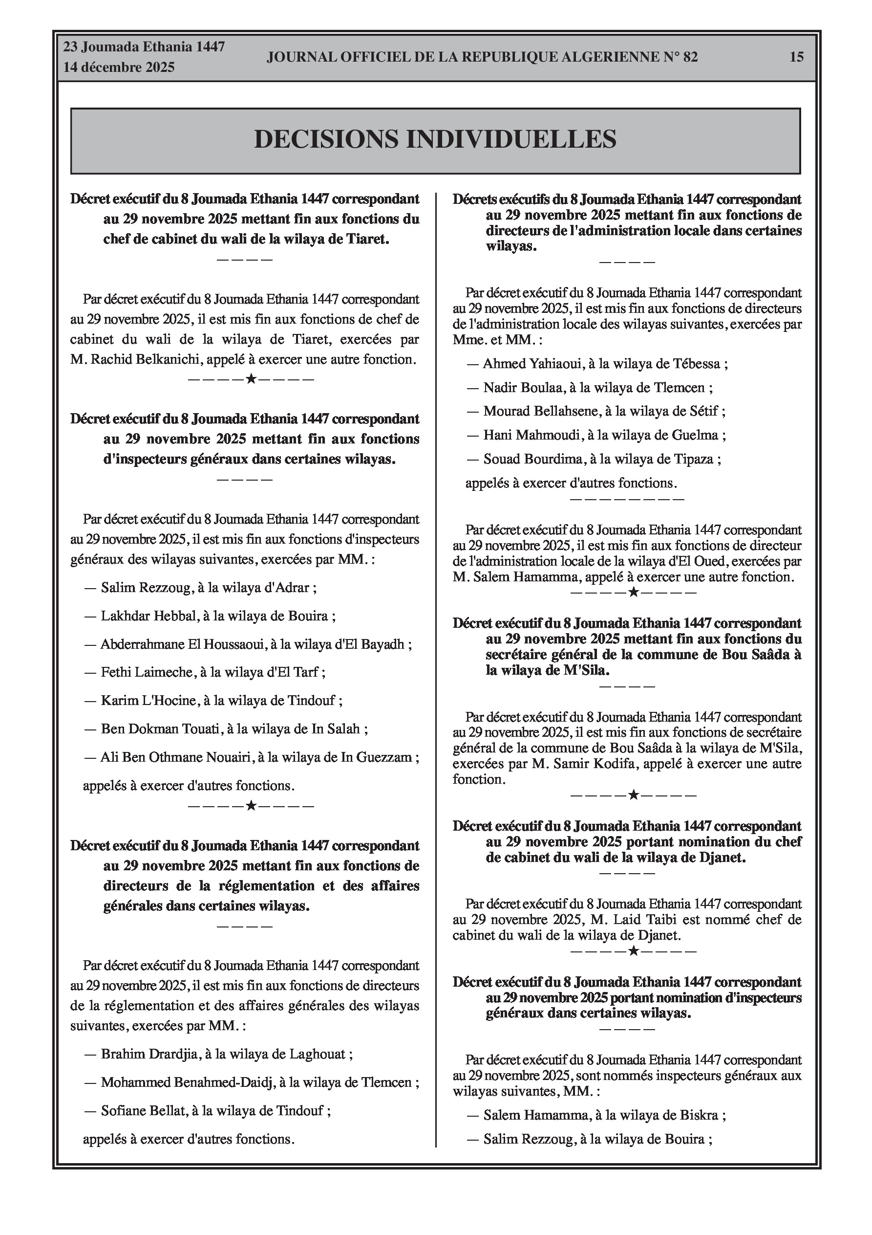 Décrets portant mouvement parmi les chefs de cabinet, inspecteurs généraux, et directeurs de la réglementation et de l'administration locale dans plusieurs wilayas.