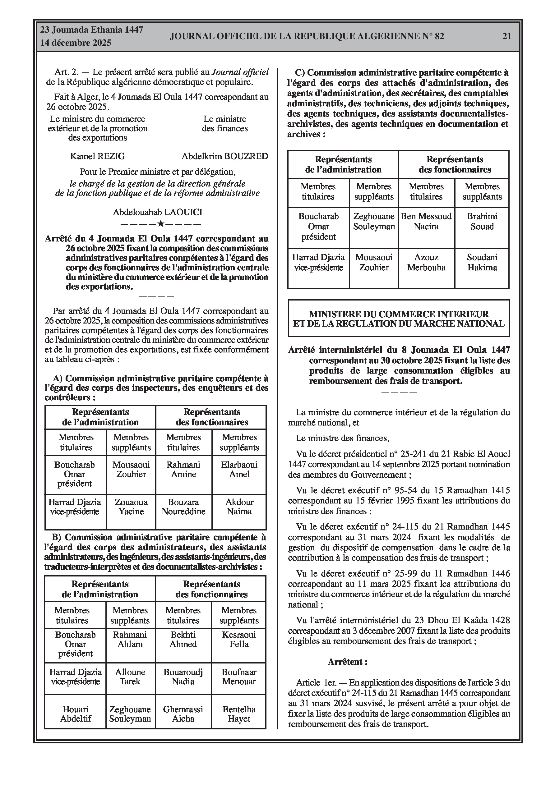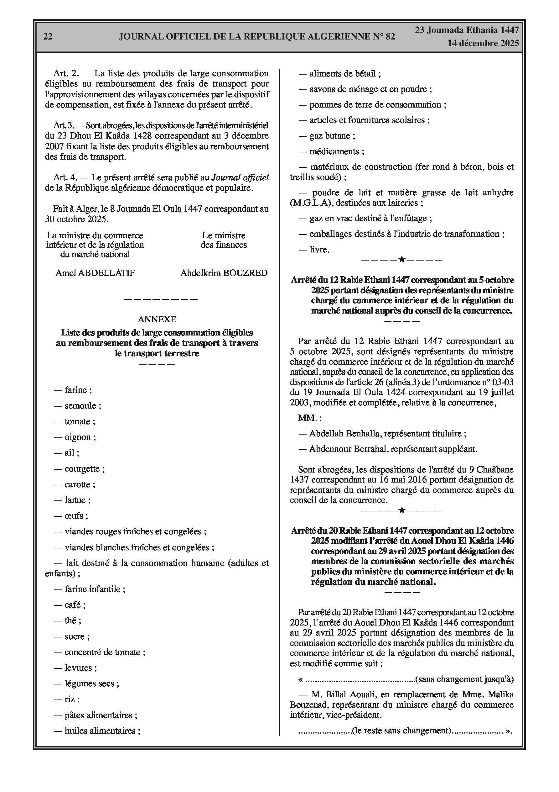 Fixation de la liste des produits de large consommation dont les frais de transport sont remboursés pour assurer l'approvisionnement des wilayas concernées (Sud et Hauts-Plateaux).