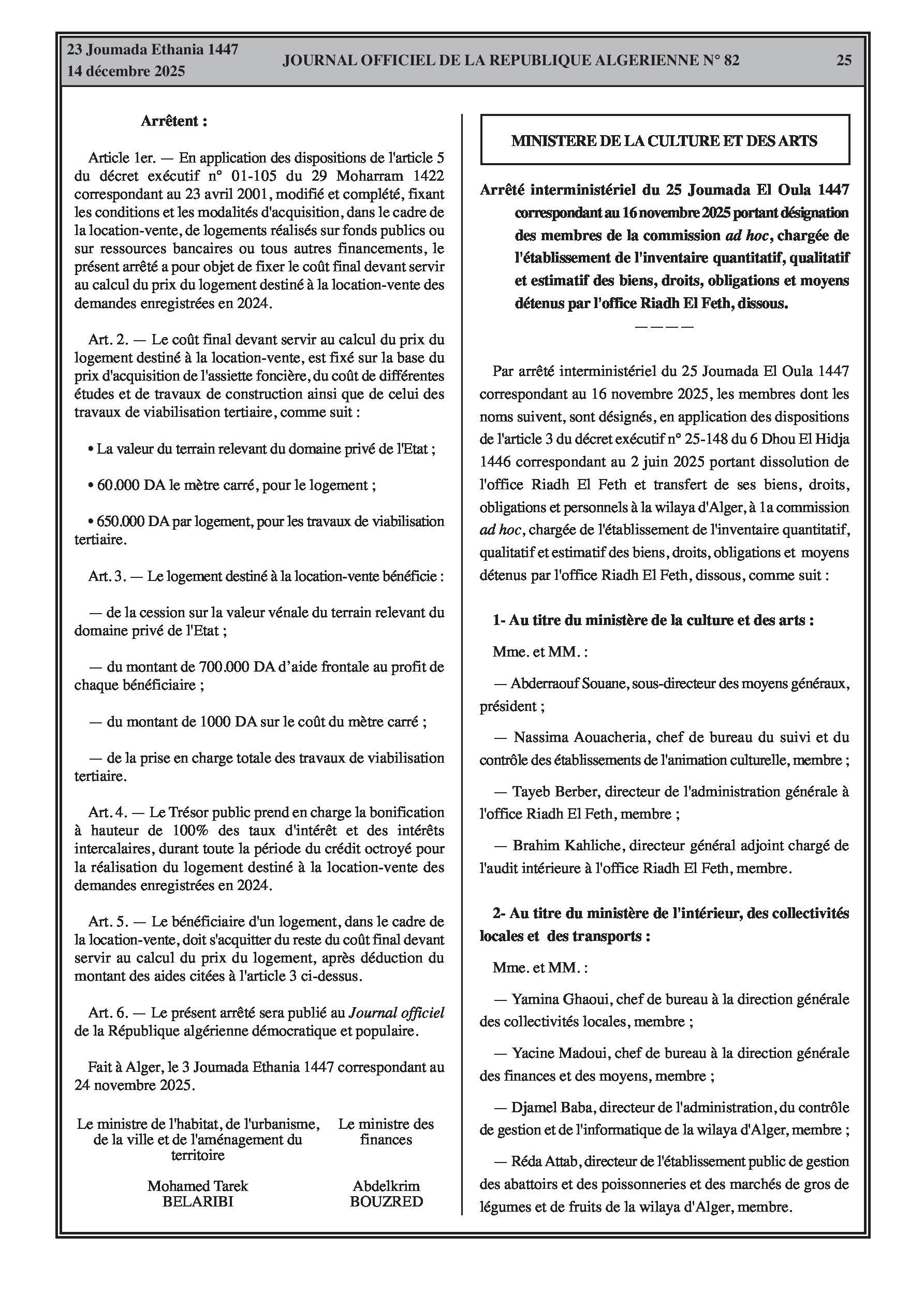 2. Fixation du coût final des logements location-vente (AADL) pour les inscrits de 2024