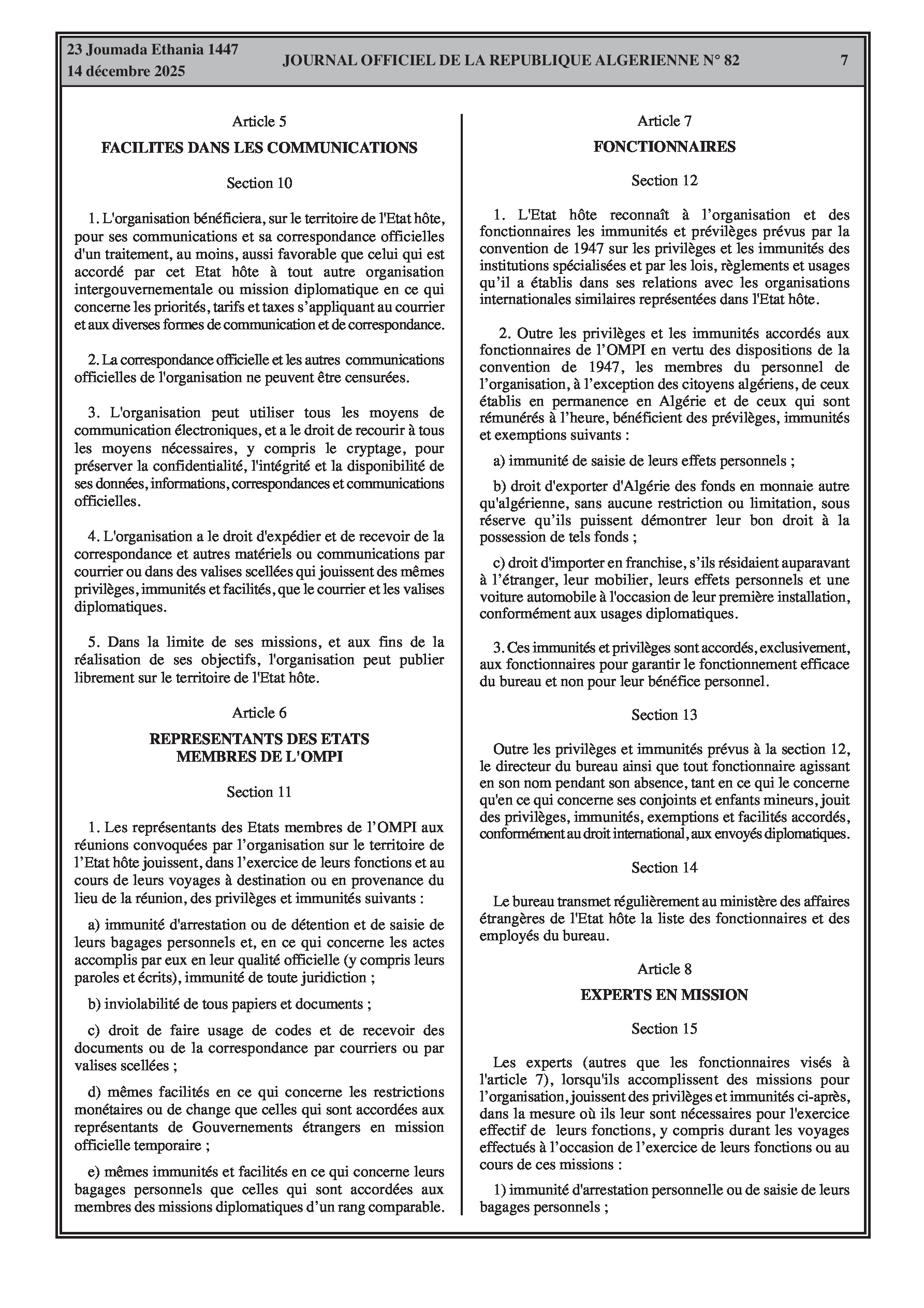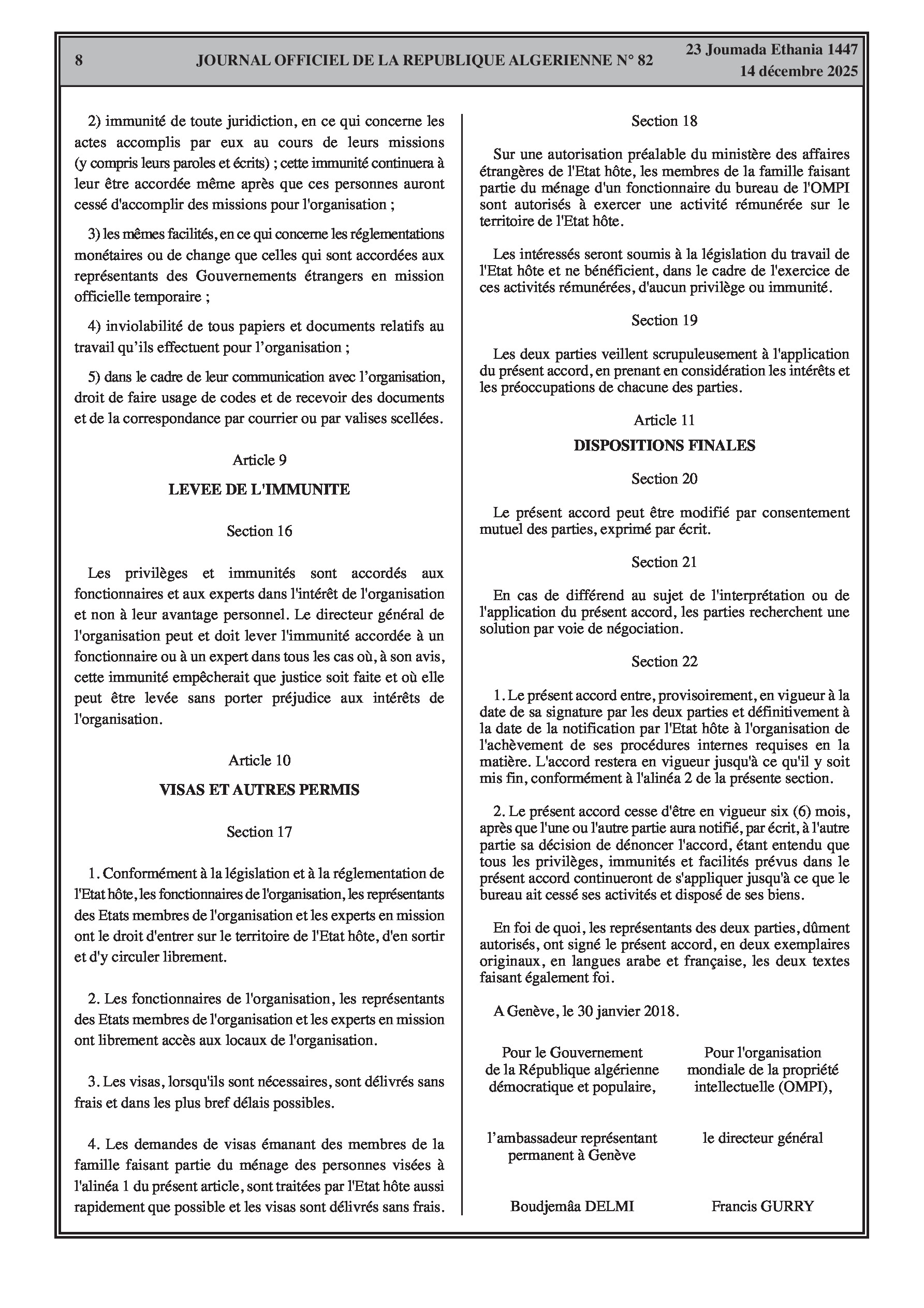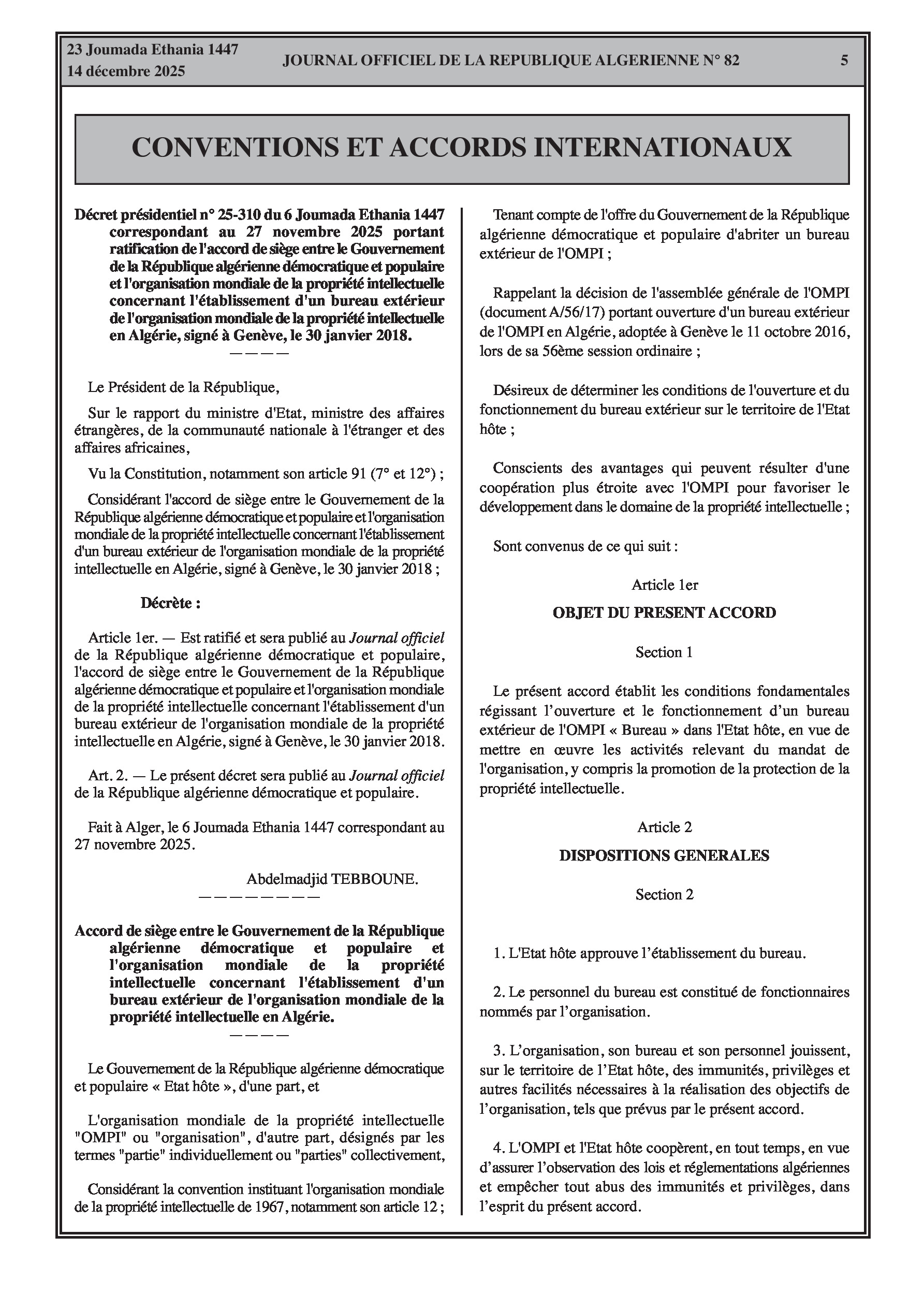 Ratification de l'accord de siège entre l'Algérie et l'Organisation Mondiale de la Propriété Intellectuelle pour l'établissement d'un bureau extérieur en Algérie.