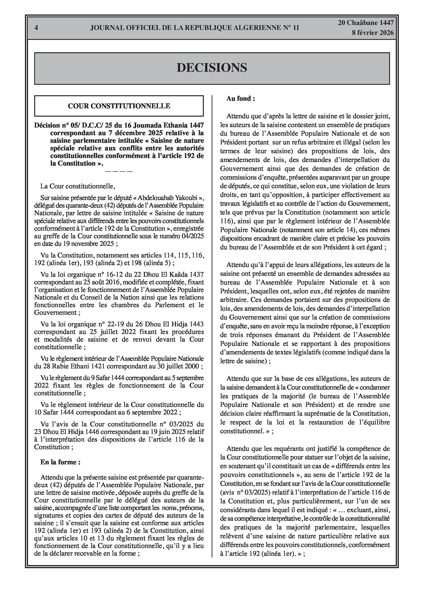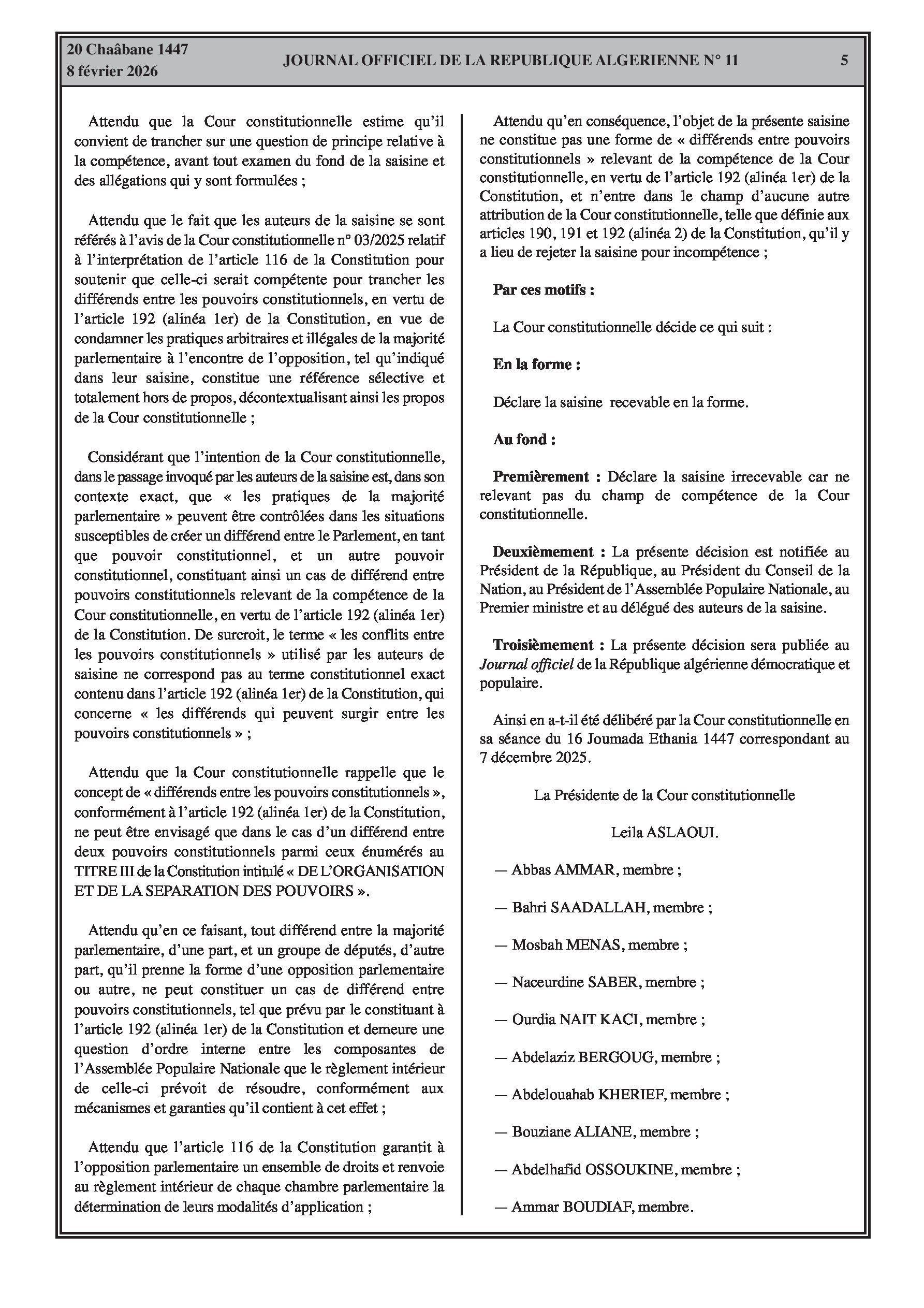 La Cour constitutionnelle rejette une saisine de députés concernant des différends avec le bureau de l'APN pour incompétence.