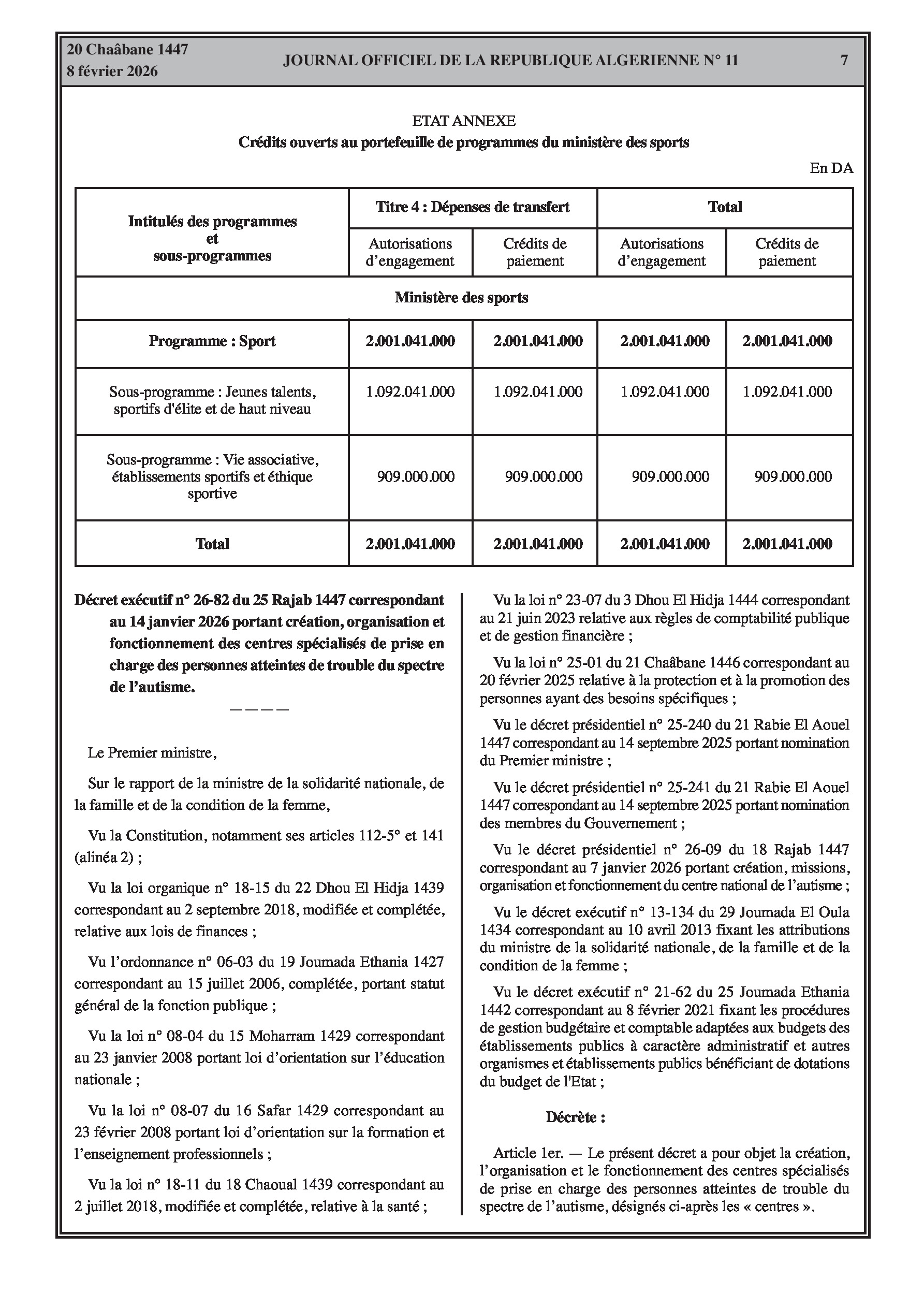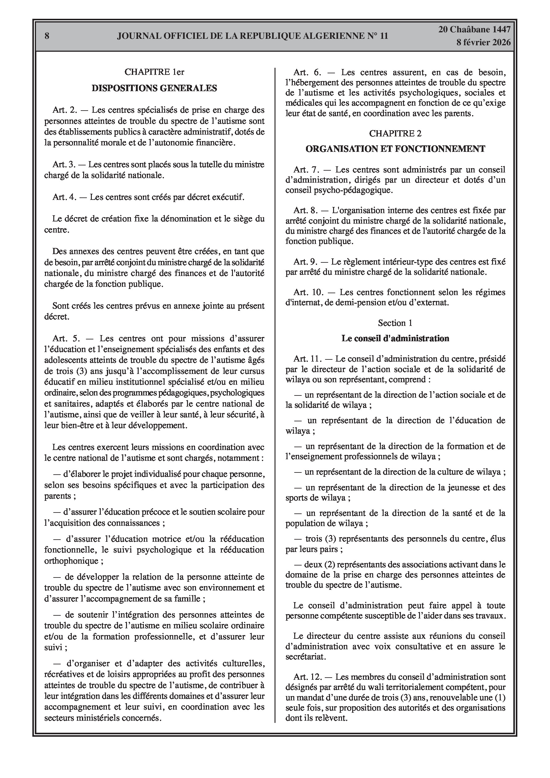 Décret exécutif n° 26-83 : Création du Conseil national des personnes aux besoins spécifiques, organe consultatif pour les politiques de protection et d'insertion.