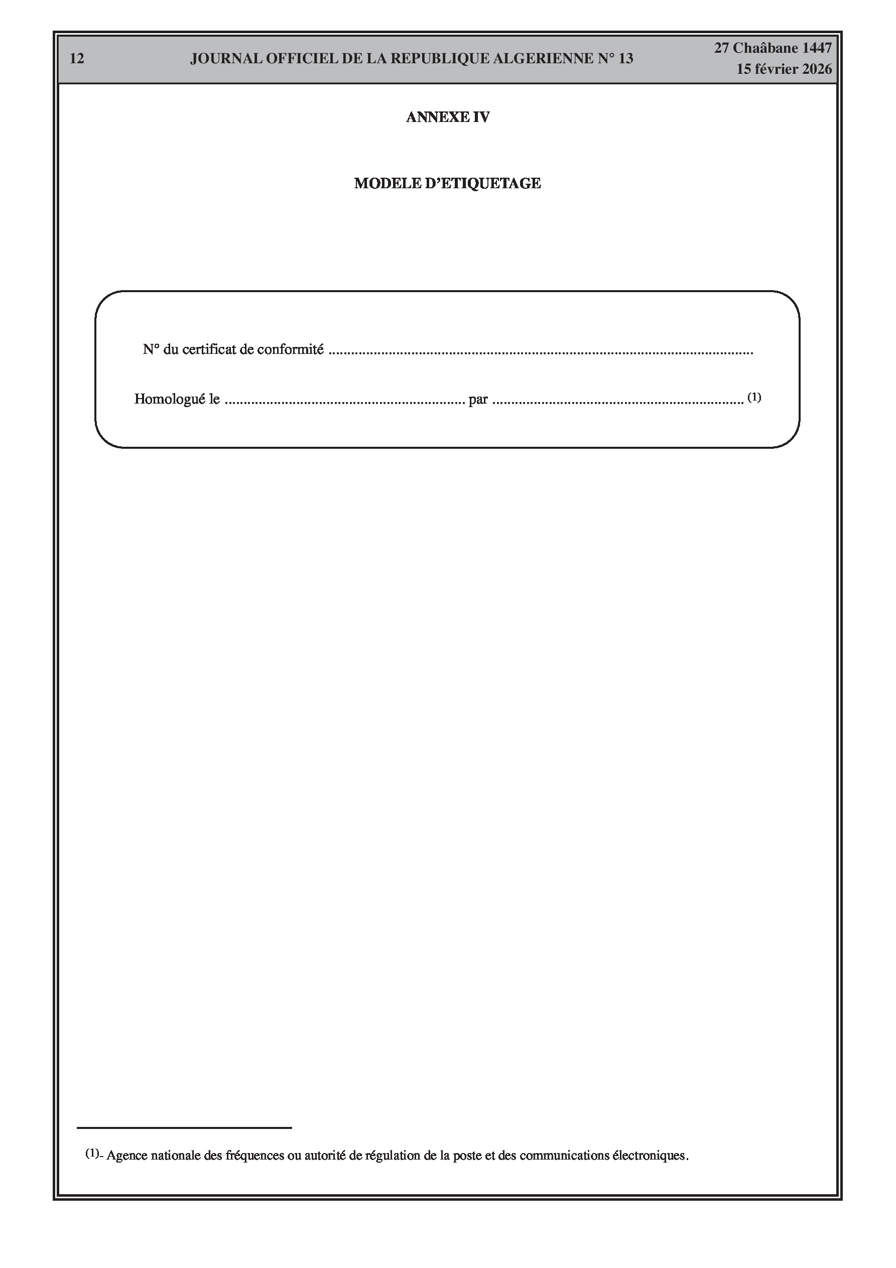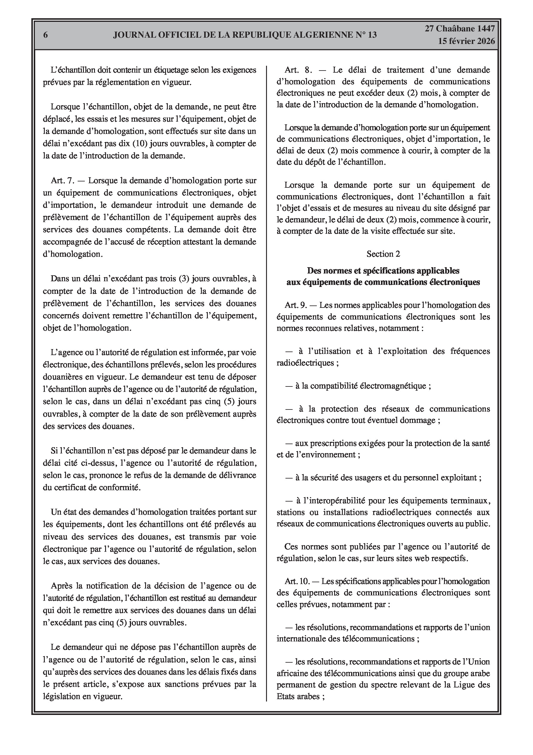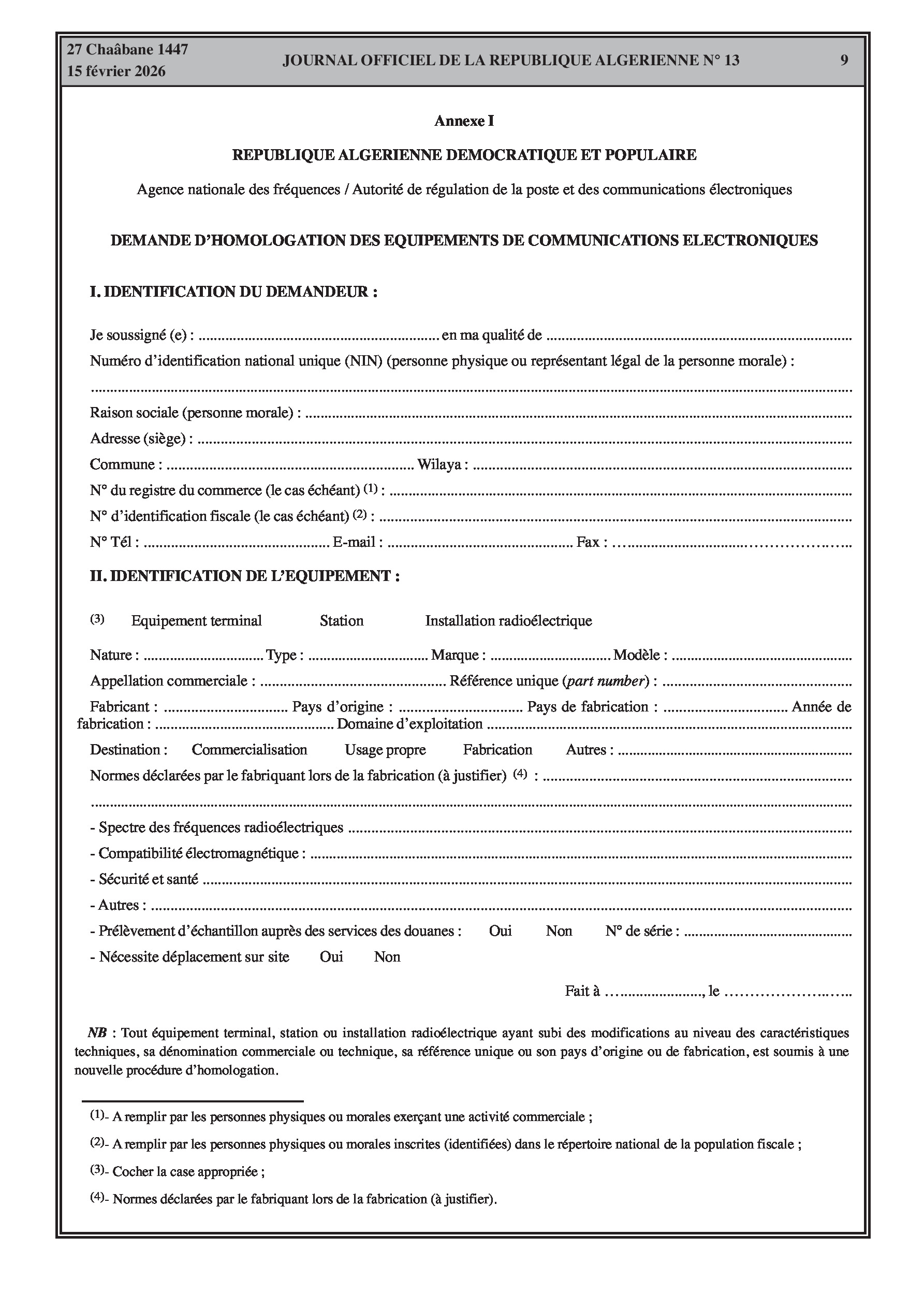 Fixation des conditions et modalités d'homologation des équipements de communications avant leur importation ou vente.