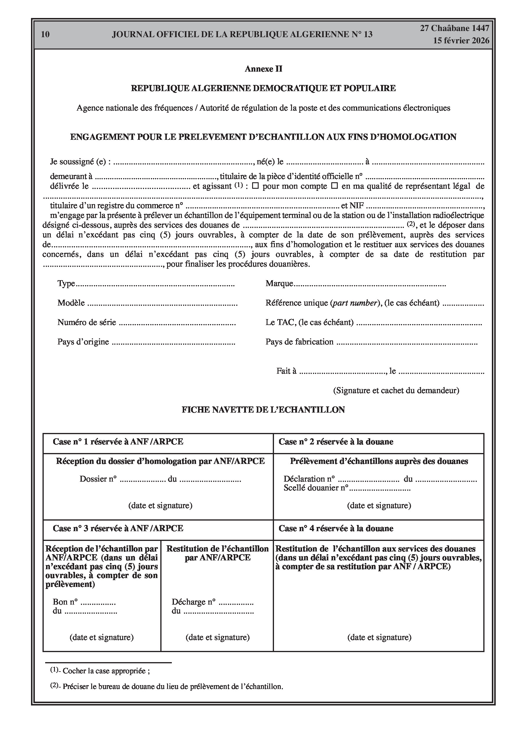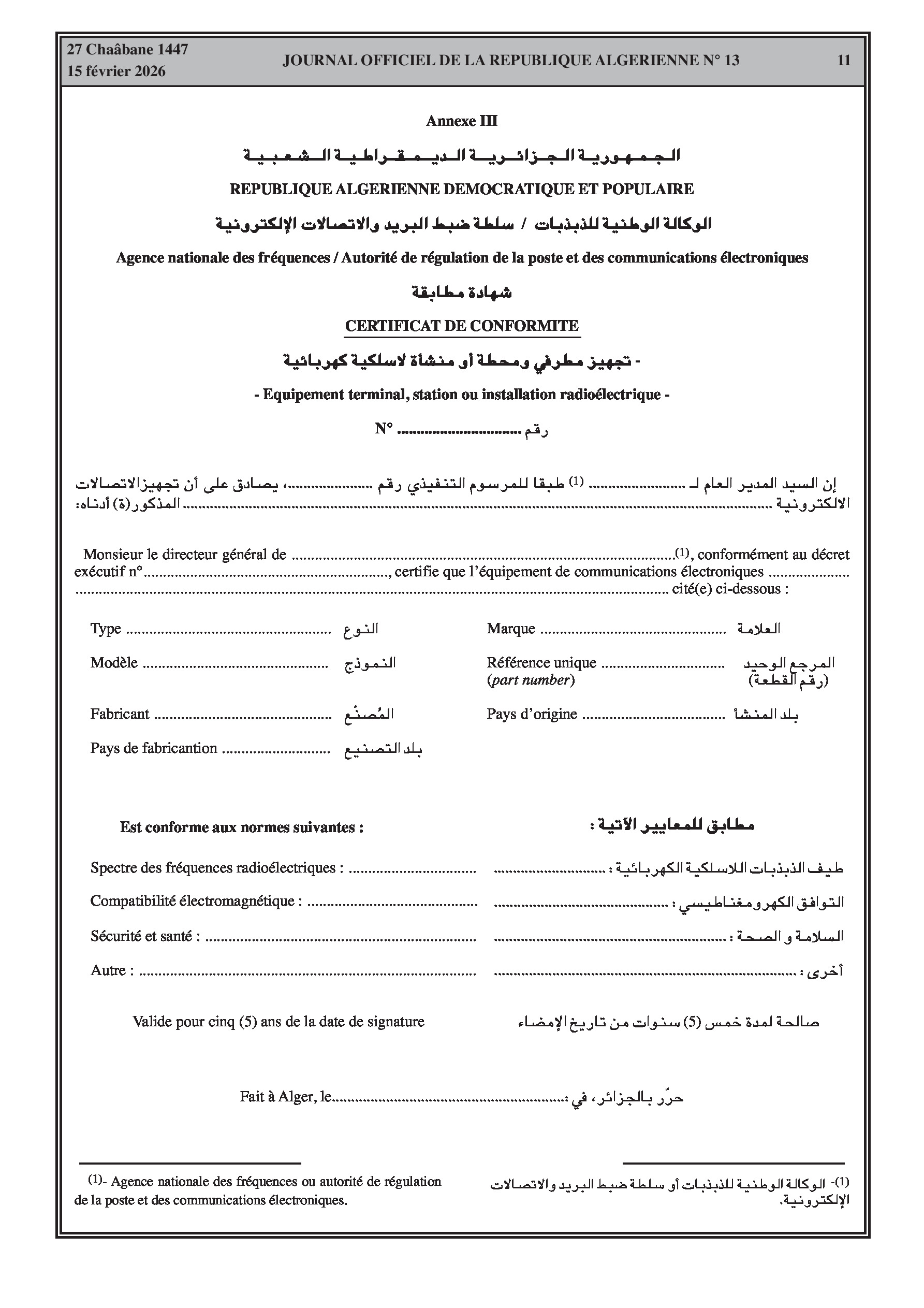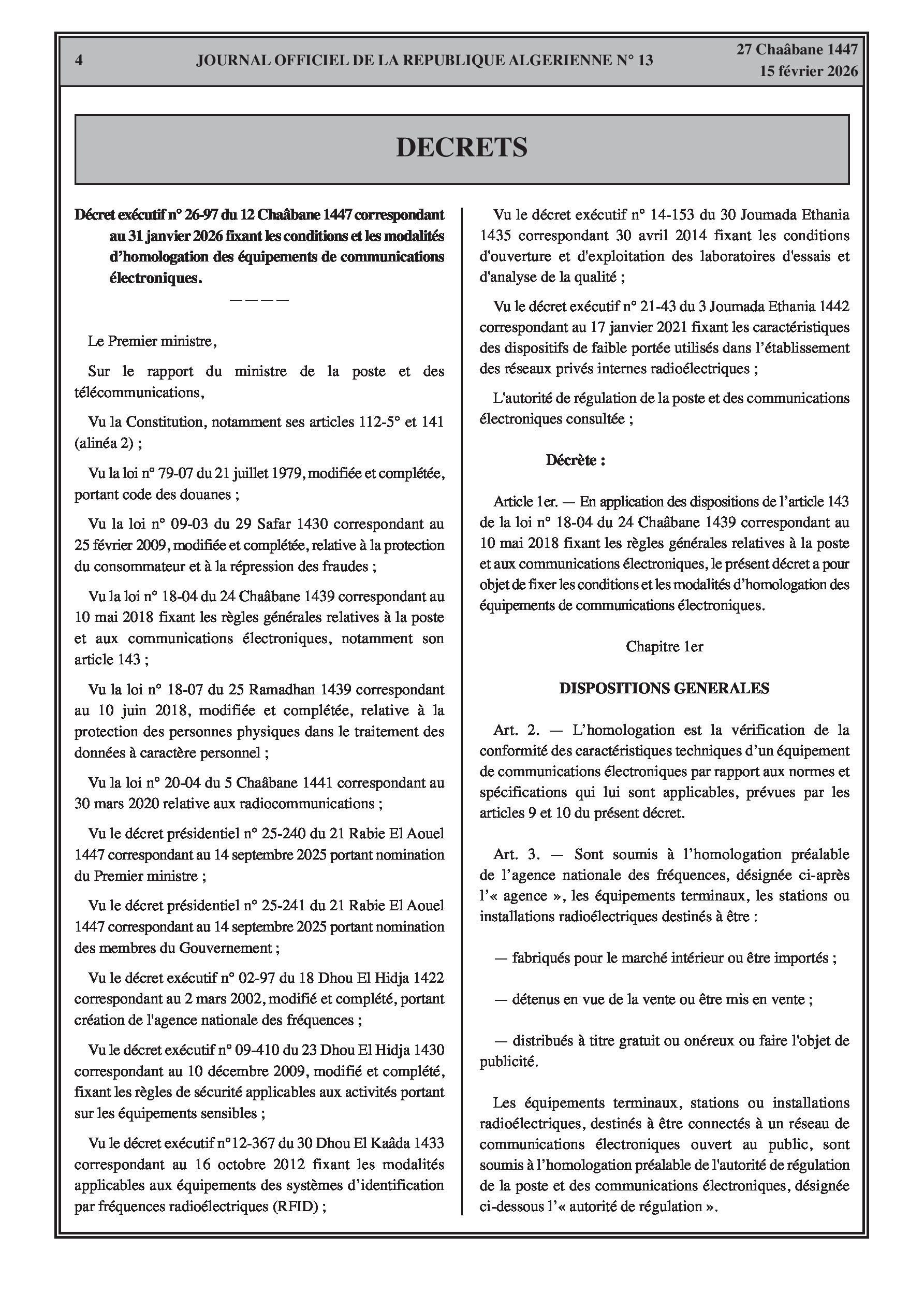 Fixation des conditions et modalités d'homologation des équipements de communications avant leur importation ou vente.