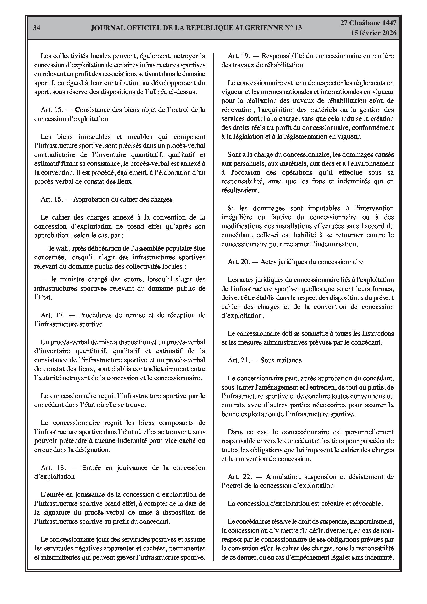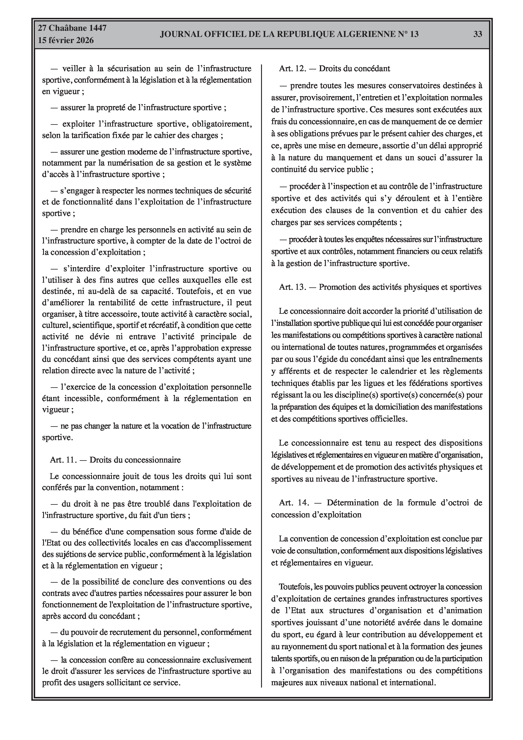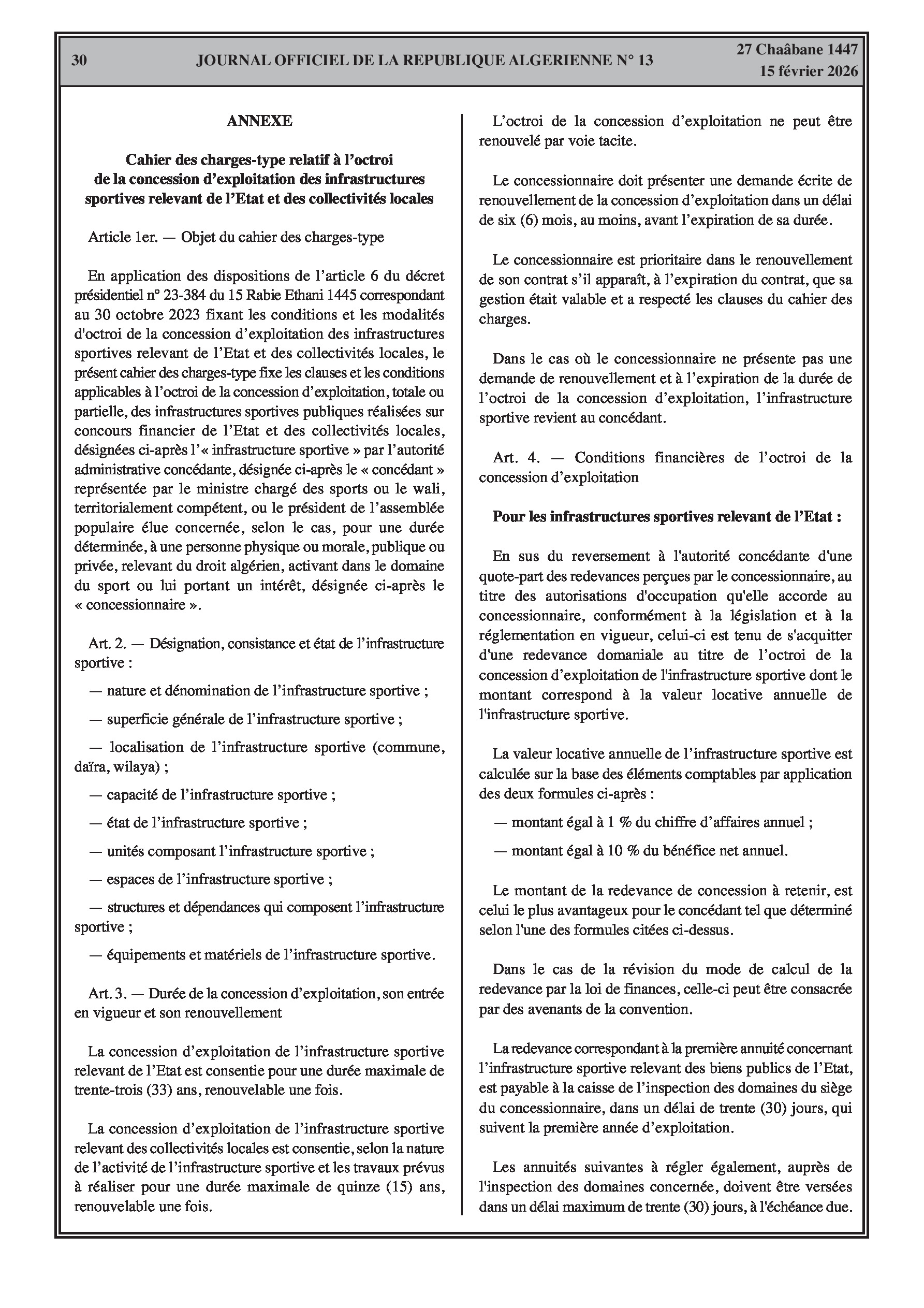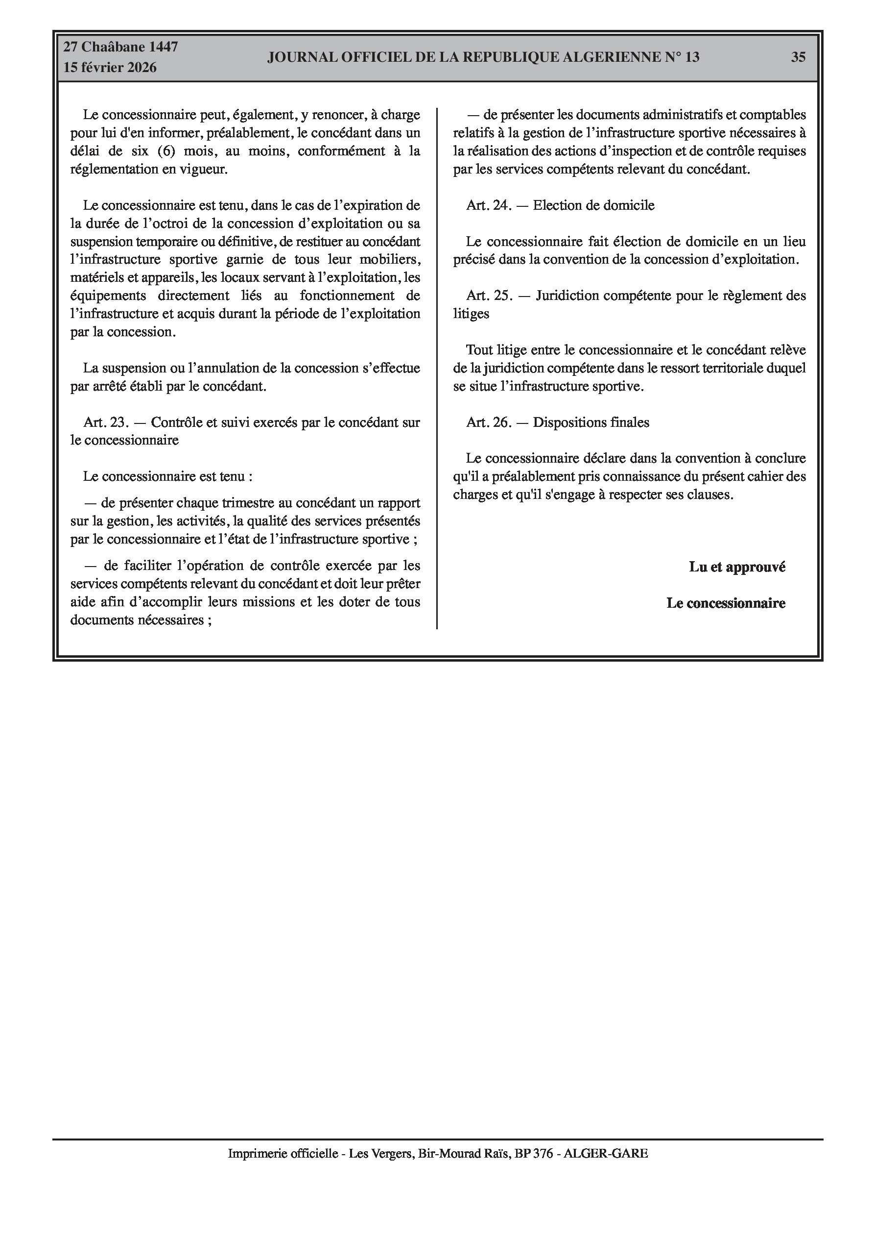 Nouveau cahier des charges fixant les modalités de concession de la gestion des infrastructures sportives publiques au privé ou associations.