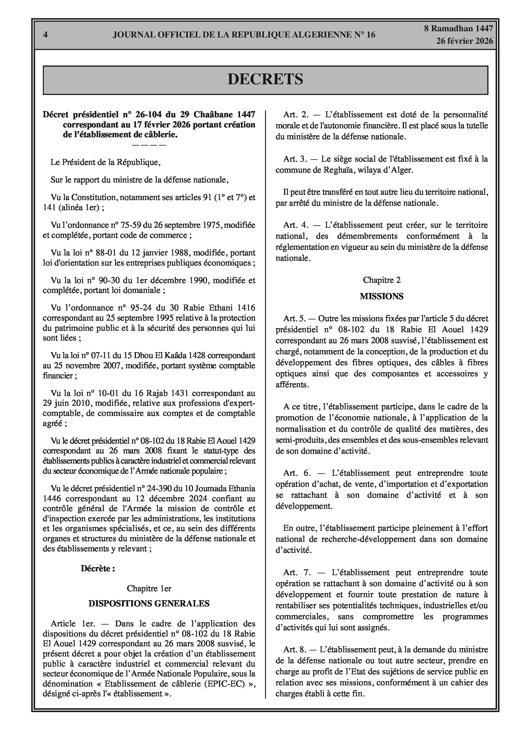 Décrets présidentiels portant création de trois établissements publics à caractère industriel et commercial sous la tutelle du ministère de la Défense nationale.