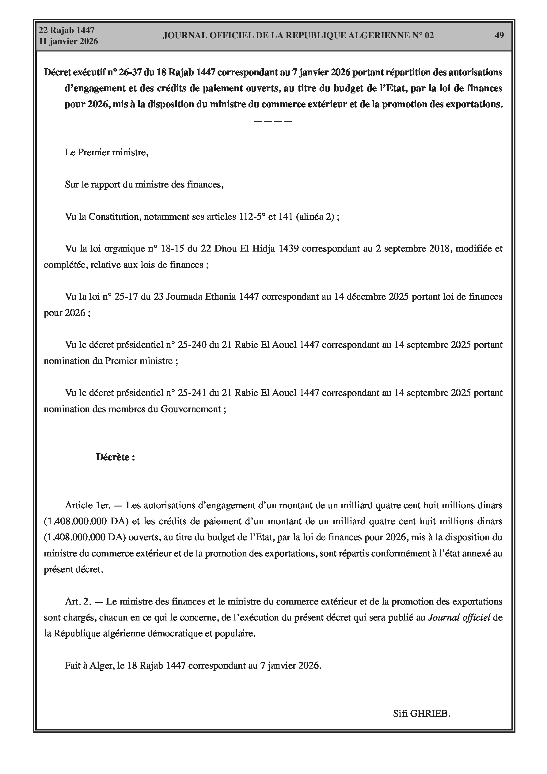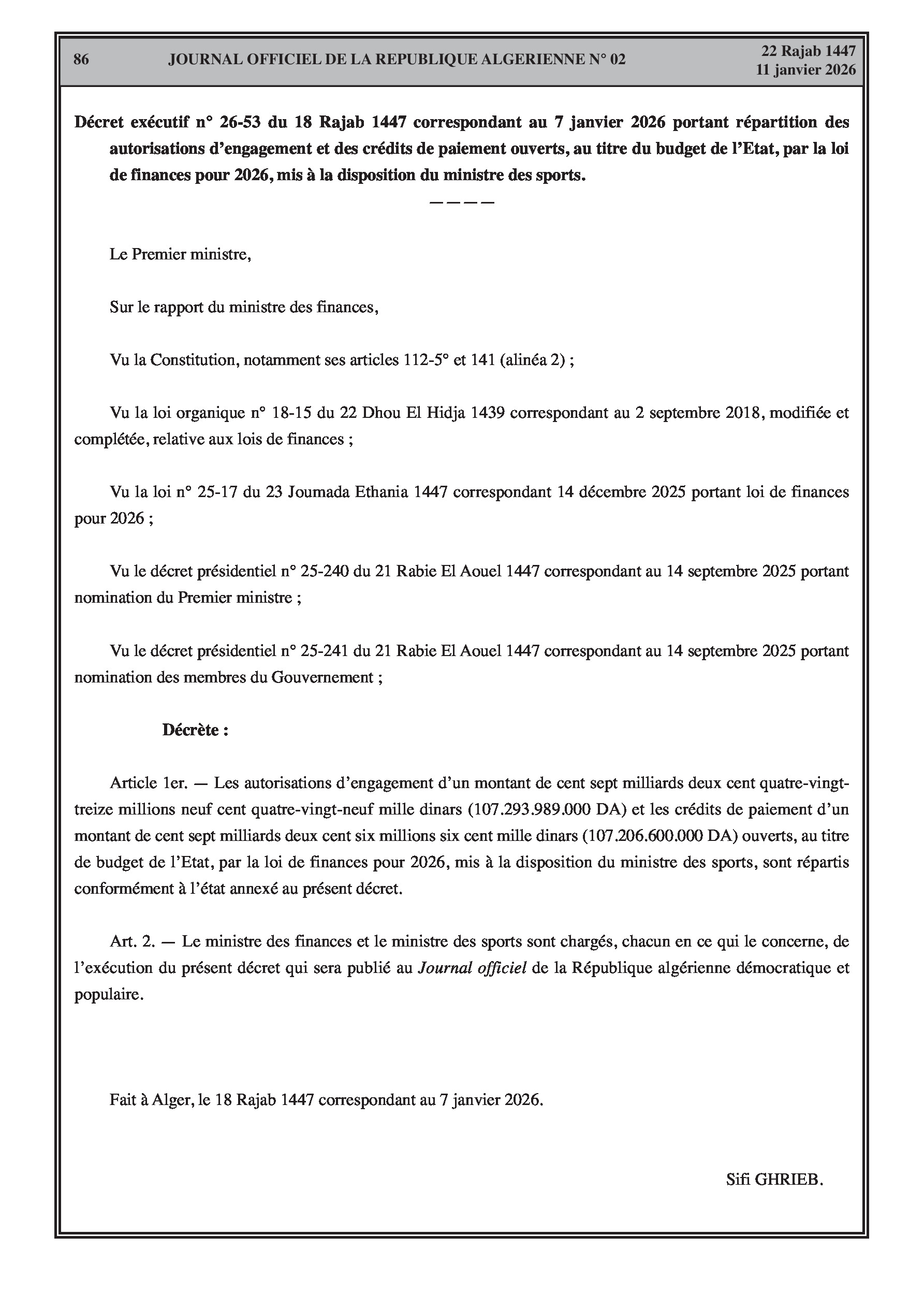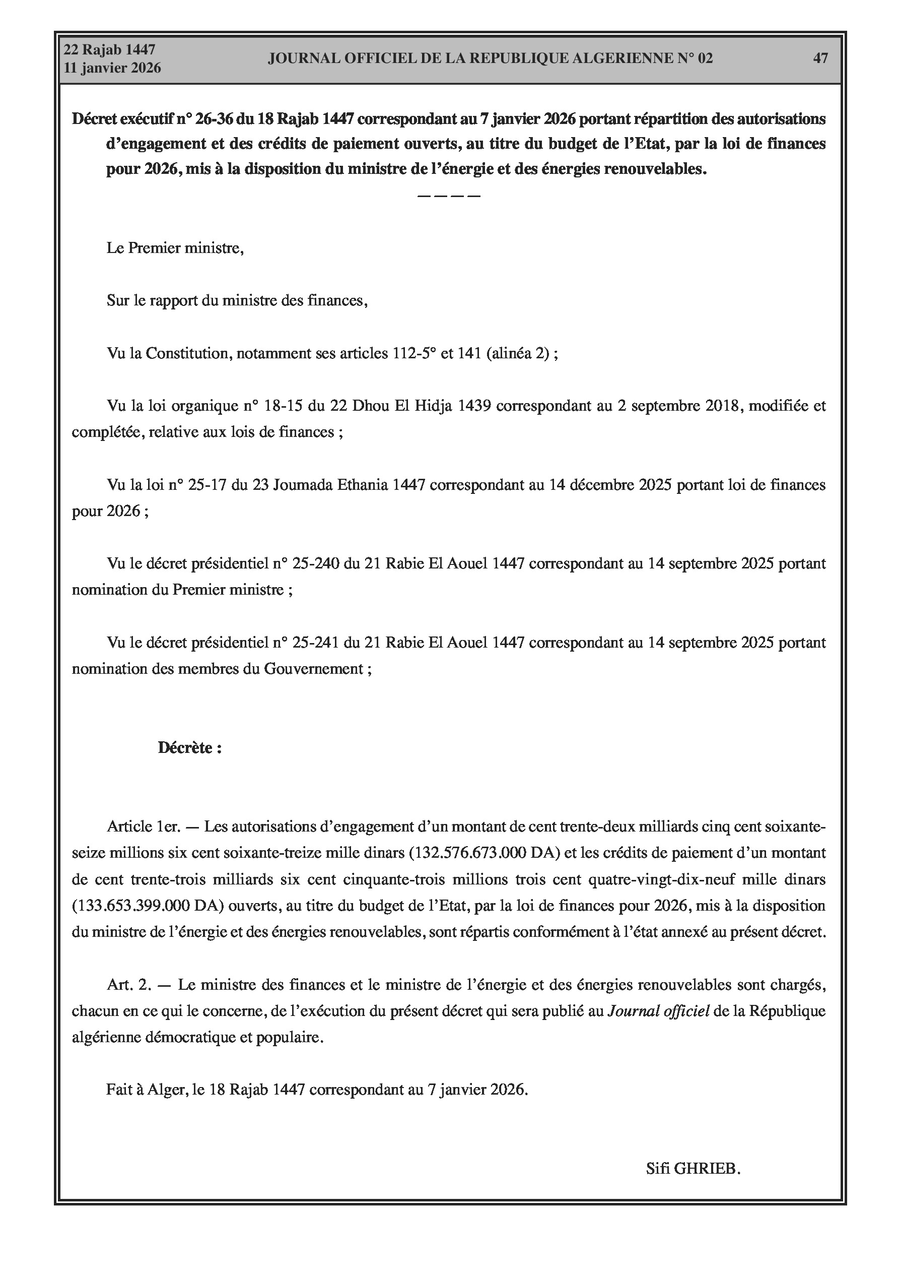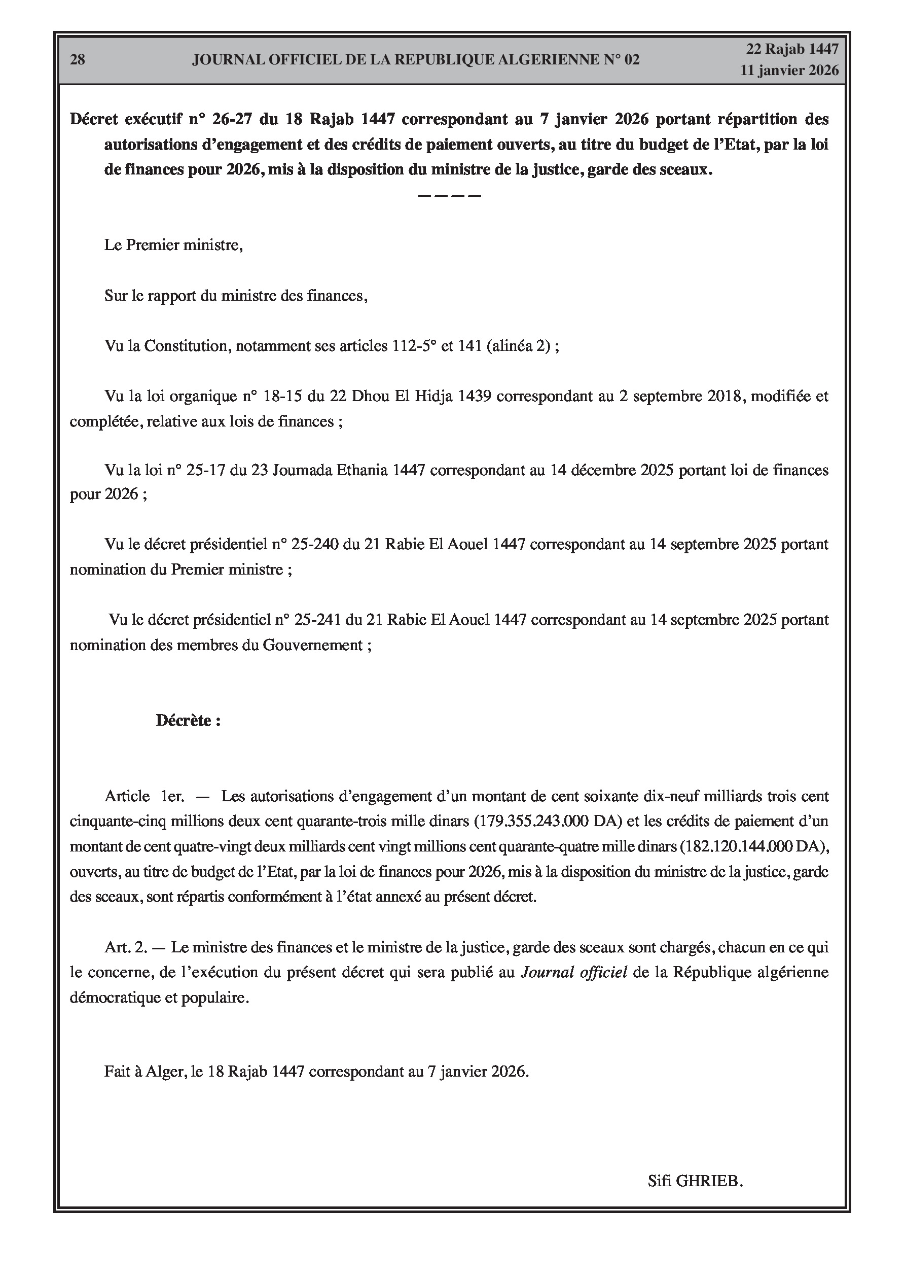 Budgets alloués aux Moudjahidine, à l'Industrie, l'Agriculture, l'Énergie et au Commerce.