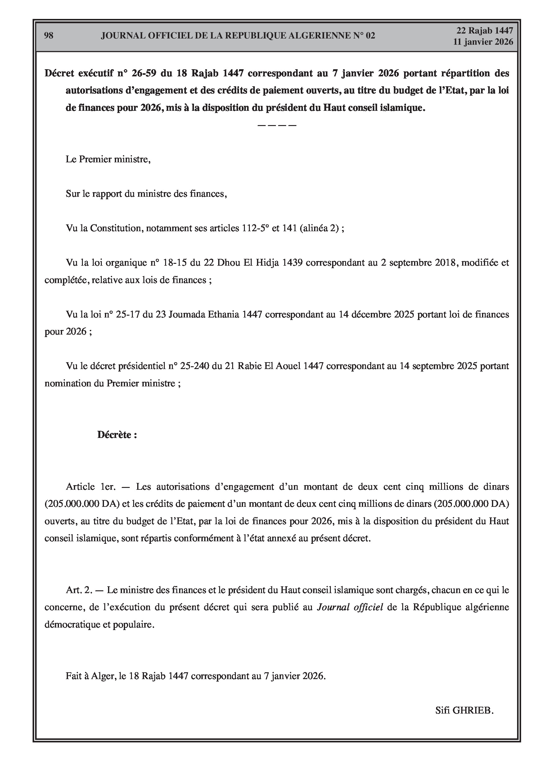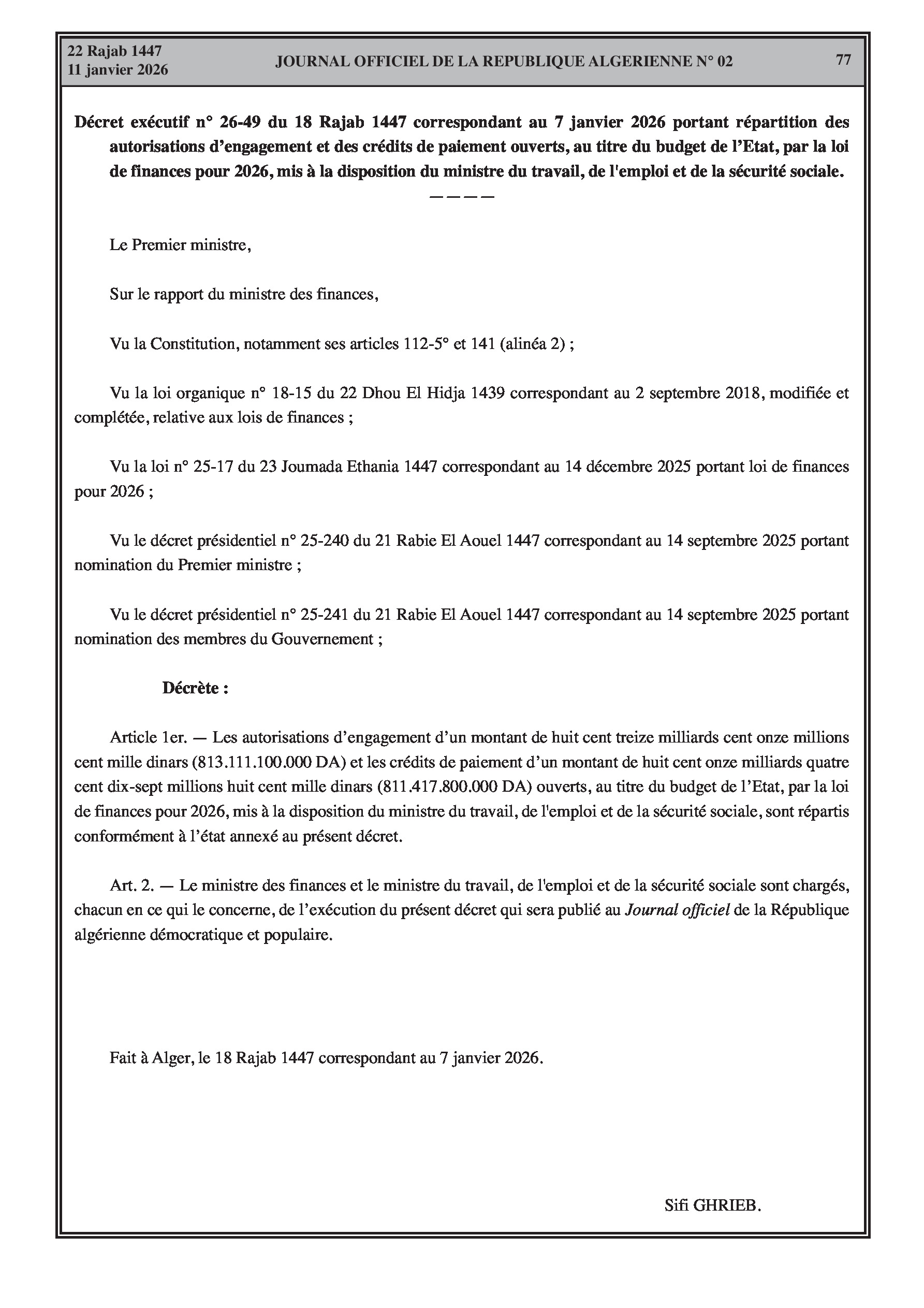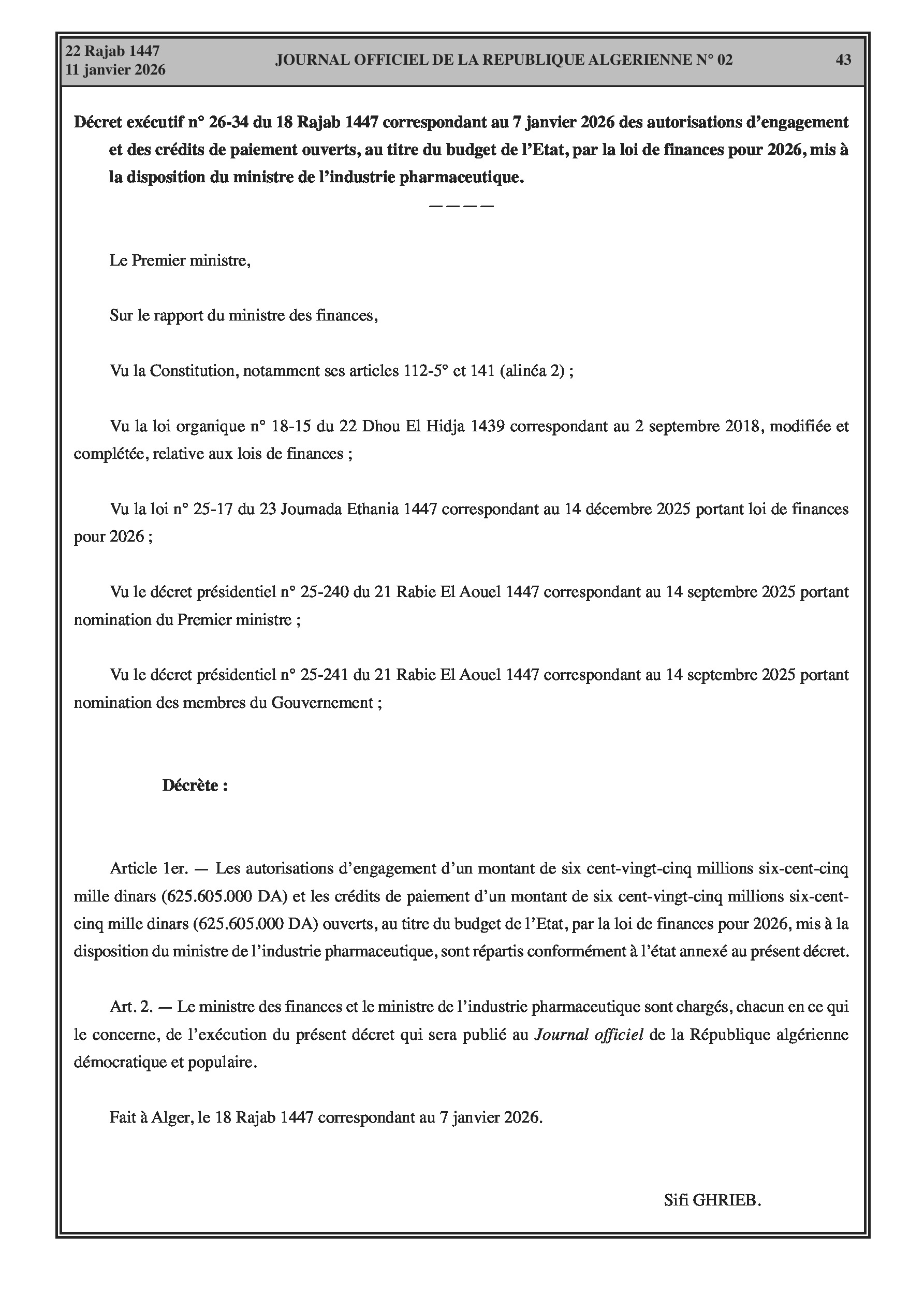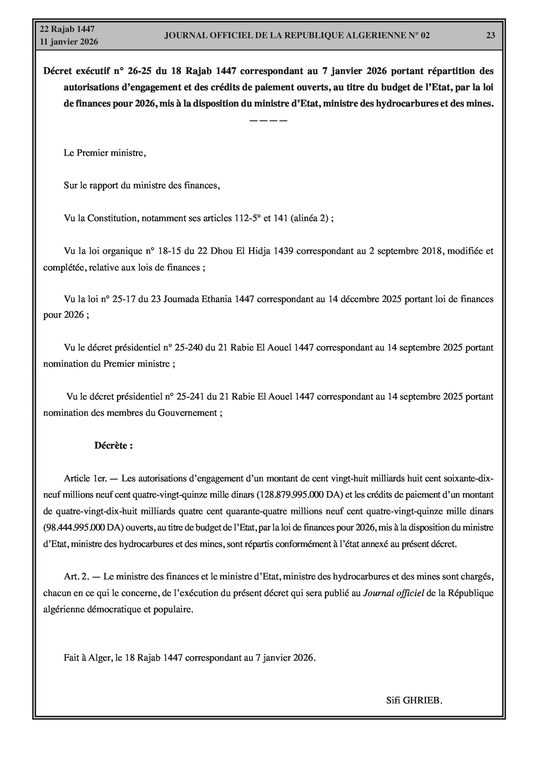 Budgets alloués aux Moudjahidine, à l'Industrie, l'Agriculture, l'Énergie et au Commerce.