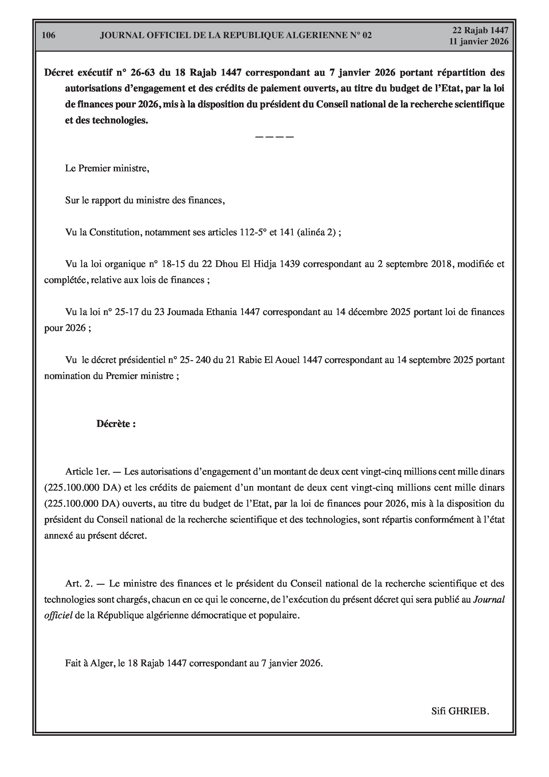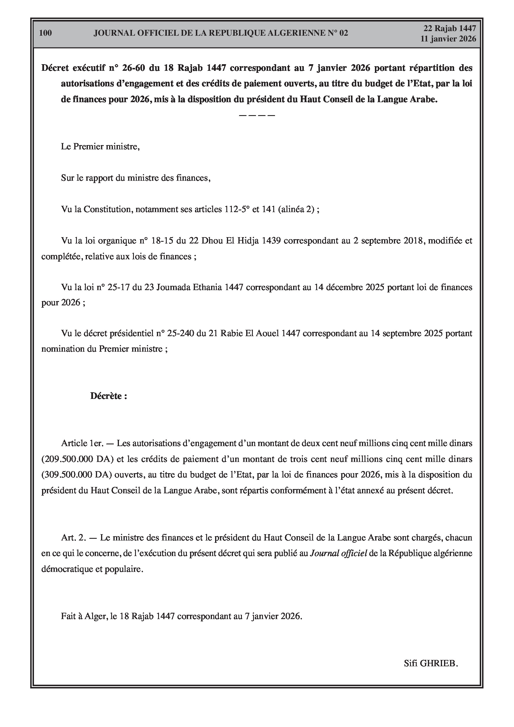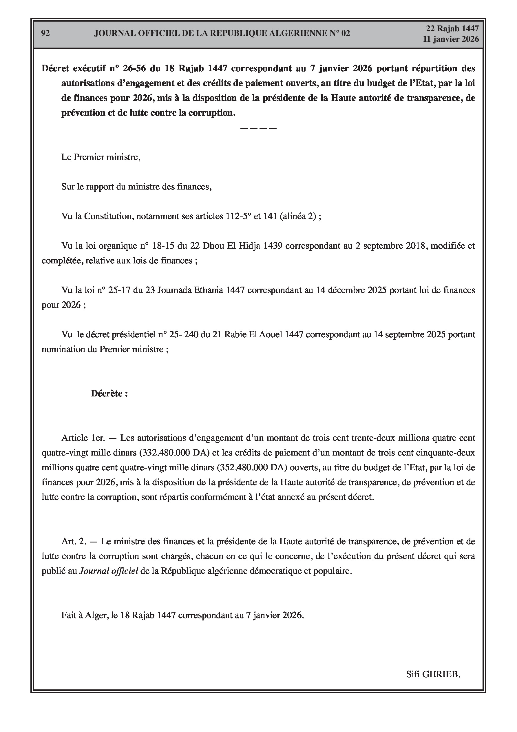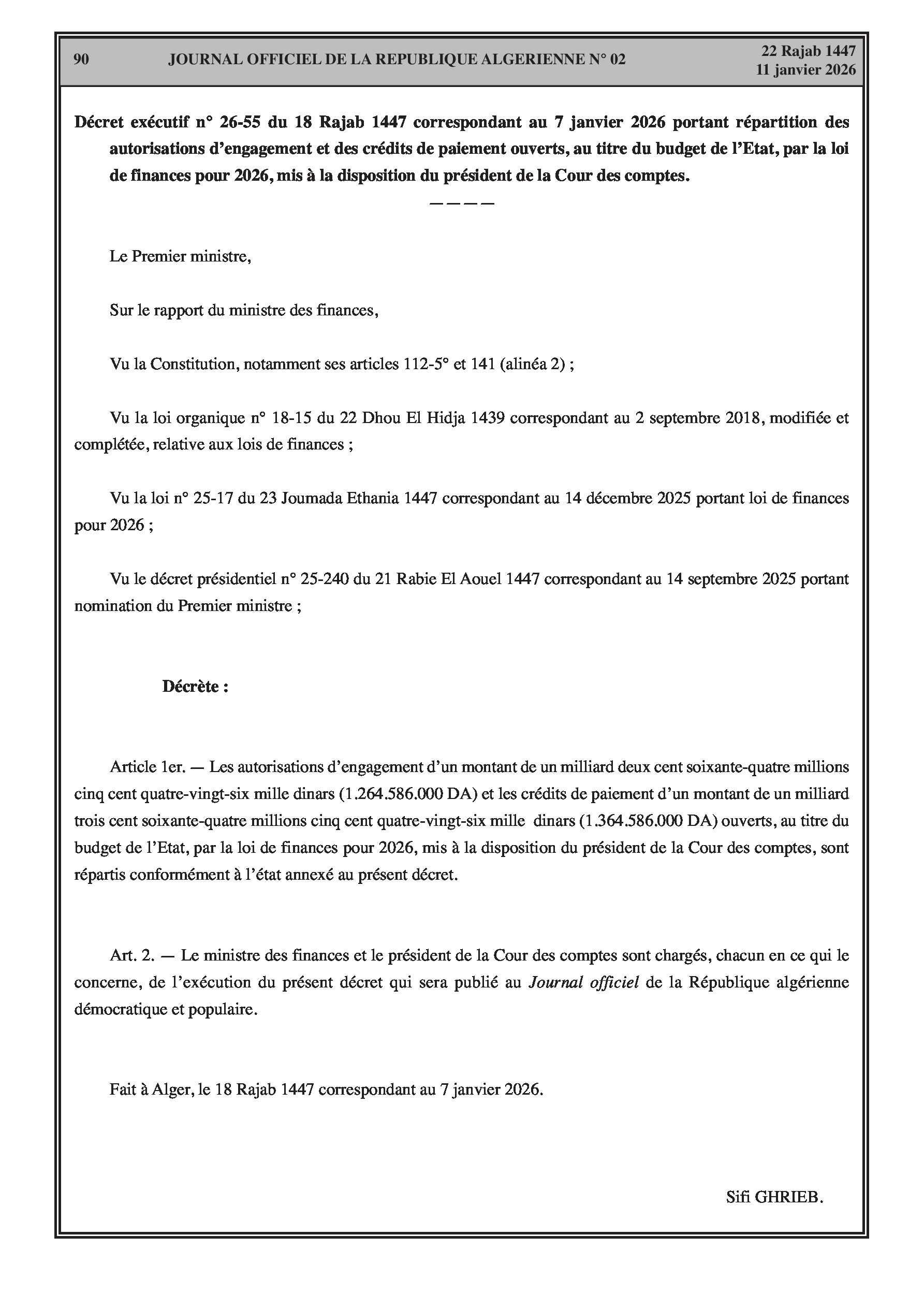Budgets alloués aux Moudjahidine, à l'Industrie, l'Agriculture, l'Énergie et au Commerce.