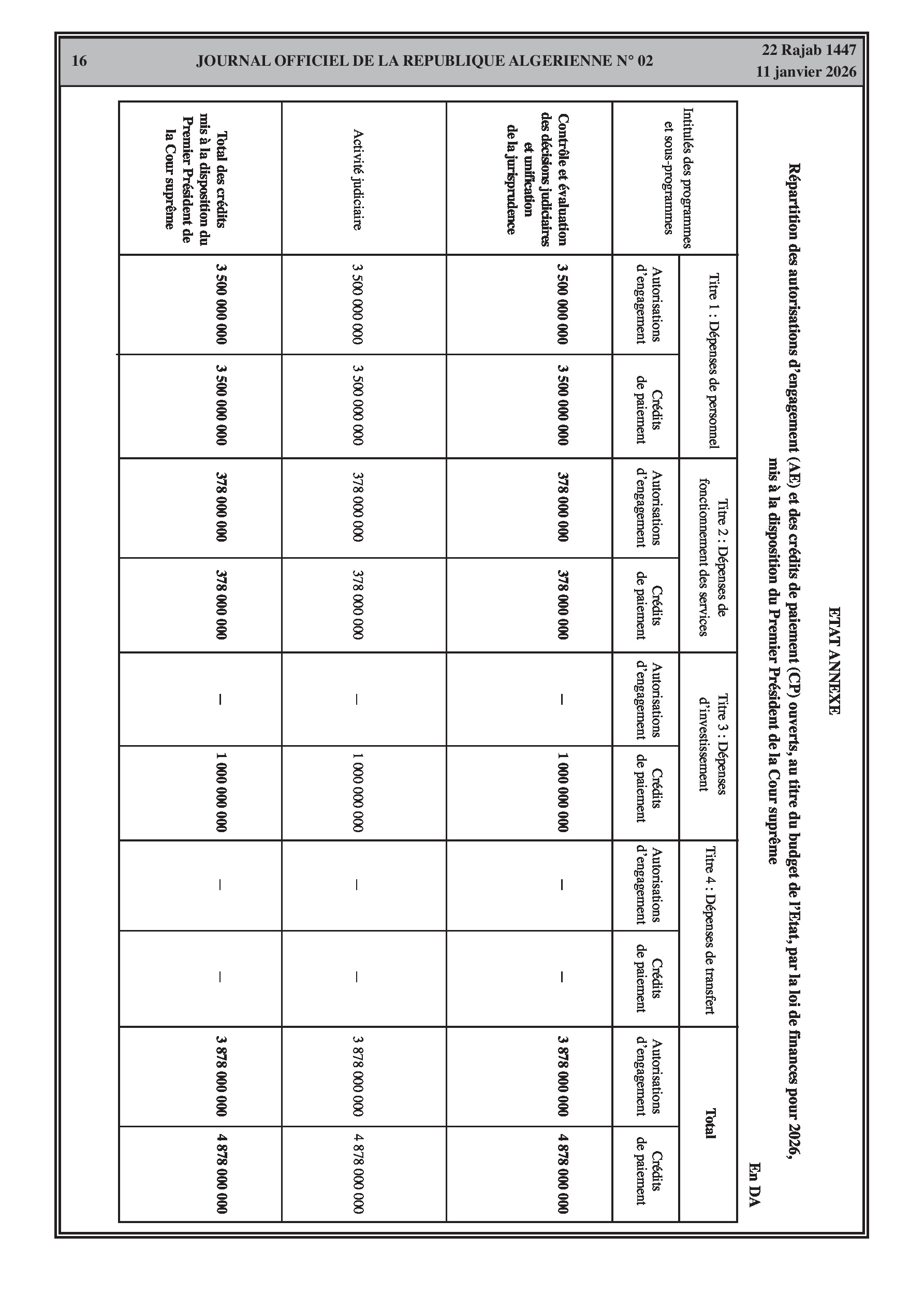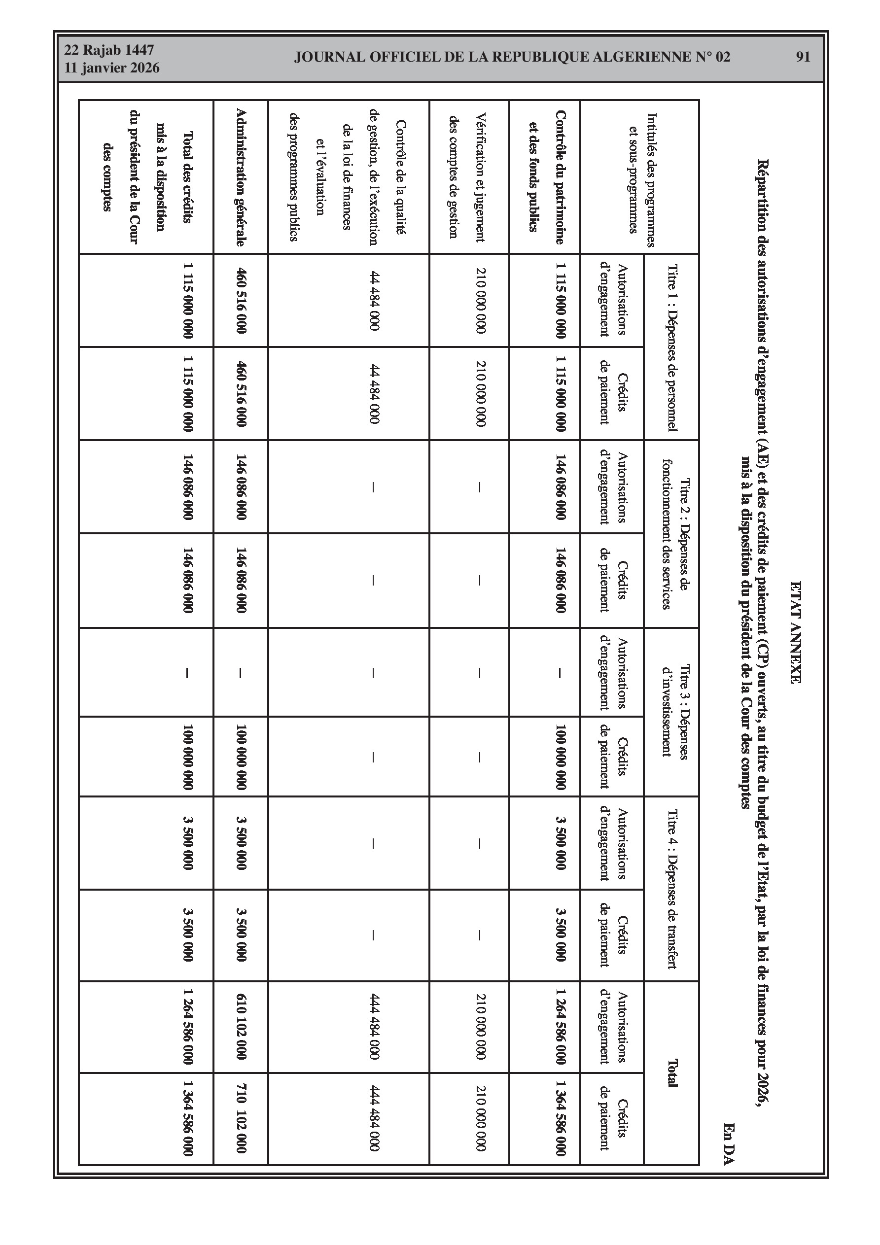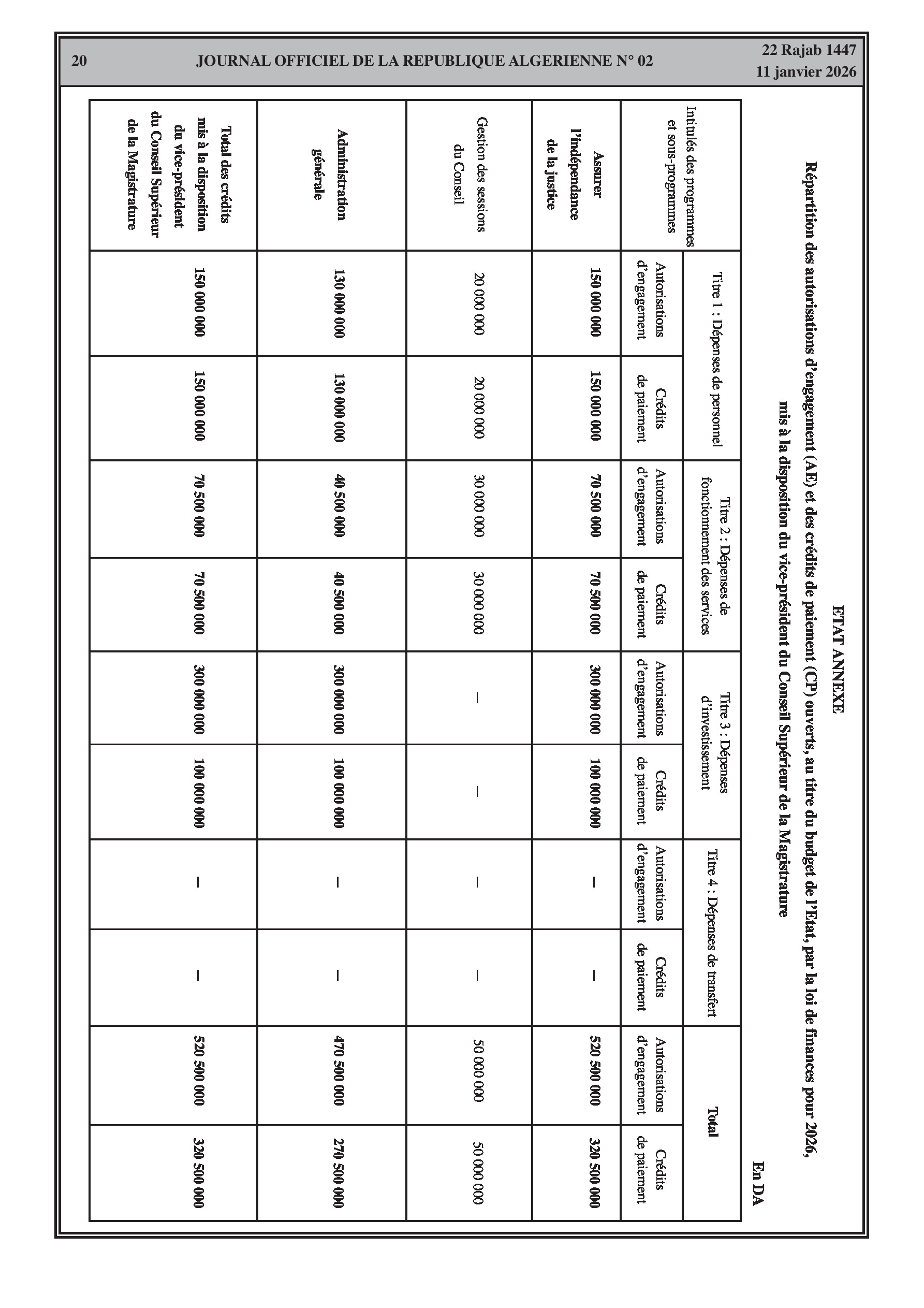 Répartition des crédits pour la Présidence, le Parlement, les juridictions, le Ministère de l'Intérieur et le Ministère de la Justice.