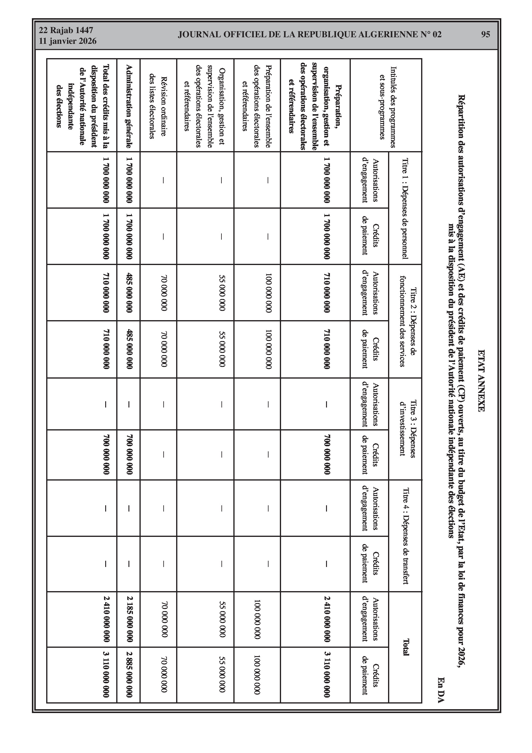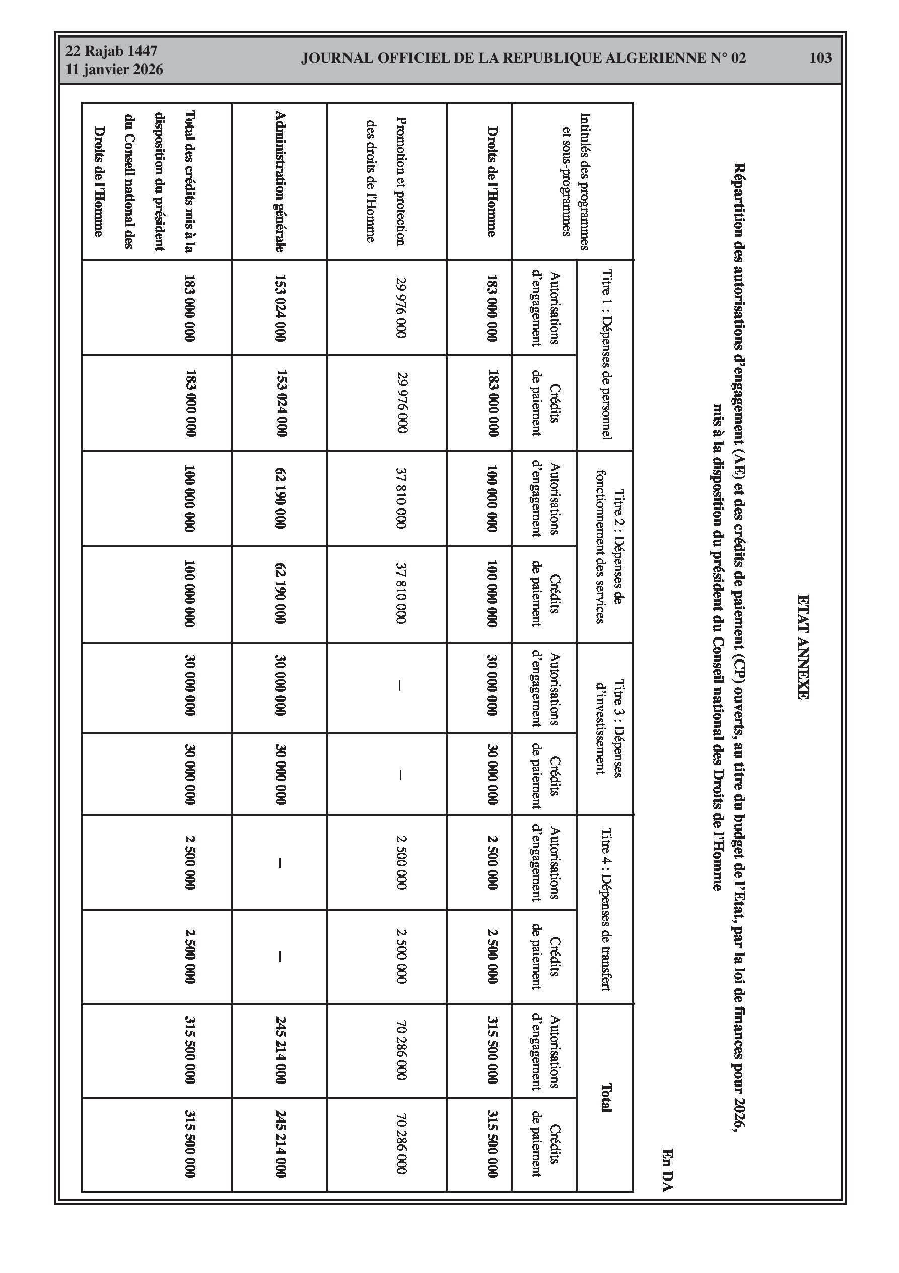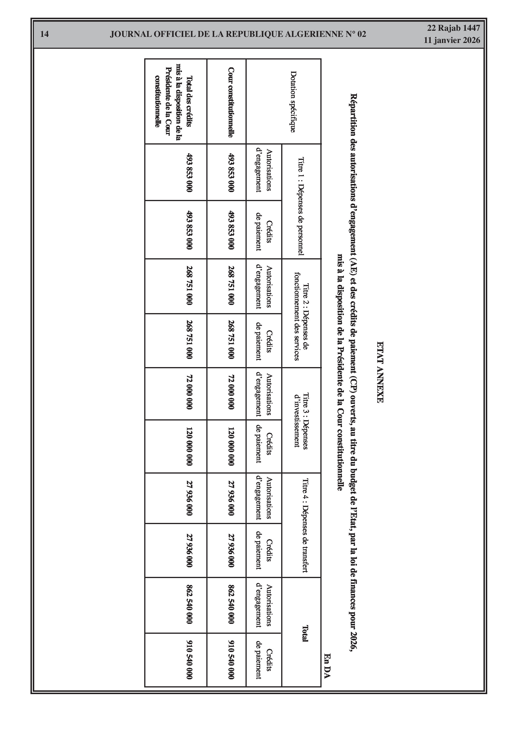 Répartition des crédits pour la Présidence, le Parlement, les juridictions, le Ministère de l'Intérieur et le Ministère de la Justice.