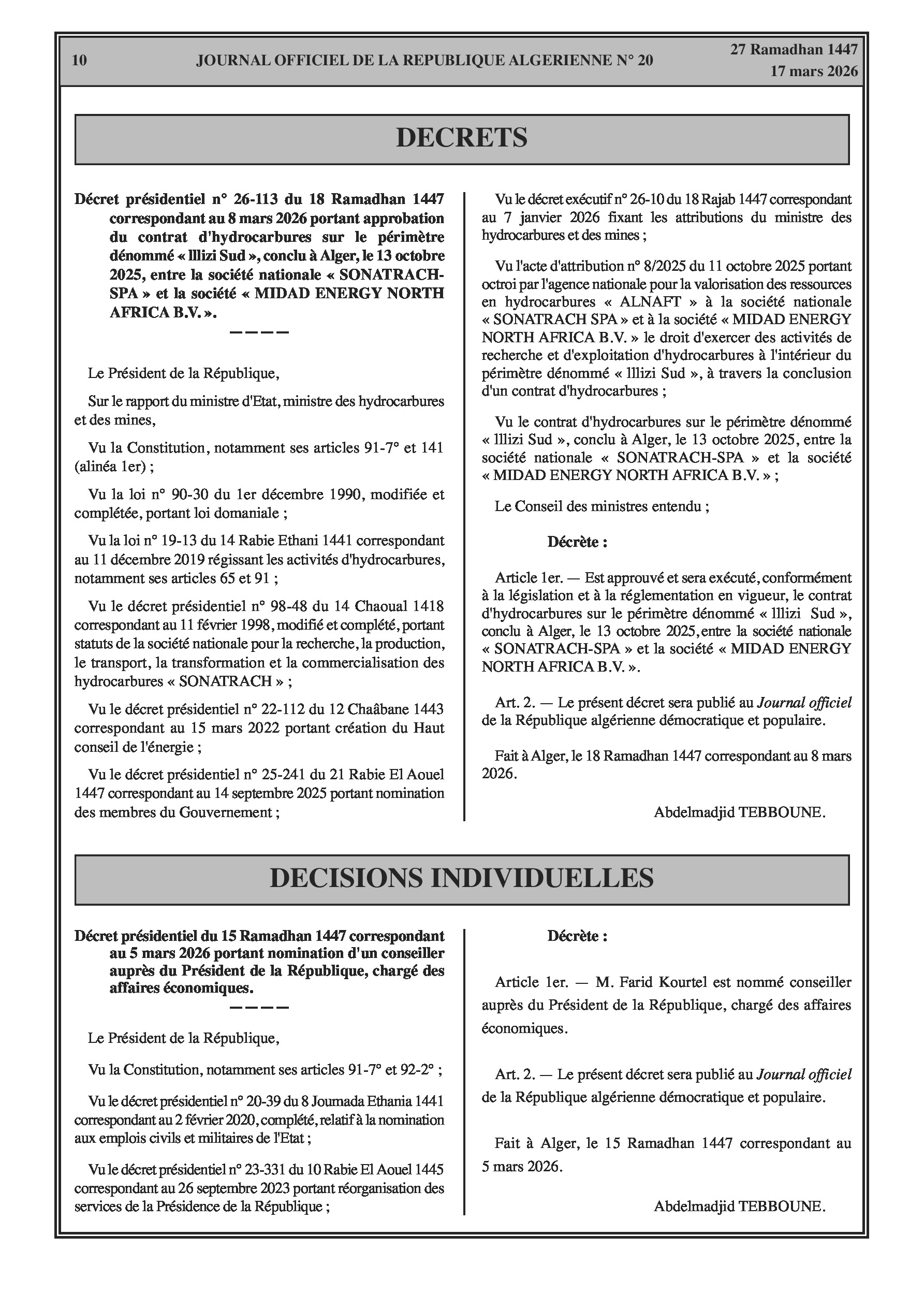 Décret présidentiel approuvant un contrat de recherche et d'exploitation d'hydrocarbures sur le périmètre Illizi Sud.
