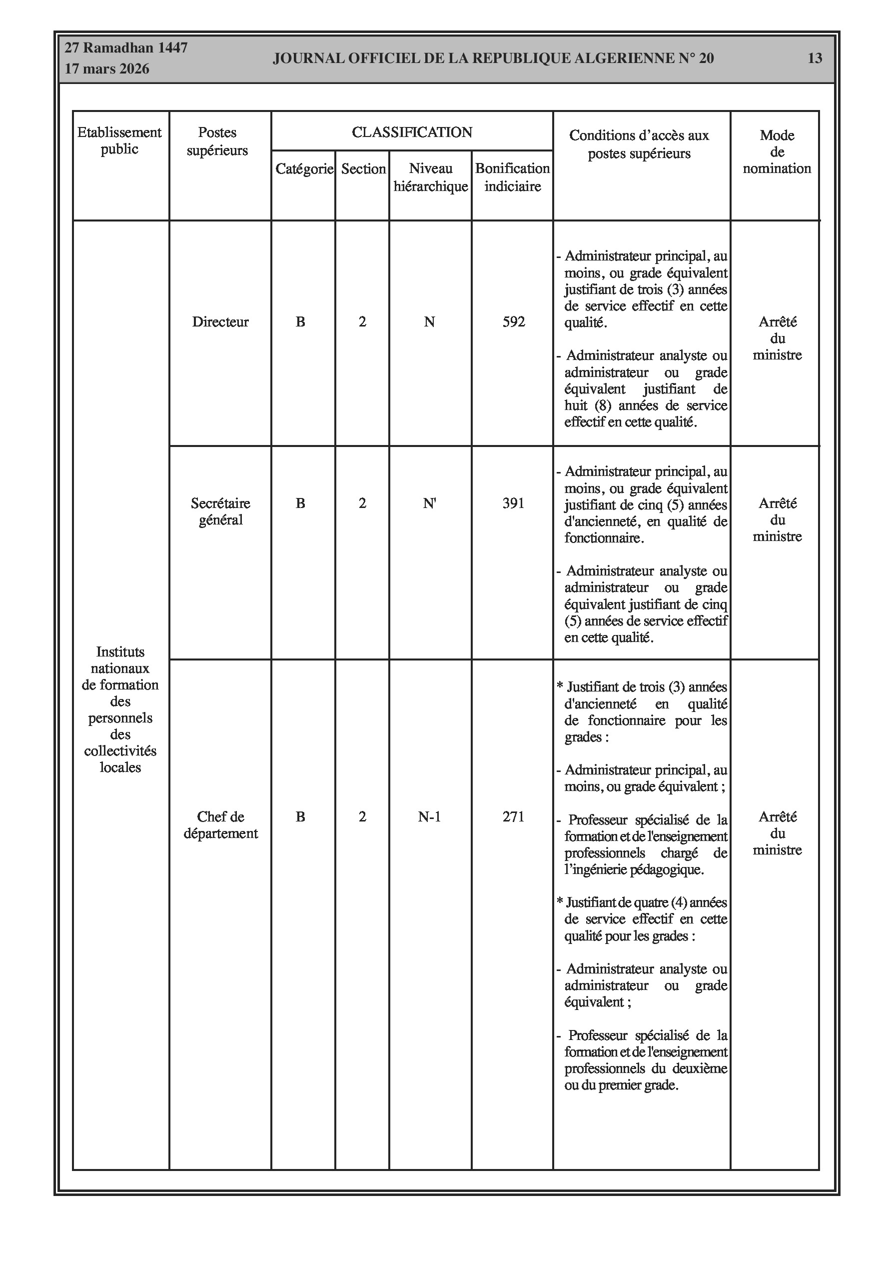 Décrets et arrêtés fixant la classification des instituts de formation, des postes de travail et les nominations aux postes de l'État.
