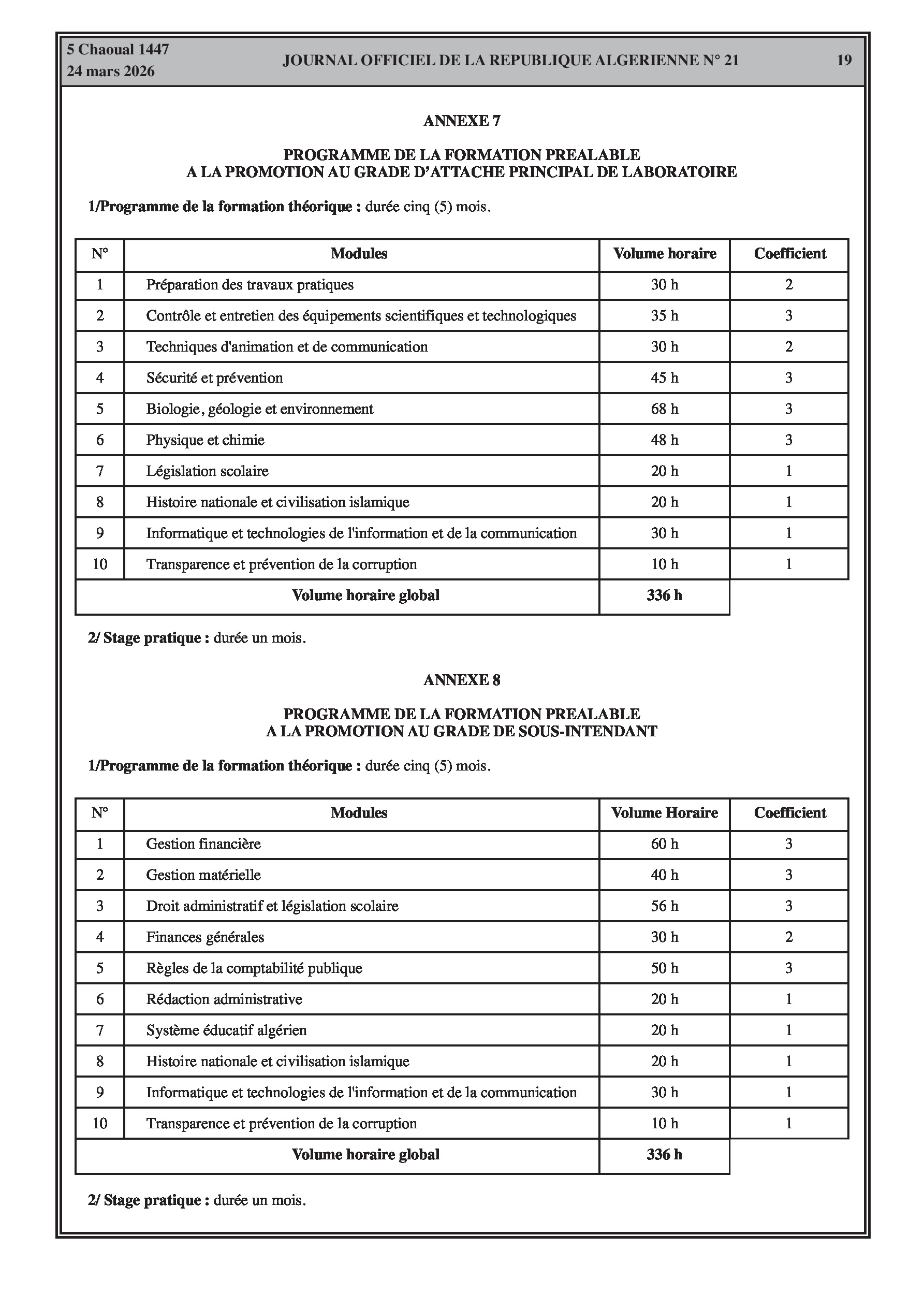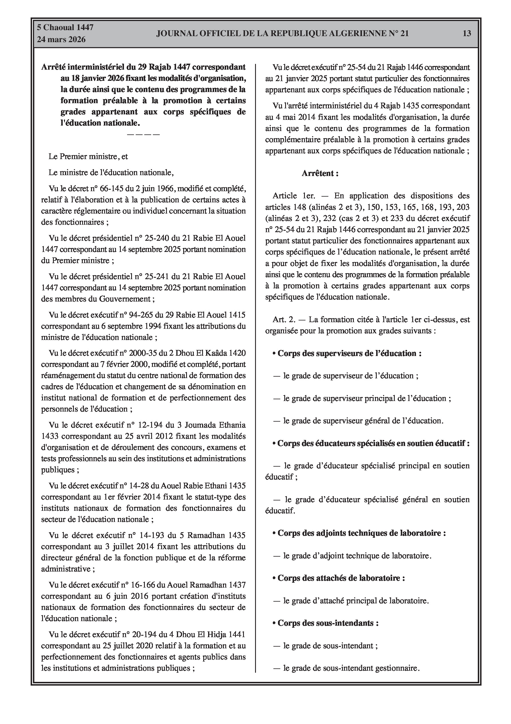 Fixation de l'organisation, de la durée et du contenu des formations spécialisées pour l'accès et la promotion aux grades de l'éducation (enseignants, superviseurs, intendants, laborantins). Modification des effectifs et contrats des agents d'entretien.