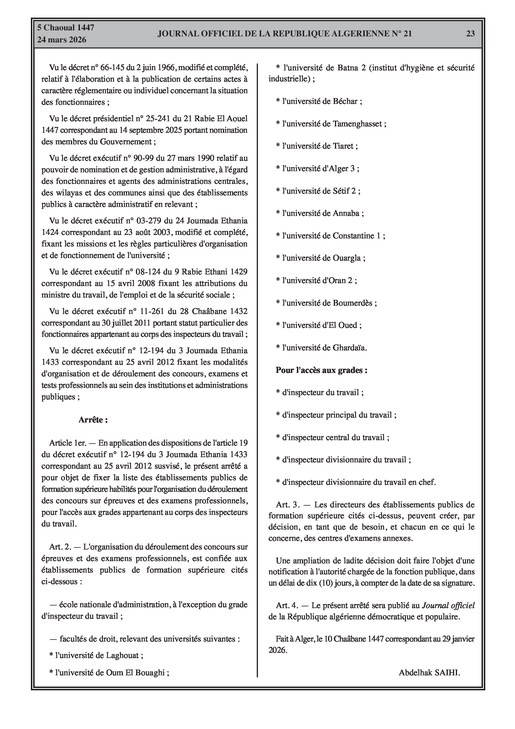 Liste des établissements habilités à organiser les concours pour les grades d'inspecteurs du travail.